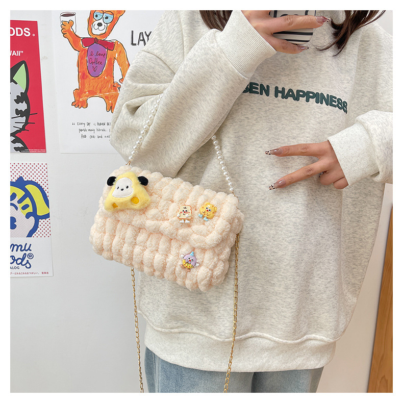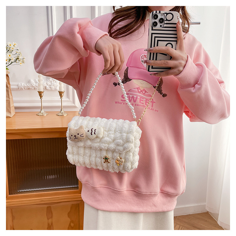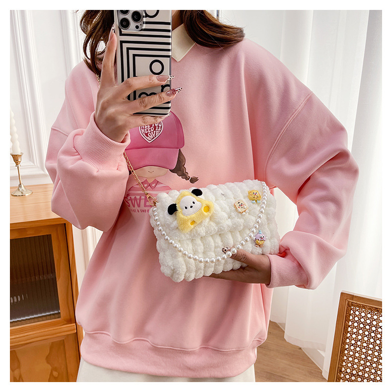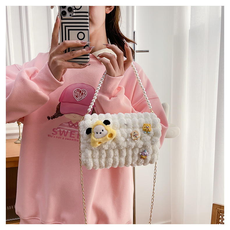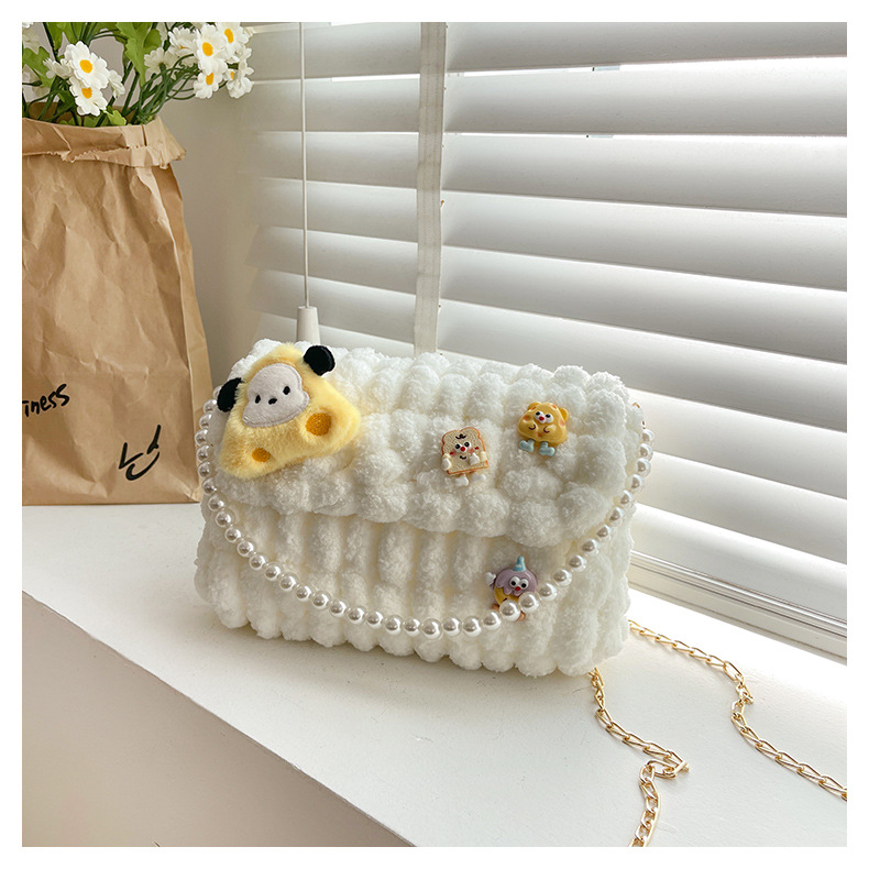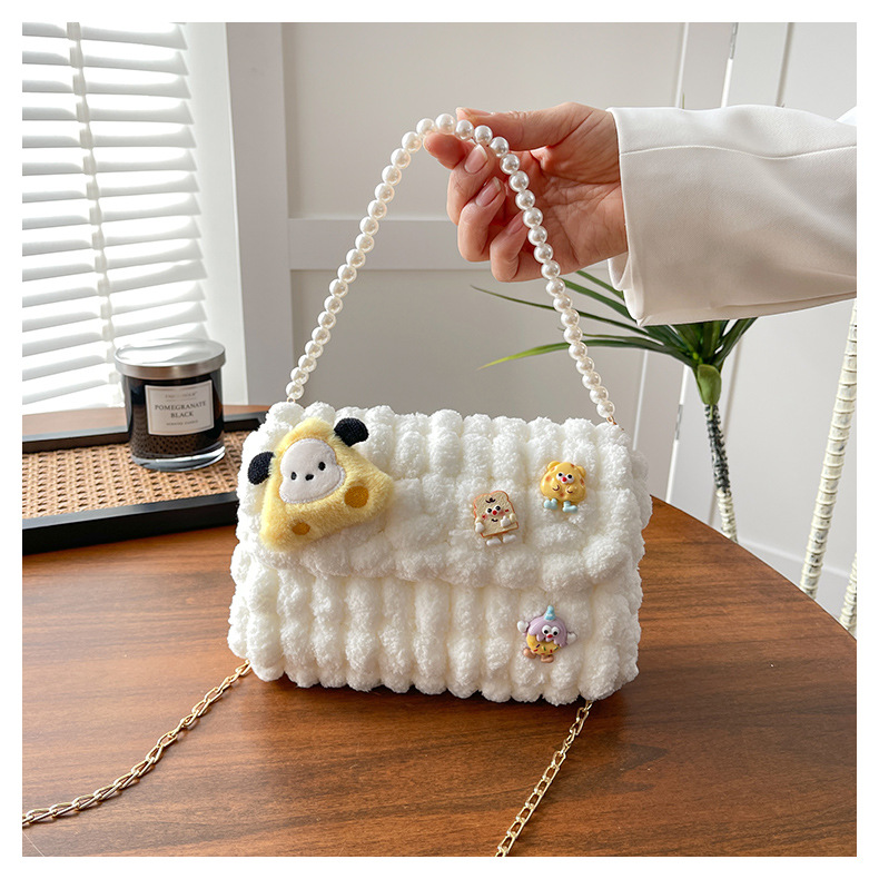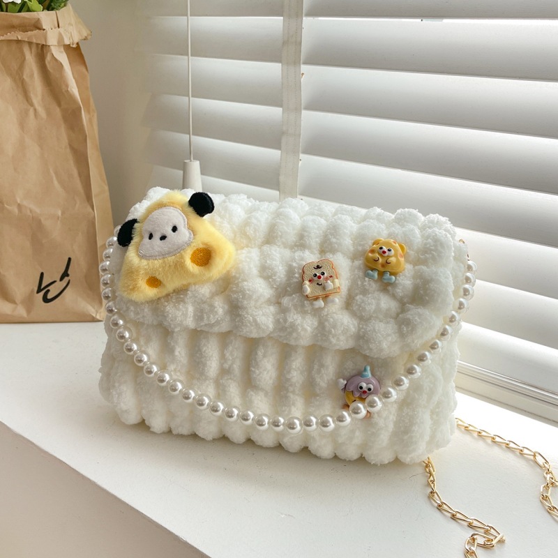 • 화이트 [치즈 강아지] 소재 팩 + 체인 + 진주 핸드백