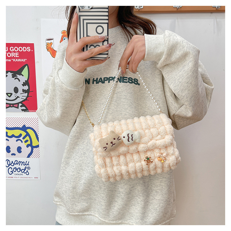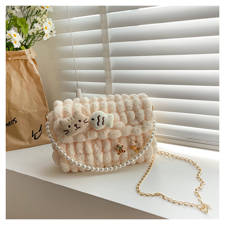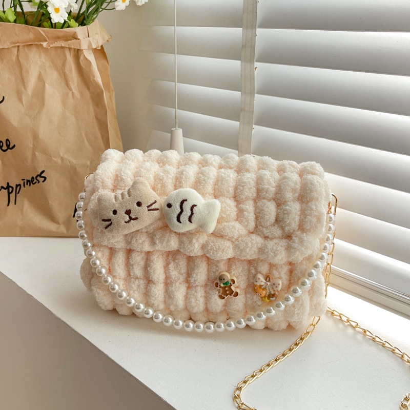 • 밀키 살구색 [고양이 물고기] 소재 팩 + 체인 + 진주 핸드백