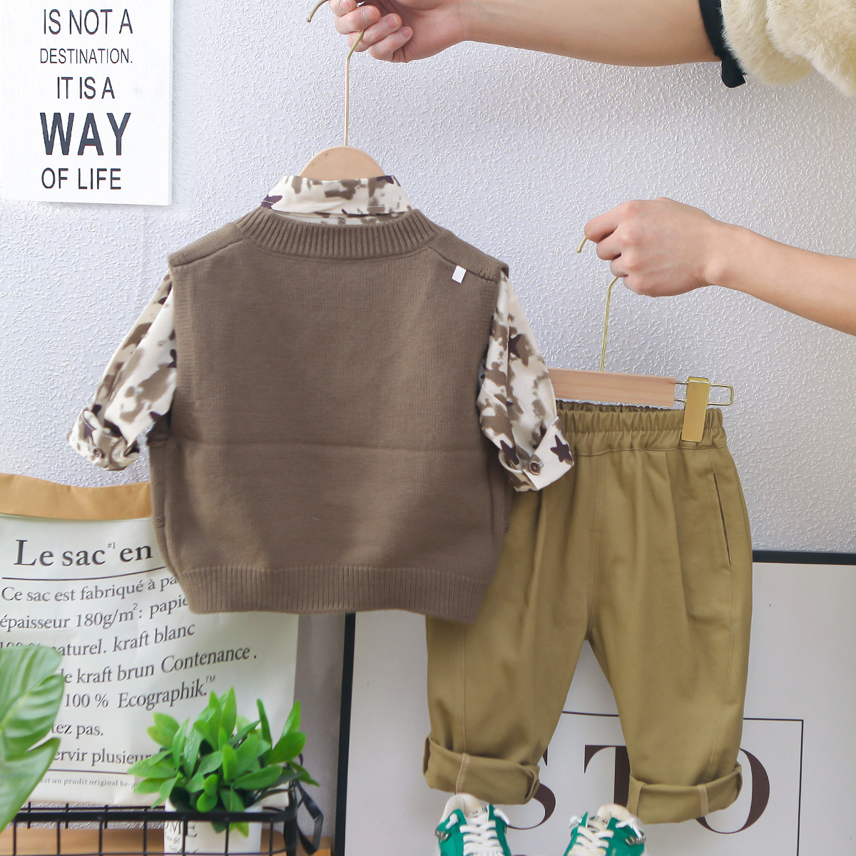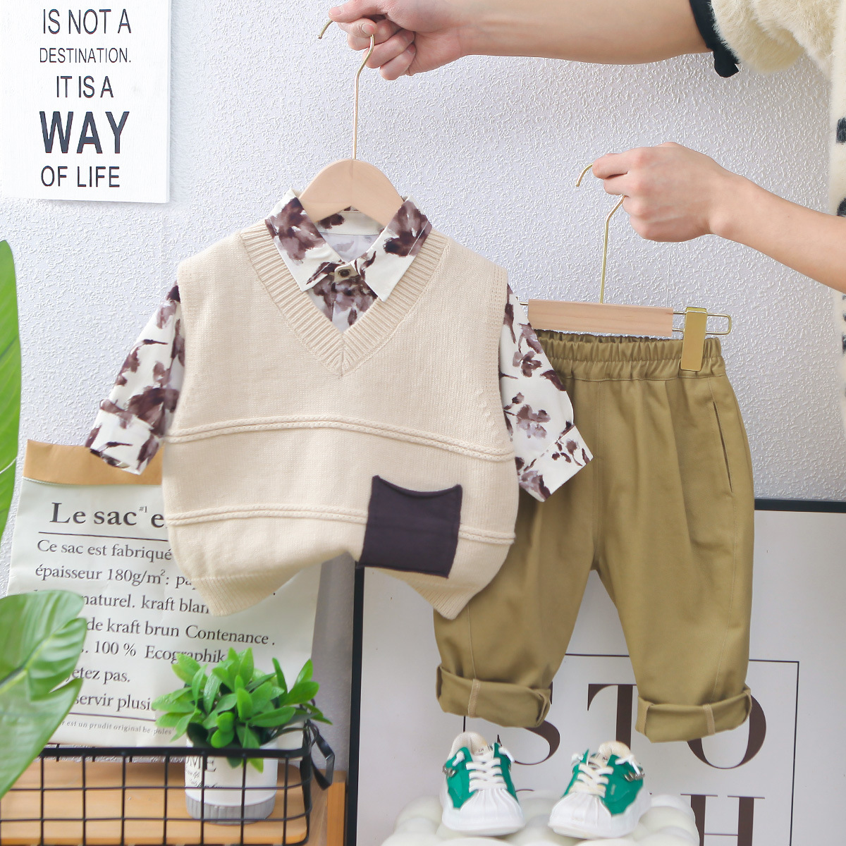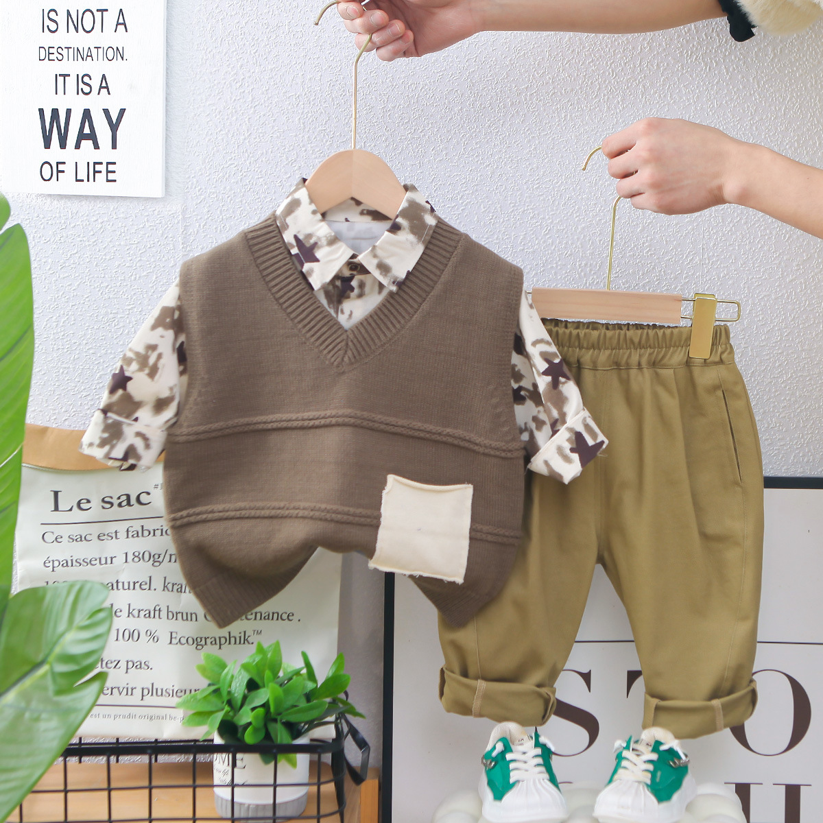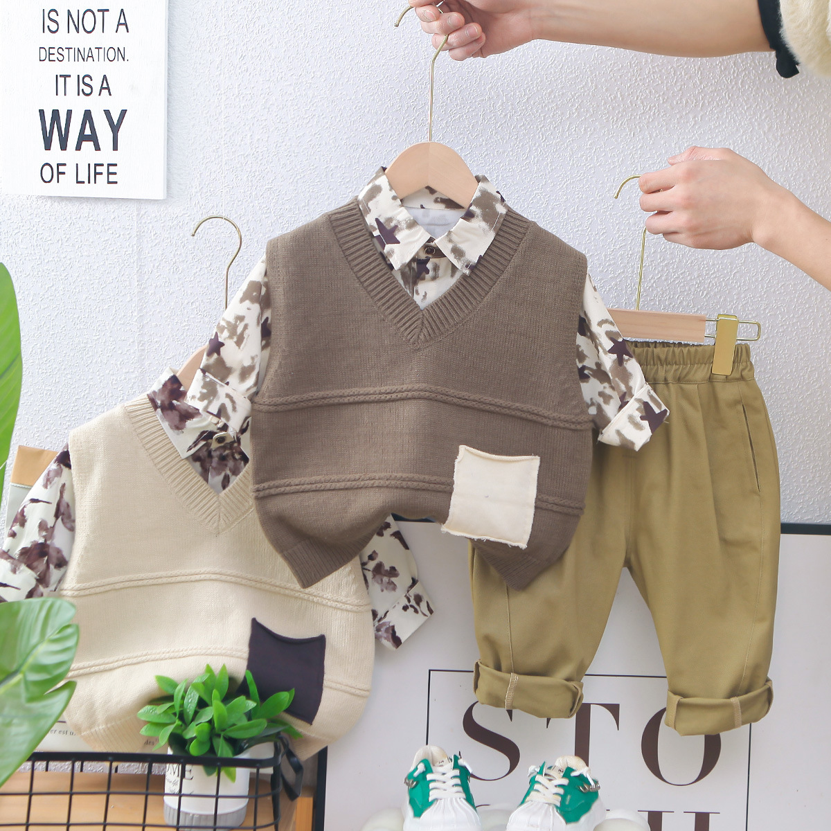 남아의 봄 착용 세트 2025 새로운 어린이 스웨터 조끼 어린이 봄과 가을 아기의 서양식 셔츠 3 종 세트스토어 가기