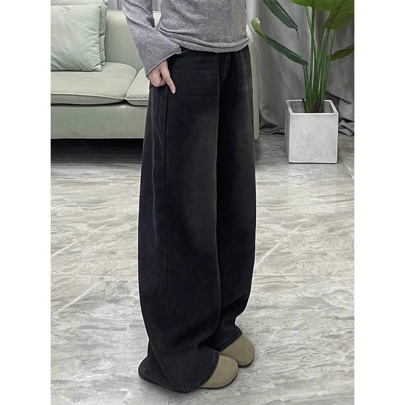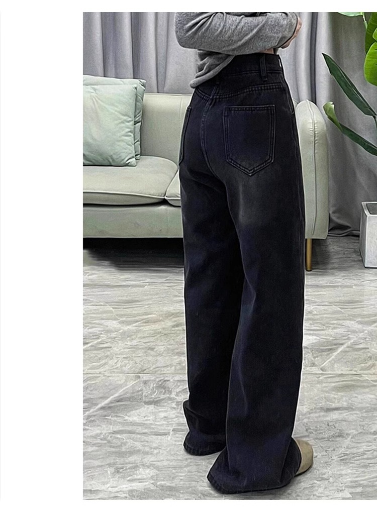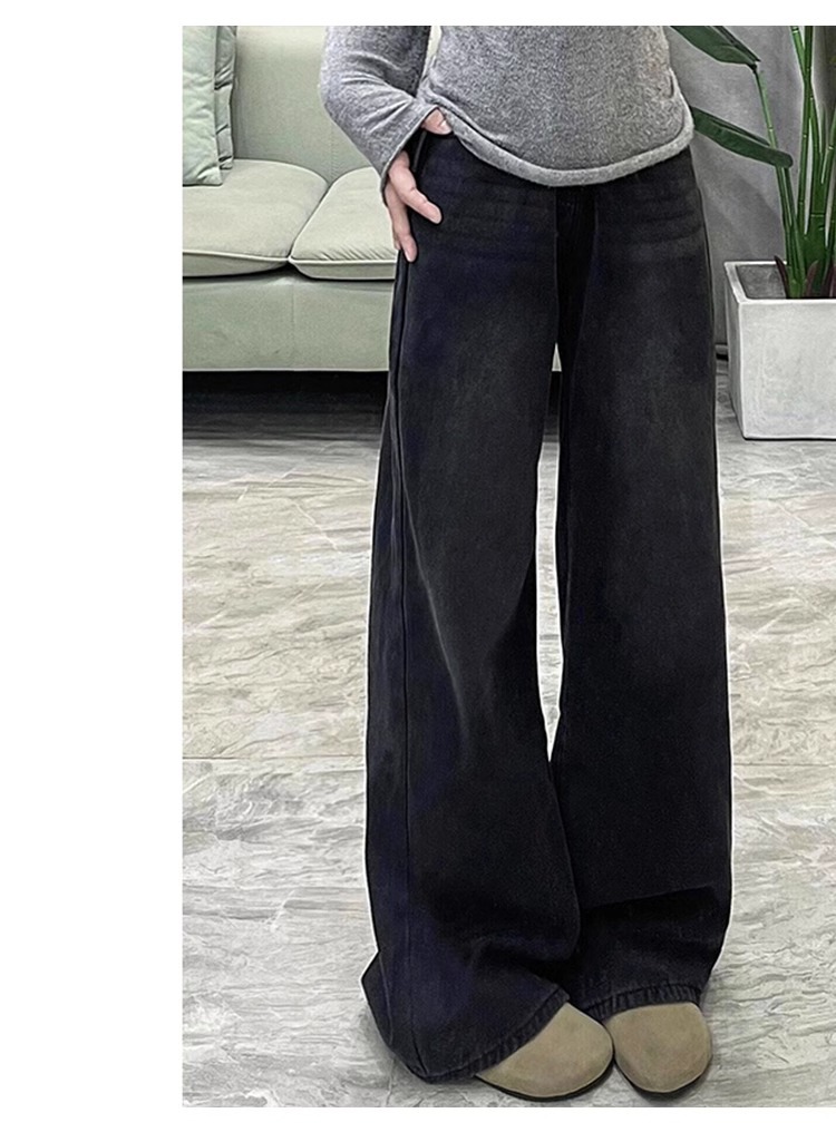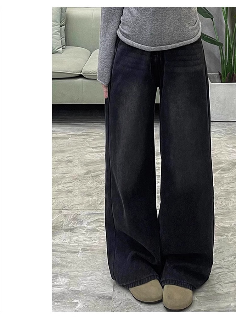 검은 회색 넓은 다리 청바지 여성의 가을과 겨울 기모 느슨한 플러스 사이즈 통통녀 슬리밍 배 모양의 그림 스트레이트 바지스토어 가기
