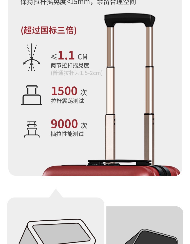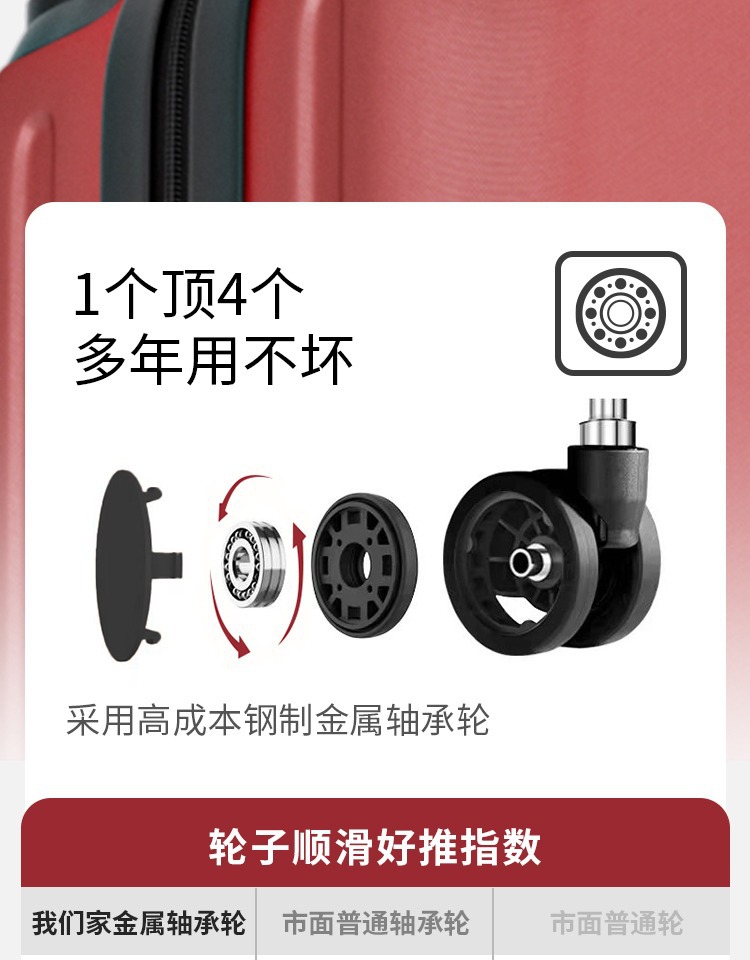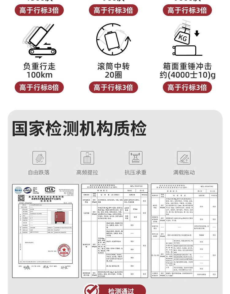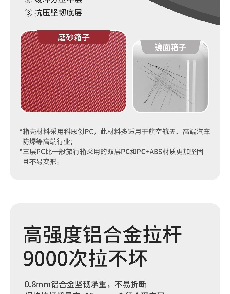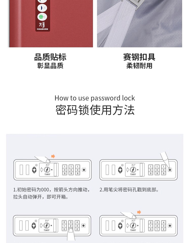2、我们承诺质量问题:①不满意可以退换 ②买就送(送贴纸两种、箱套一个、一次性压缩毛巾一个、香袋一个。)③凡在我们店买的箱包有质量问题关注了我们即可享受保修1年 ④产品质量:箱体由纯PC航空材料制作,材质特征承载力强(箱体能承受150-180斤),韧性强(箱体凹陷迅速恢复不起白痕),箱子整体轻便,耐用!加上静音轮子更顺滑更舒心【温馨提示】本店宝贝在出仓库前都会经过三道质检才会发出,所以不会有质量问题出库。