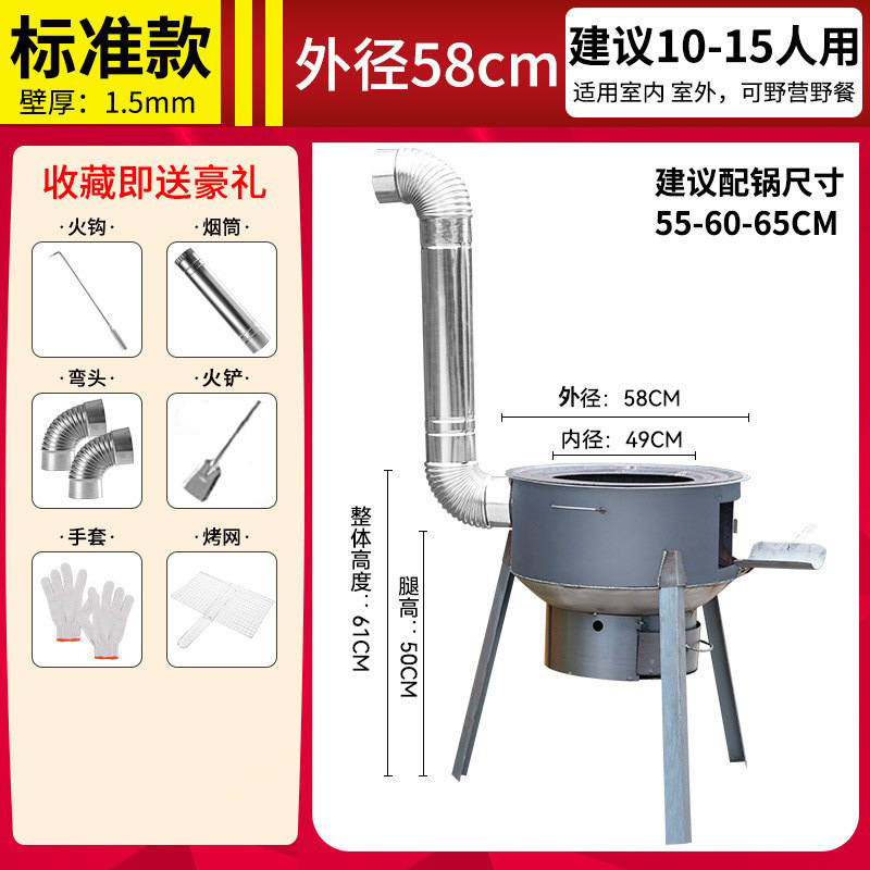 • 직경 58CM의 두꺼운 스토브 + 스토브 링 3개와 굴뚝 선물 팩 - 일체형 조립 장작 난로 [강판]