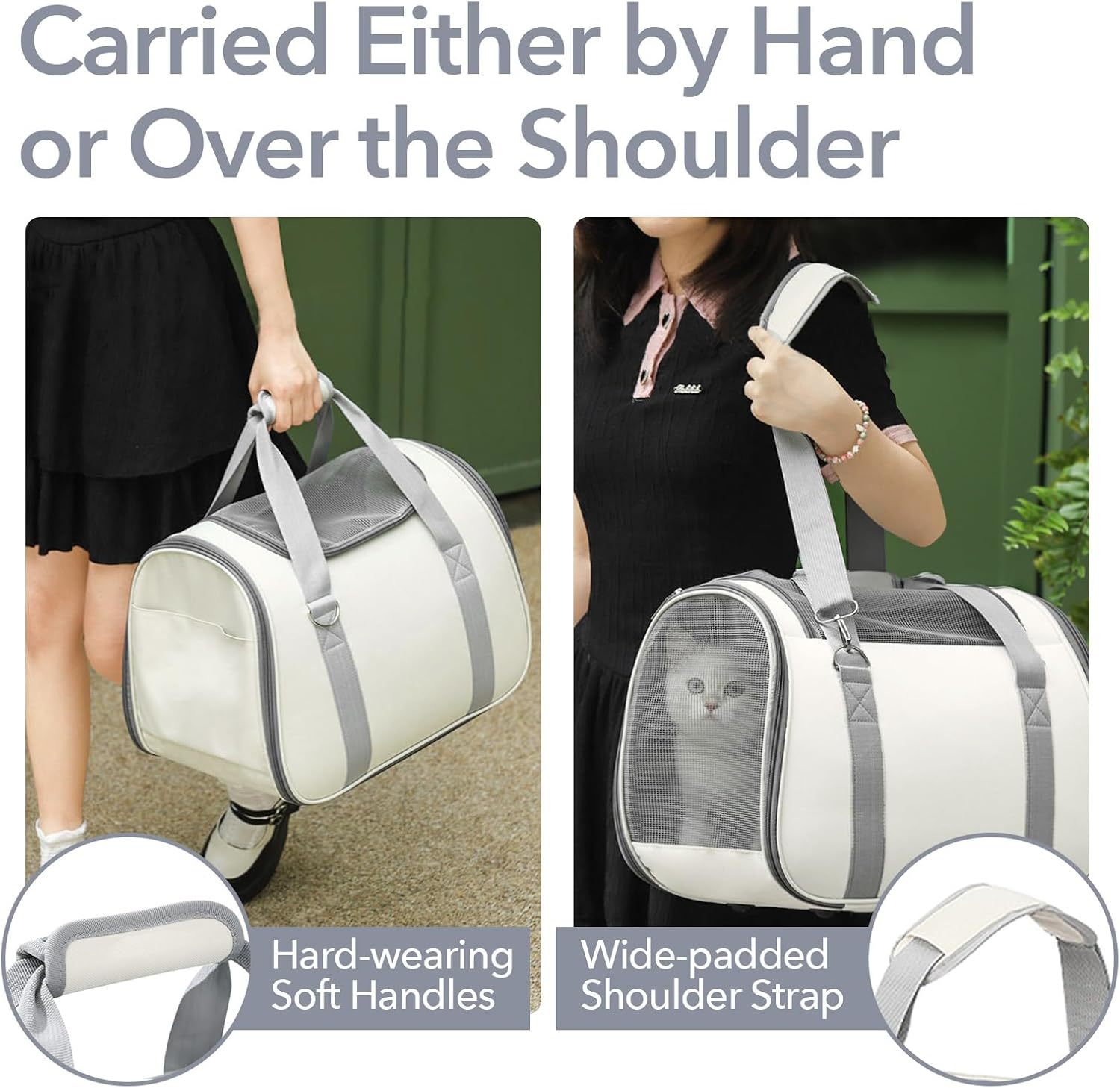 携带舒适:这款宠物手提袋配有可调节的宽软垫肩带和加厚的提手,便于携带,舒适。