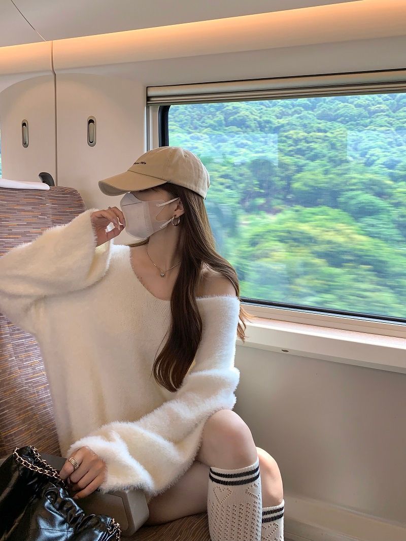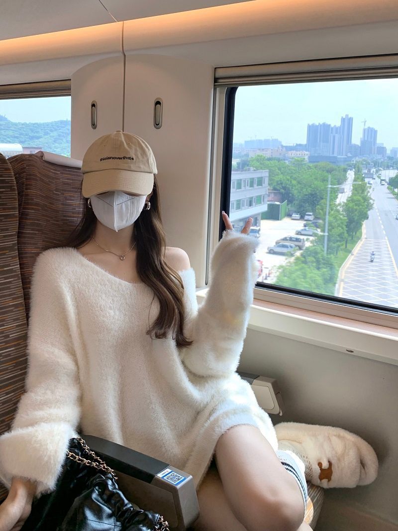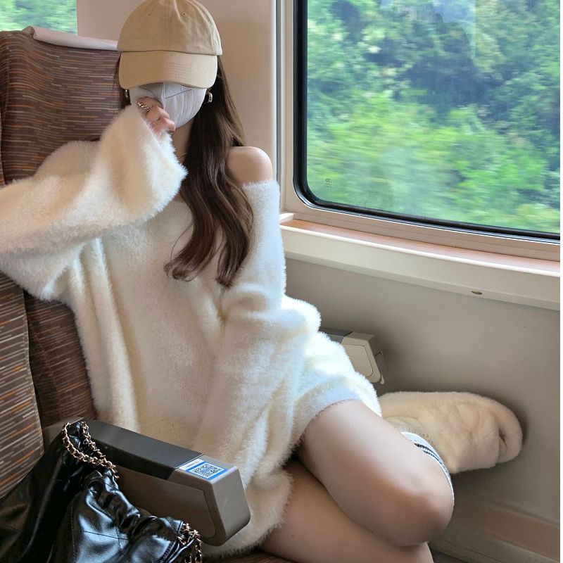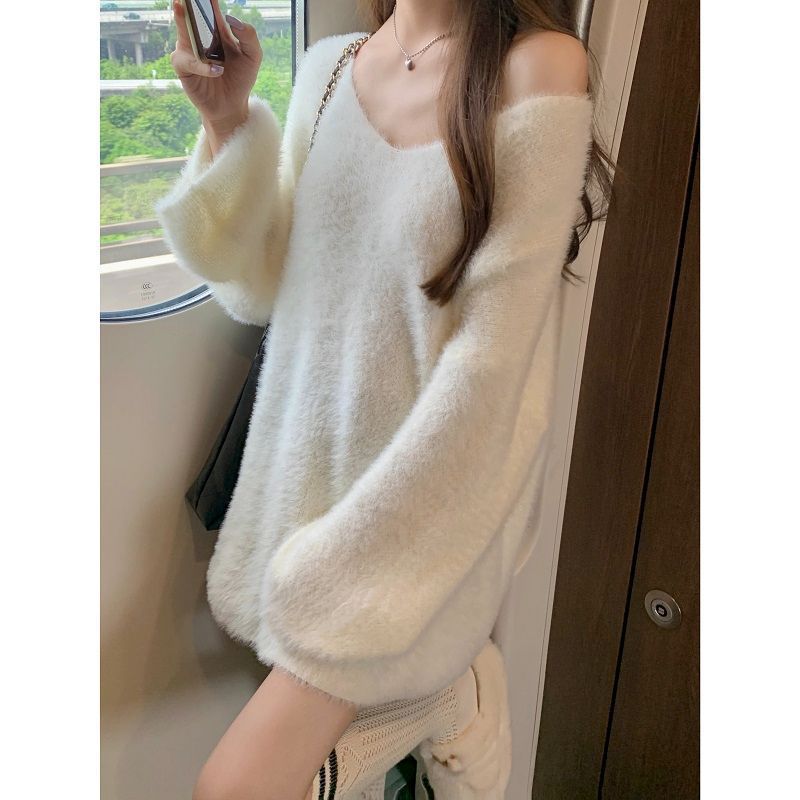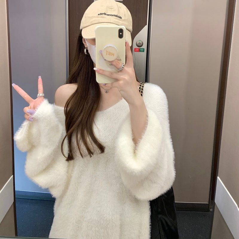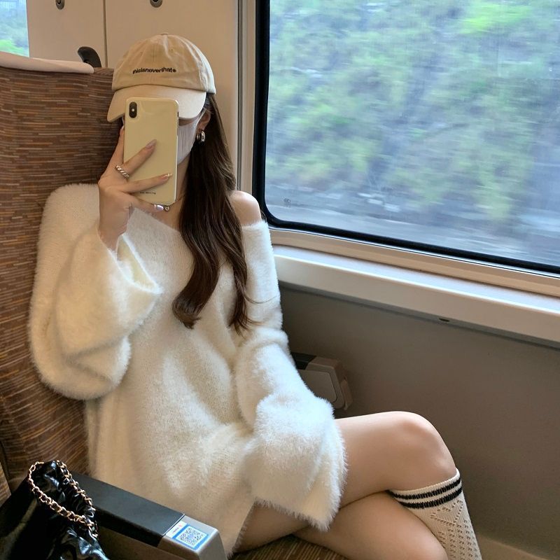 2024 화이트 오프 숄더 긴팔 스웨터 여성의 가을 소프트 왁스 스웨터 중간 길이 게으른 루즈 탑 트렌디스토어 가기