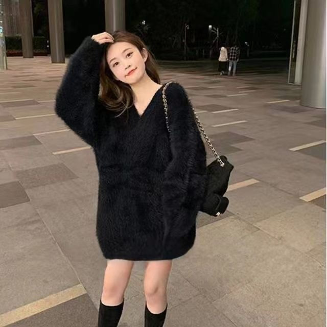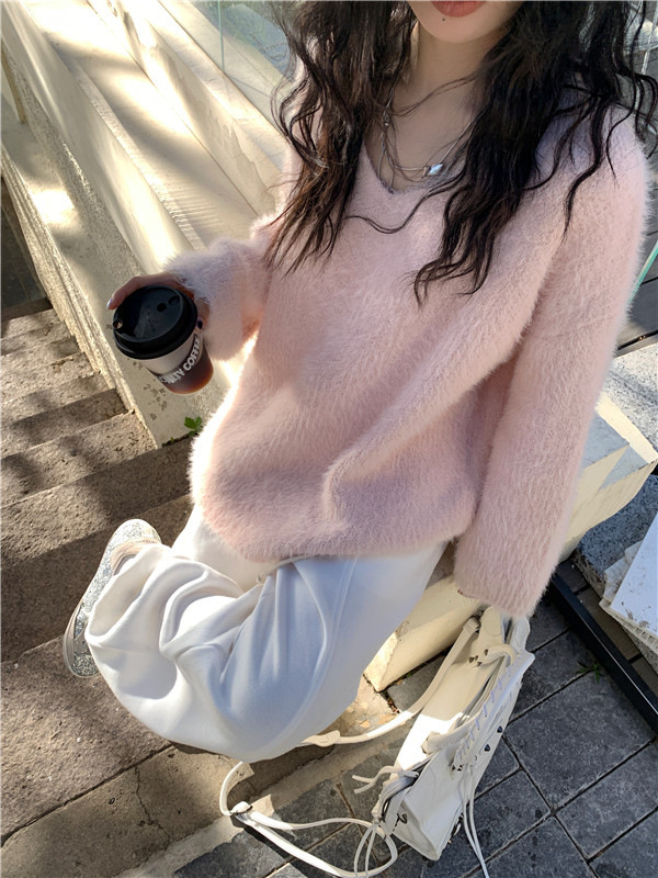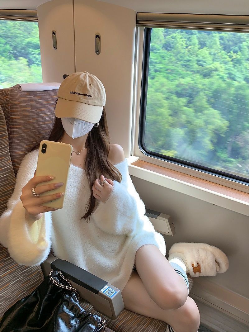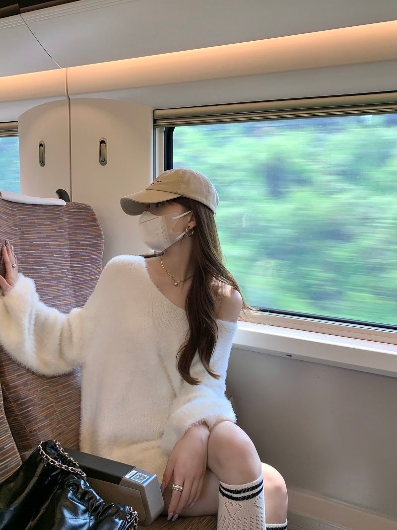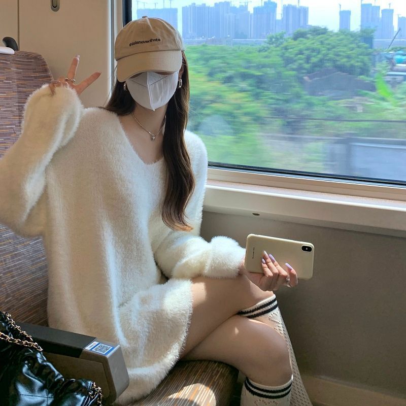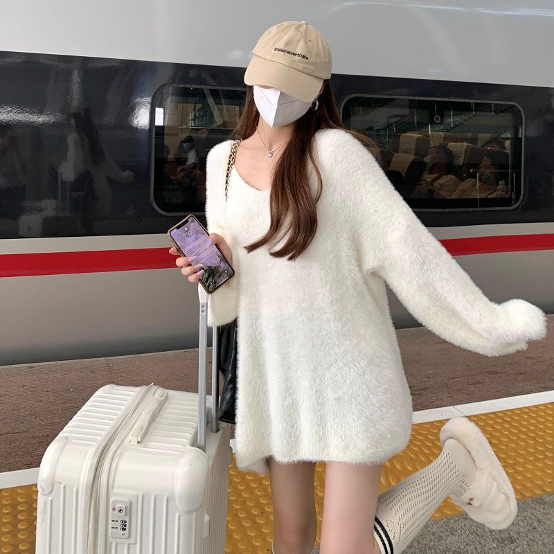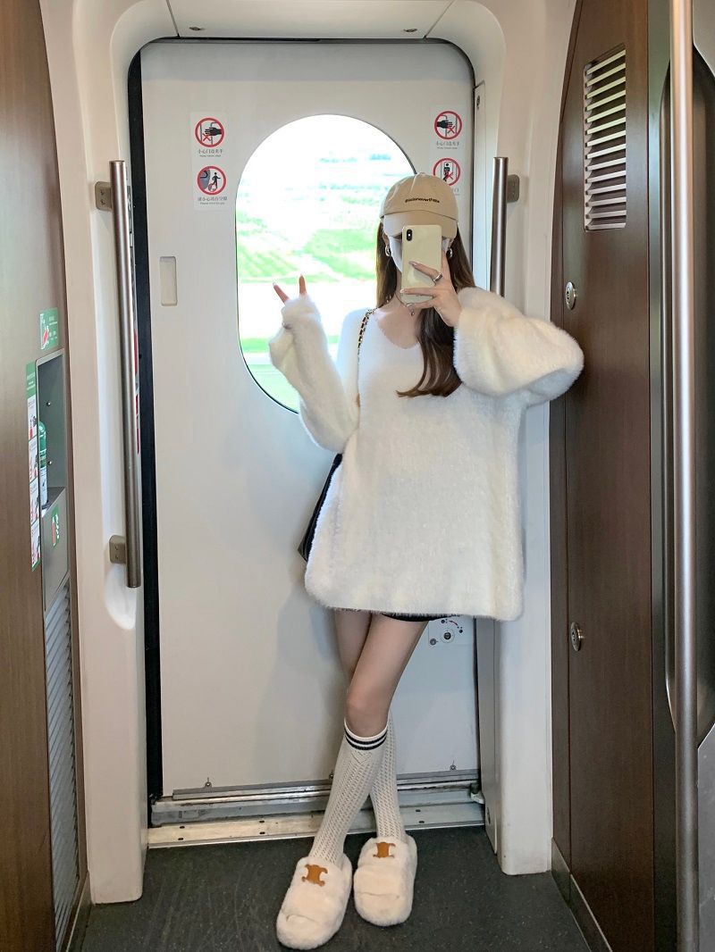 2024 화이트 오프 숄더 긴팔 스웨터 여성의 가을 소프트 왁스 스웨터 중간 길이 게으른 루즈 탑 트렌디스토어 가기