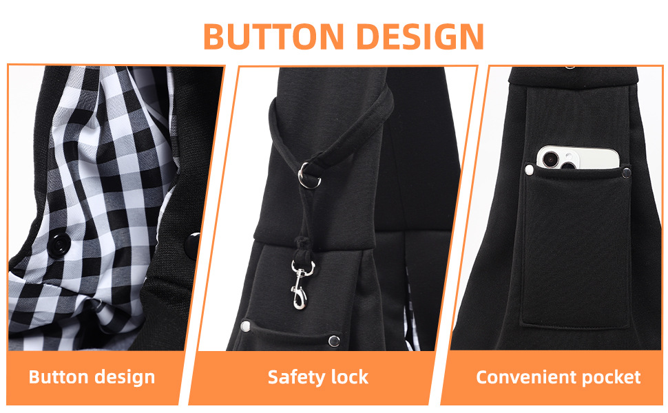 【安全设计】:狗包有双重安全装置,可调节的安全钩可以固定在狗的项圈或安全带上,以防止狗意外脱落。小狗吊带架的开口有一个安全扣,以防止小狗意外跳出。