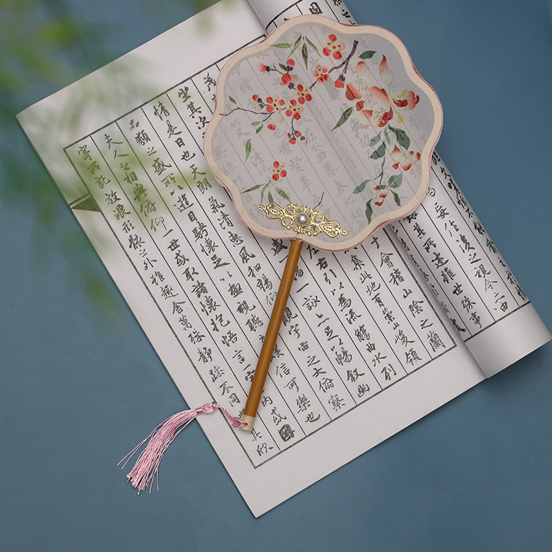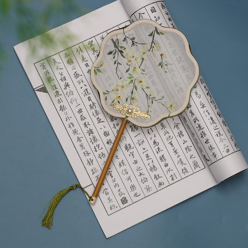 실크 라운드 팬 어린이 골동품 팬 여성의 한푸 긴 핸들 술 양면 자수 라운드 팬 클래식 댄스 Zhao Zhiwu스토어 가기