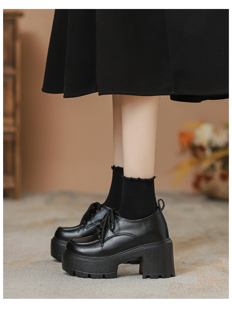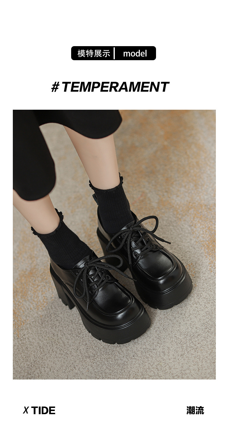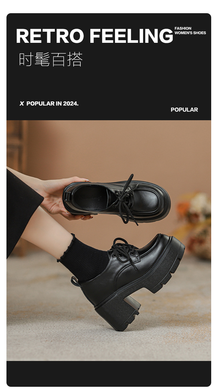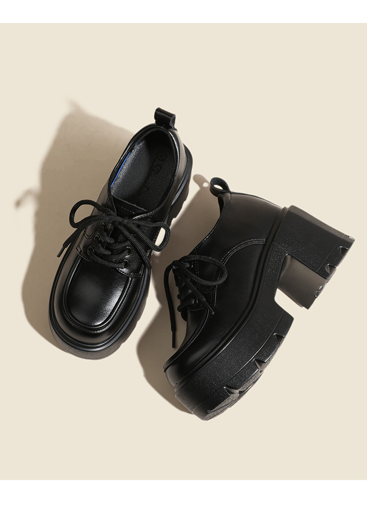 두꺼운 밑창 레이스 업 로퍼 두꺼운 힐 작은 가죽 신발 2024 봄과 가을 새로운 라운드 헤드 블랙 다용도 12cm 증가