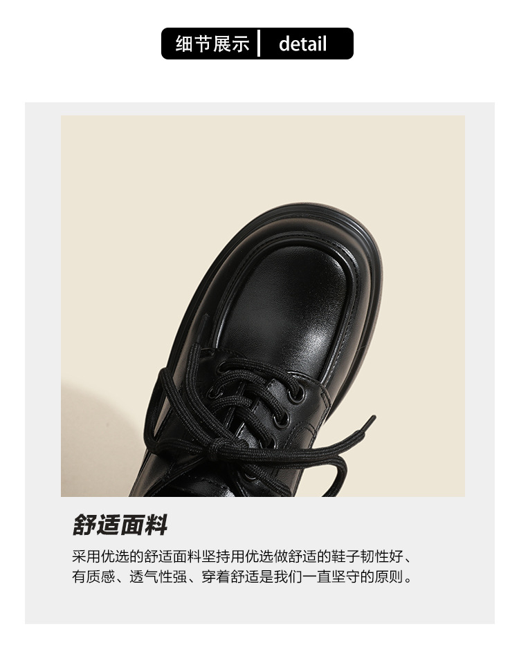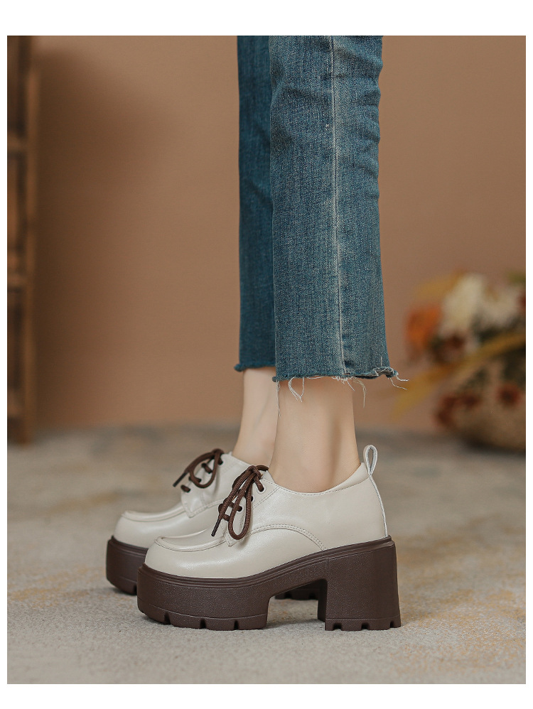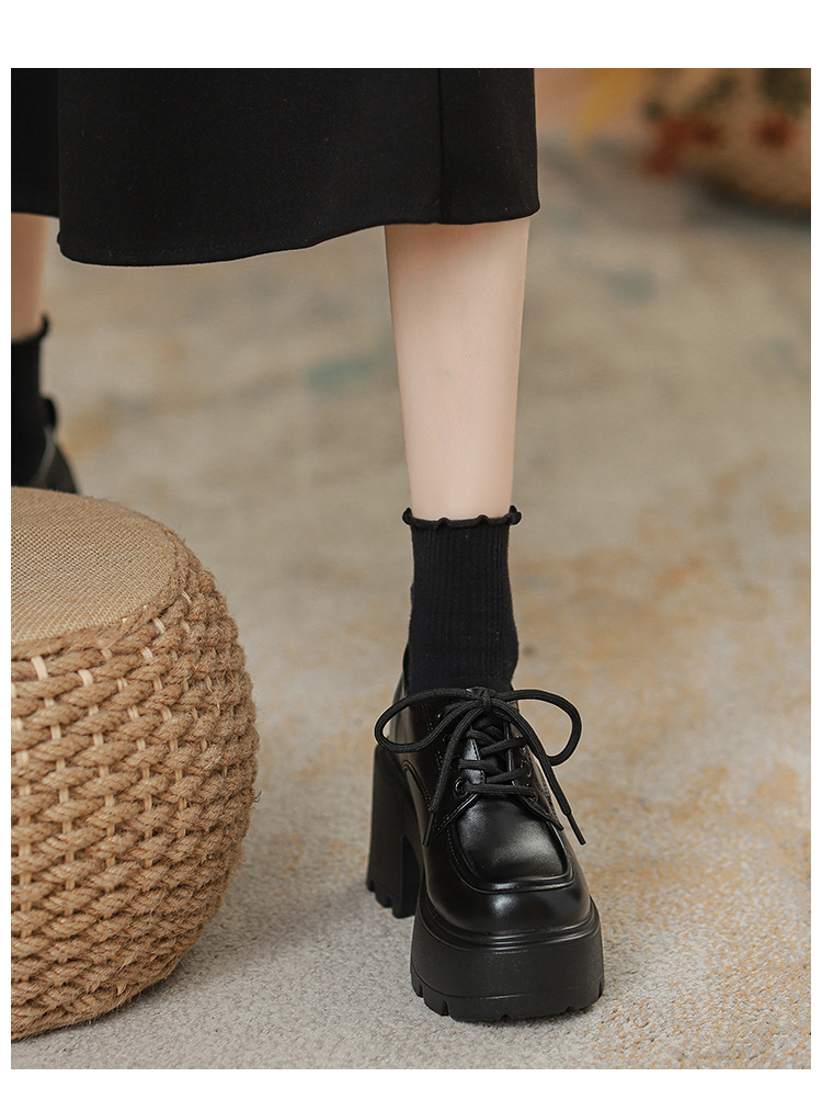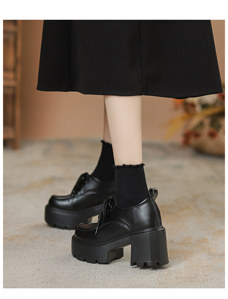 두꺼운 밑창 레이스 업 로퍼 두꺼운 힐 작은 가죽 신발 2024 봄과 가을 새로운 라운드 헤드 블랙 다용도 12cm 증가