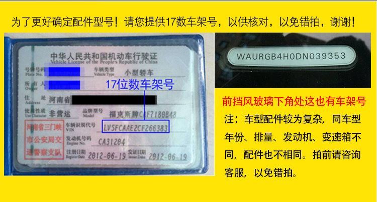 1:为确保准确发货,烦请提供17位数车辆识别号码(例如:LE42040491286514),我们有专业软件帮您查询适用与否,以免搞错: