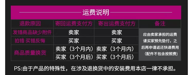 3、退货须知:任何产品退货换货时请保证货物包装、易碎纸标记、标签、货物的完好。否则拒绝签收。