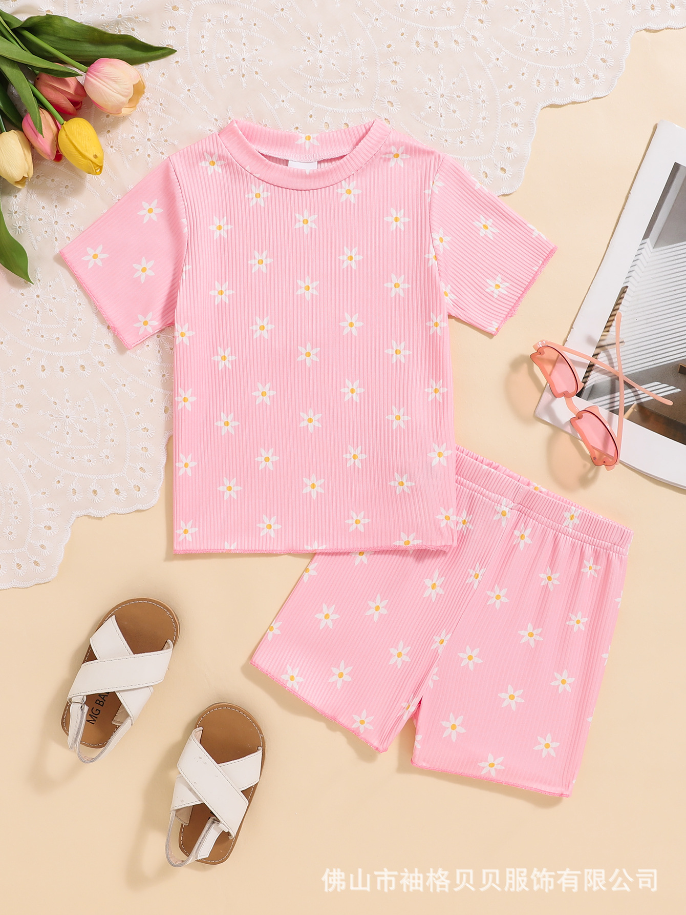 여아 유아복 2026년 신상 한국 스타일 반팔 상의 꽃무늬 반바지 귀여운 여아 투피스 세트