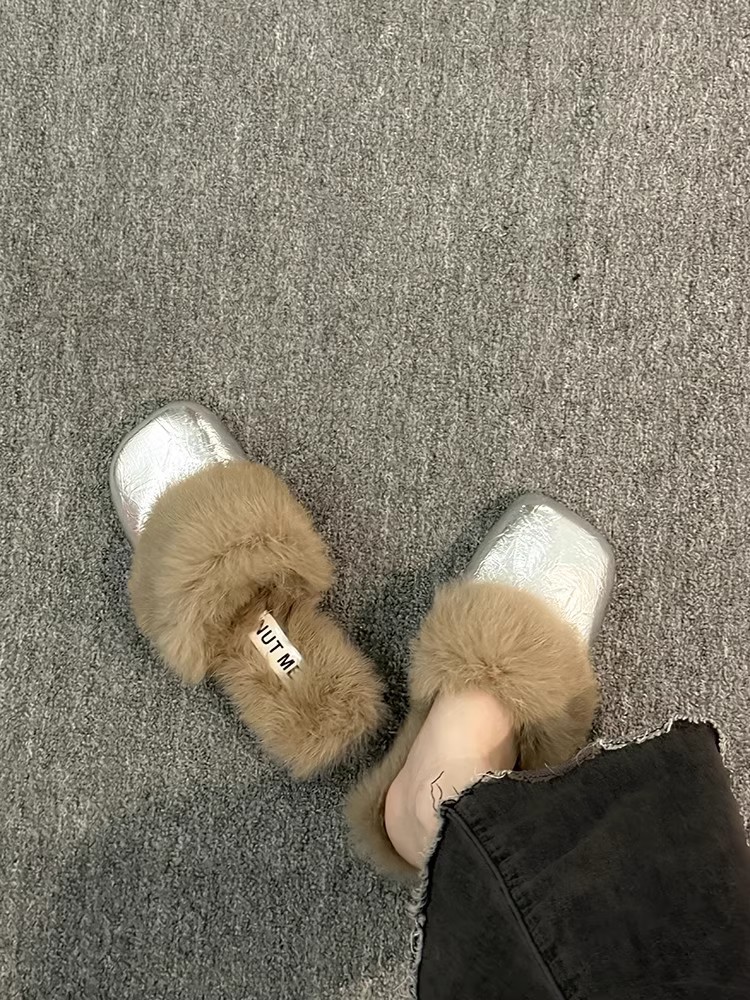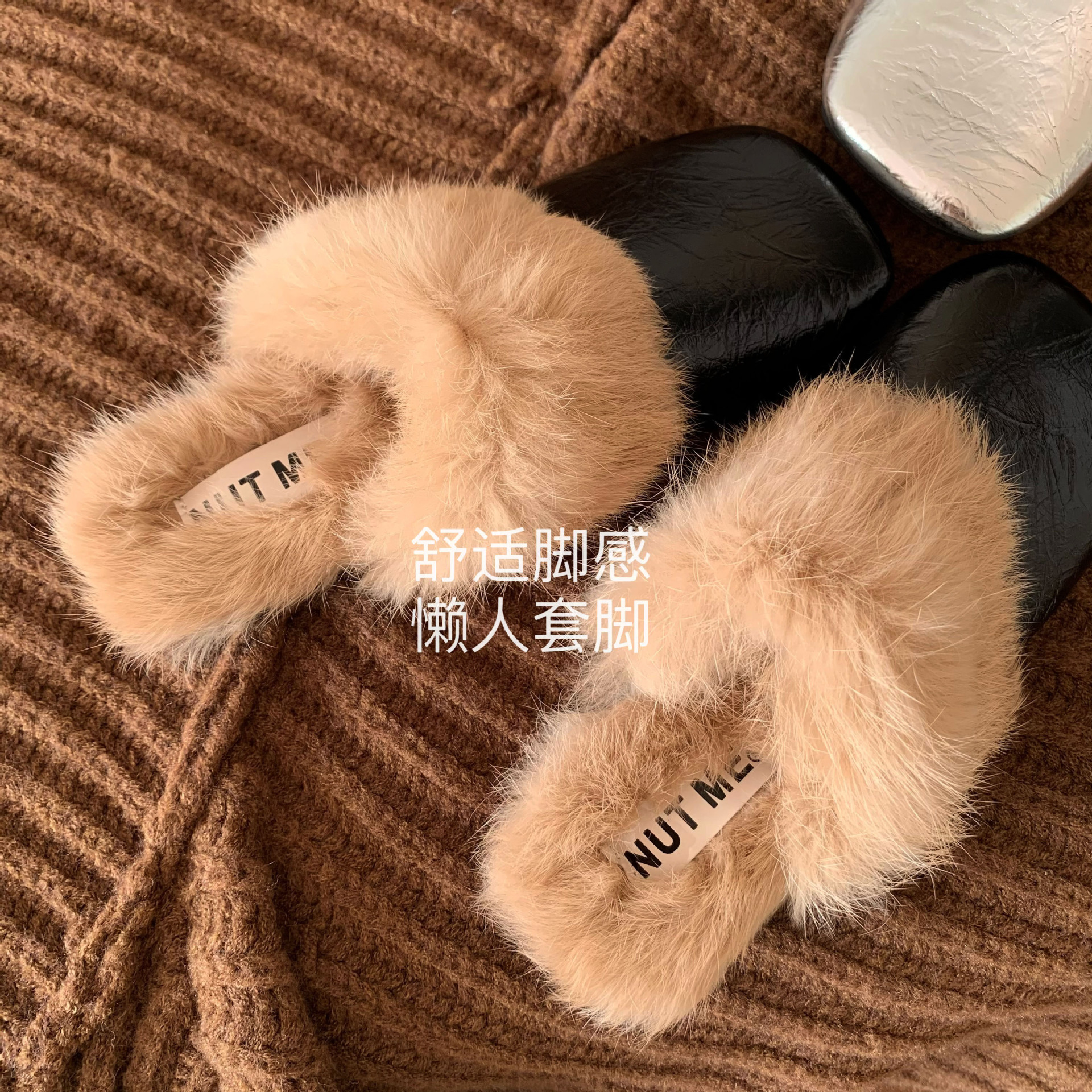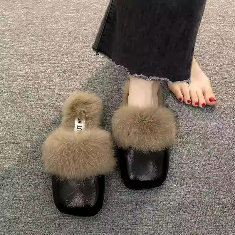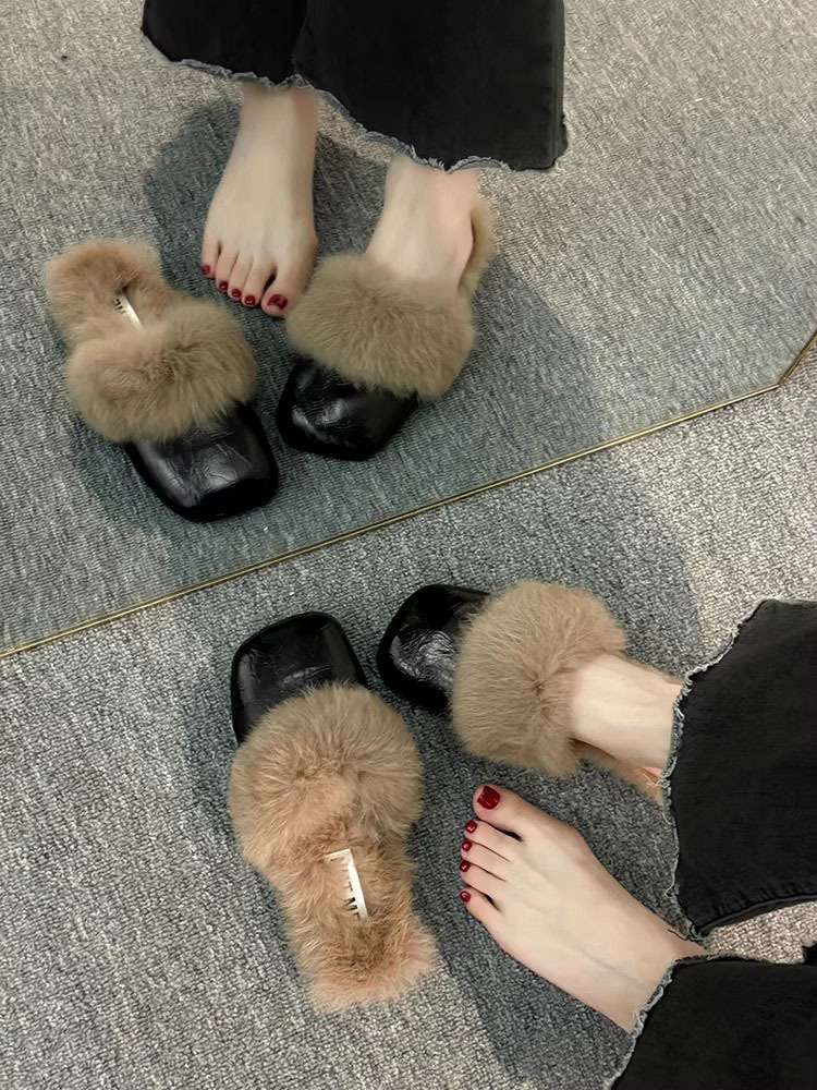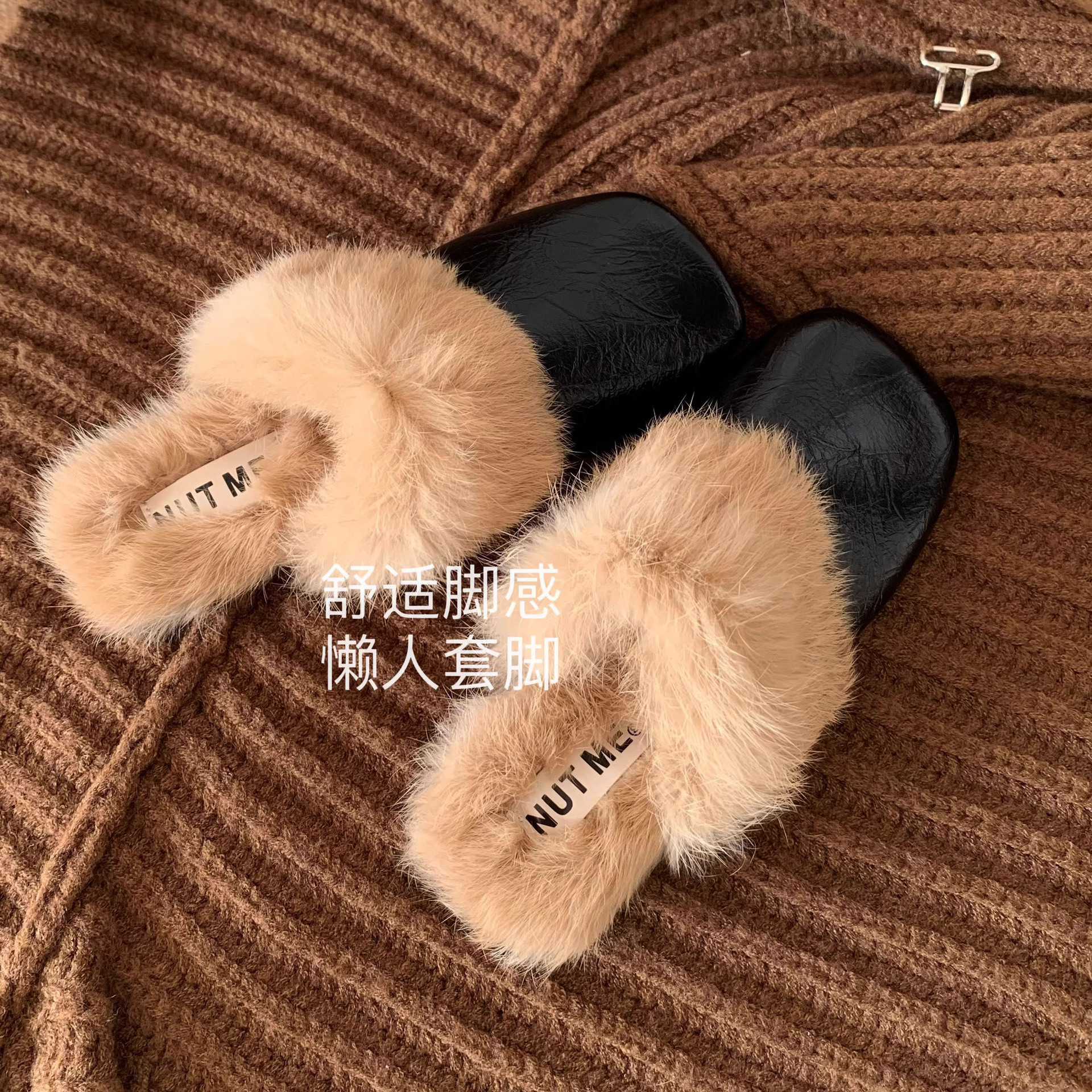 봉제 푹신한 발가락 반 슬리퍼 여성 아우터웨어 기모 2024 새로운 가을 및 겨울 광장 헤드 뮬러 플러시 따뜻한 면 슬리퍼스토어 가기