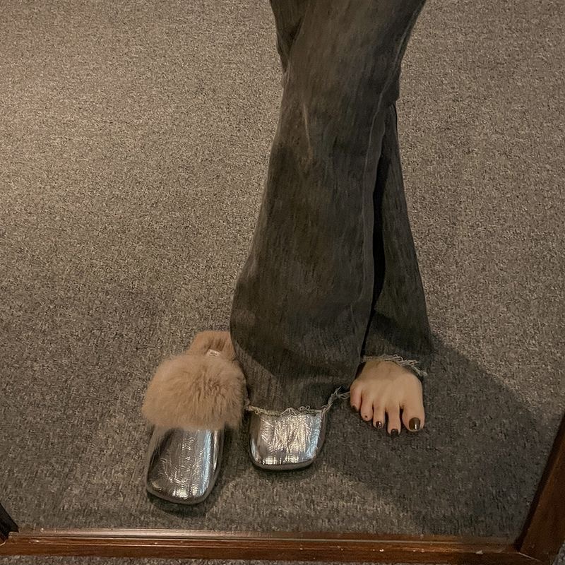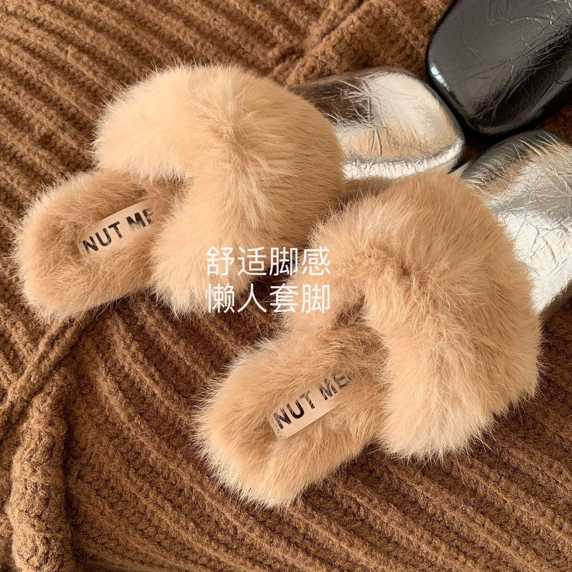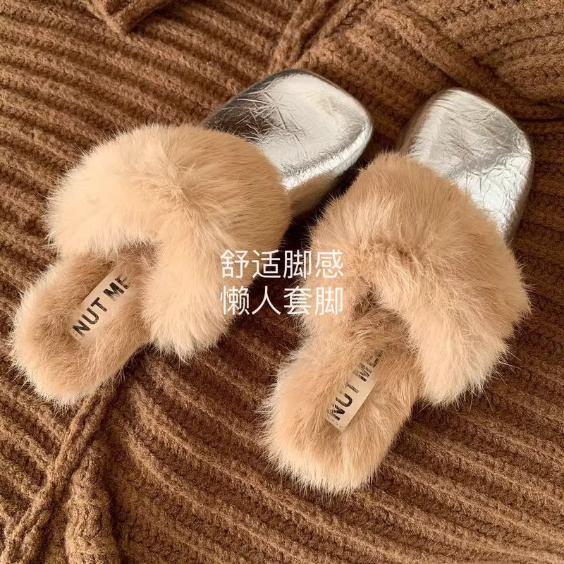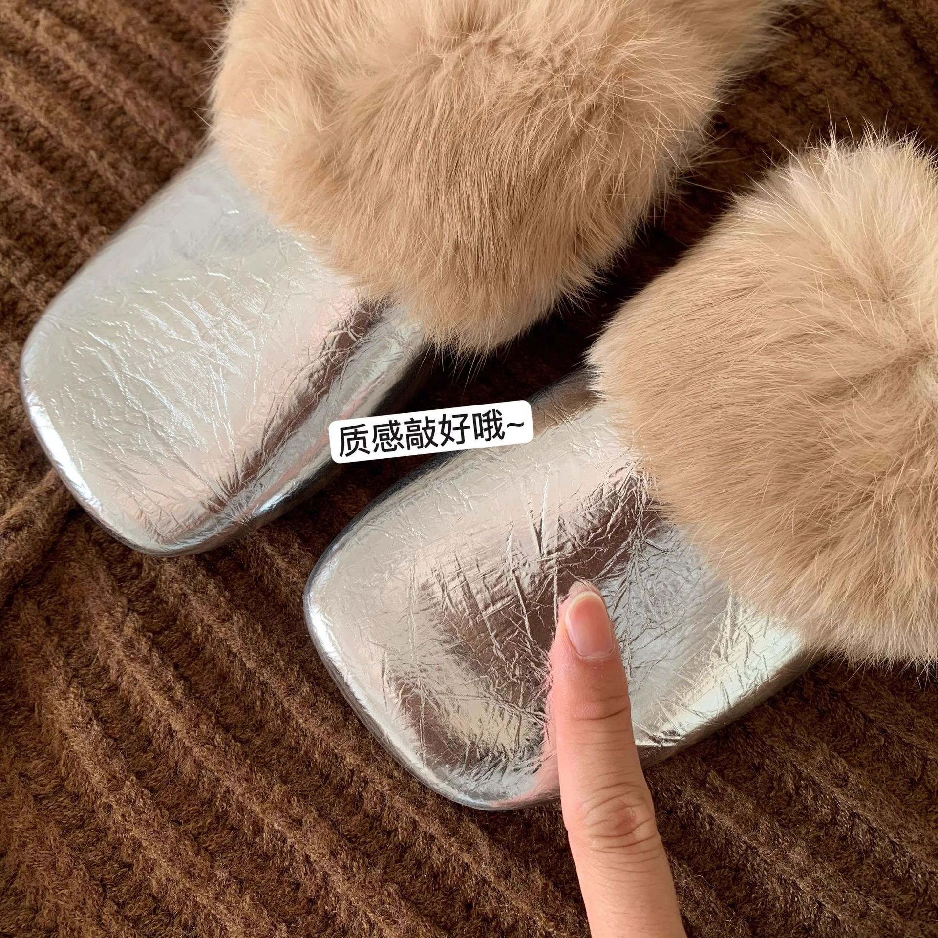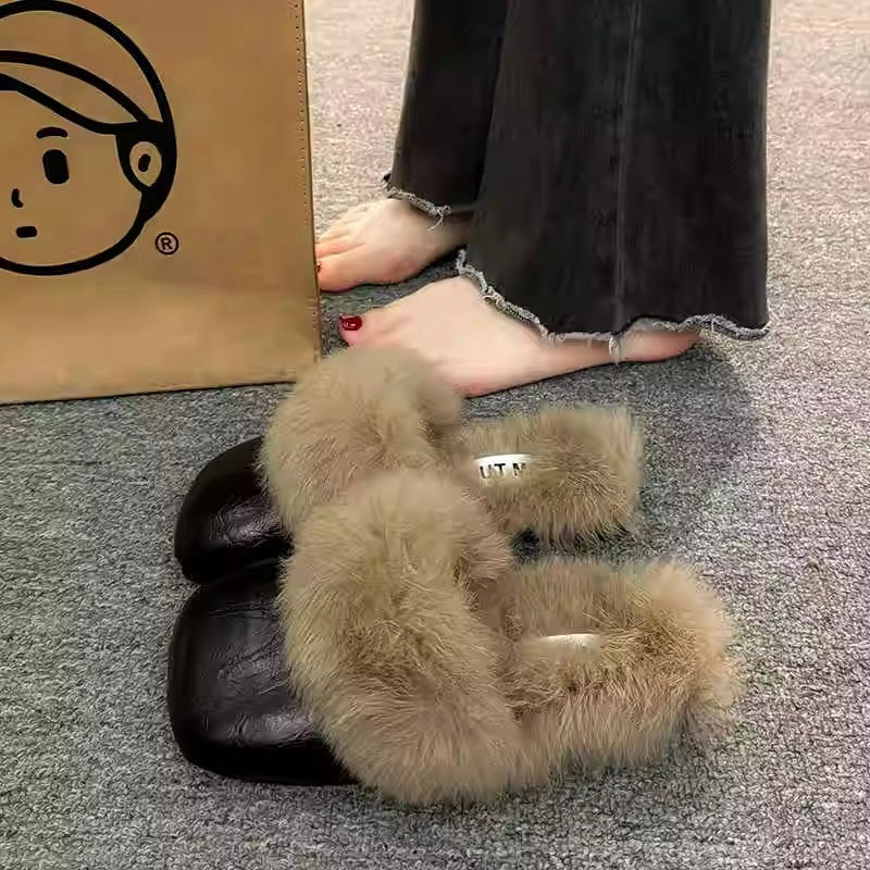 봉제 푹신한 발가락 반 슬리퍼 여성 아우터웨어 기모 2024 새로운 가을 및 겨울 광장 헤드 뮬러 플러시 따뜻한 면 슬리퍼스토어 가기
