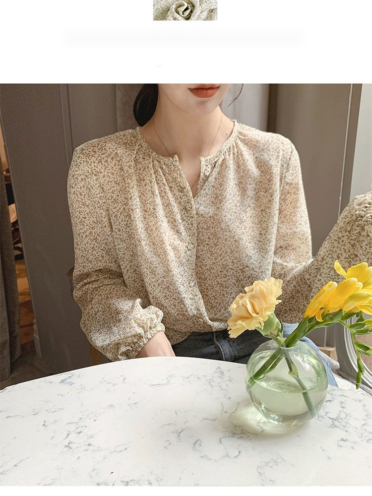 패션 꽃 쉬폰 셔츠 긴 소매 이른 가을 레트로 홍콩 스타일 달콤한 느슨한 퍼프 소매 작은 셔츠 세련된 탑스토어 가기