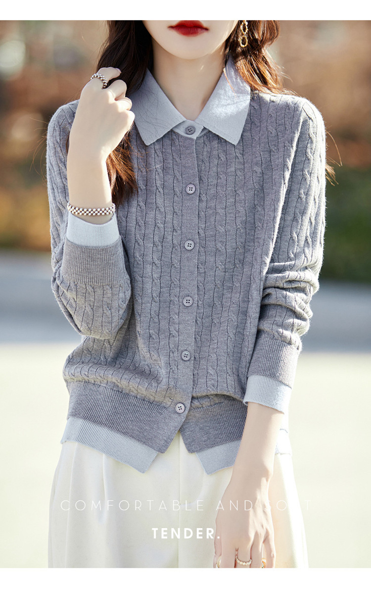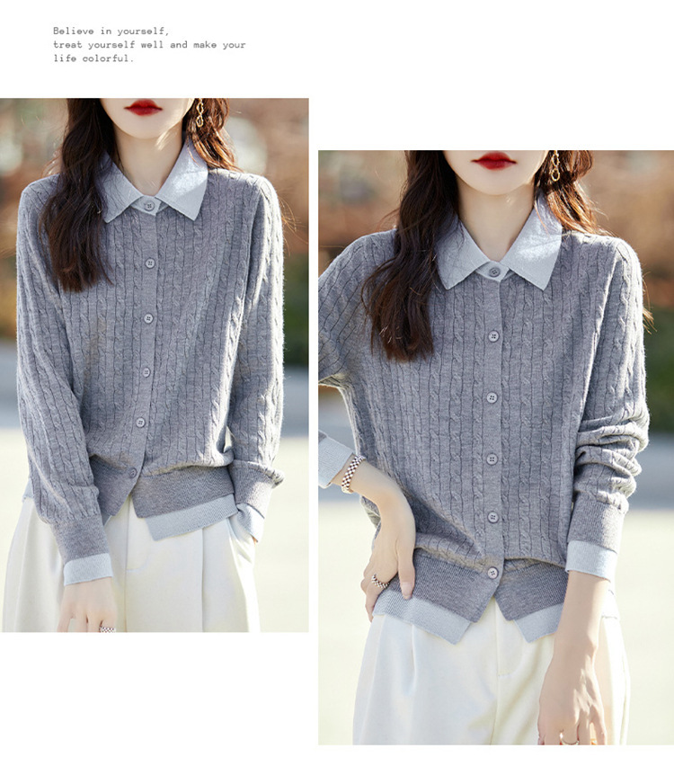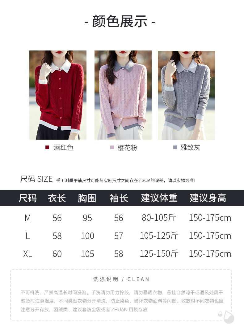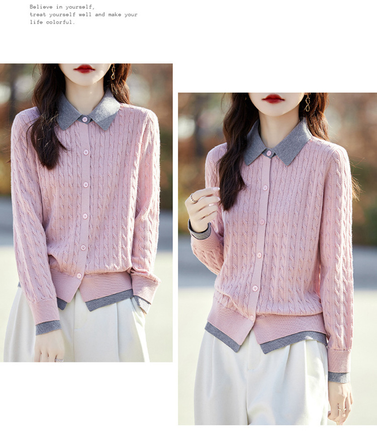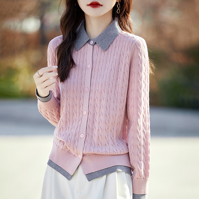 가을 겨울 신상 여성 니트 스웨터 POLO 칼라 배색 페이크 투피스 스웨터 외투 배색 상의 여성 자켓스토어 가기