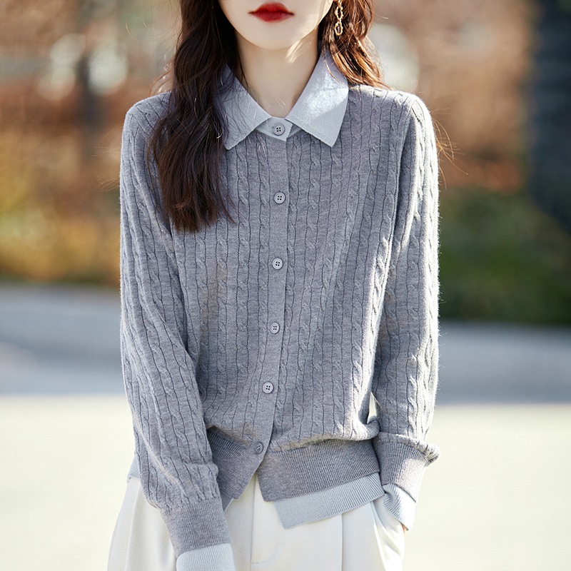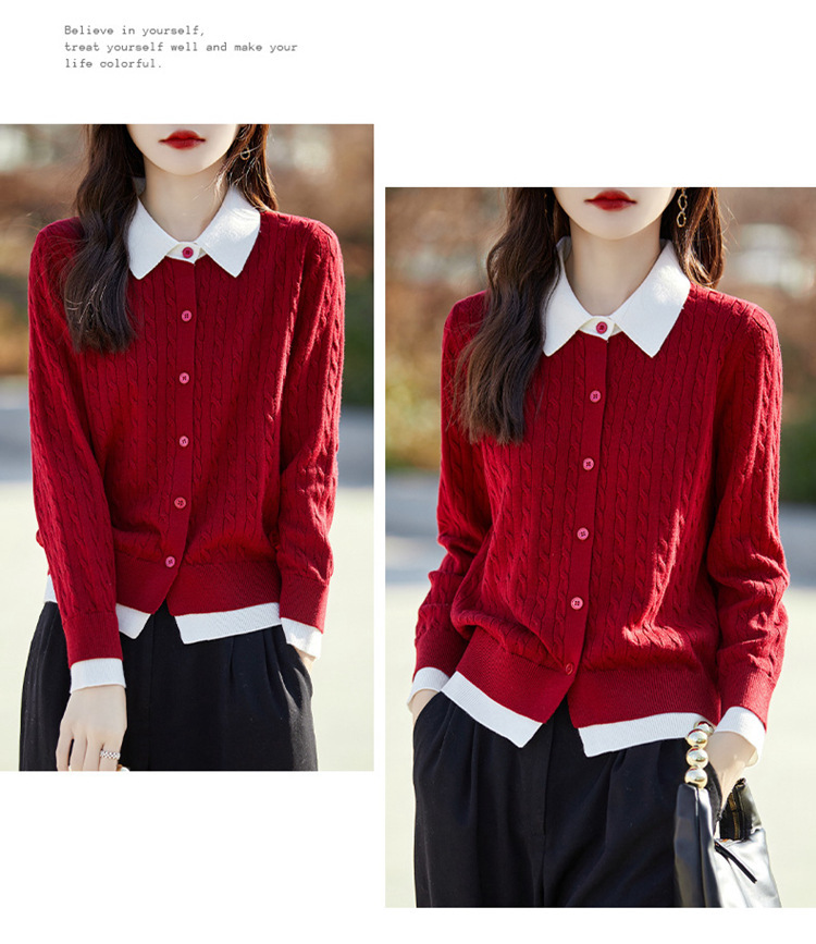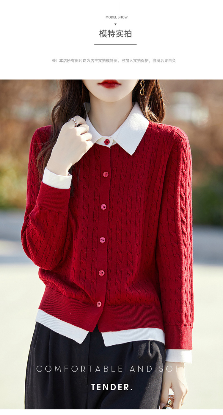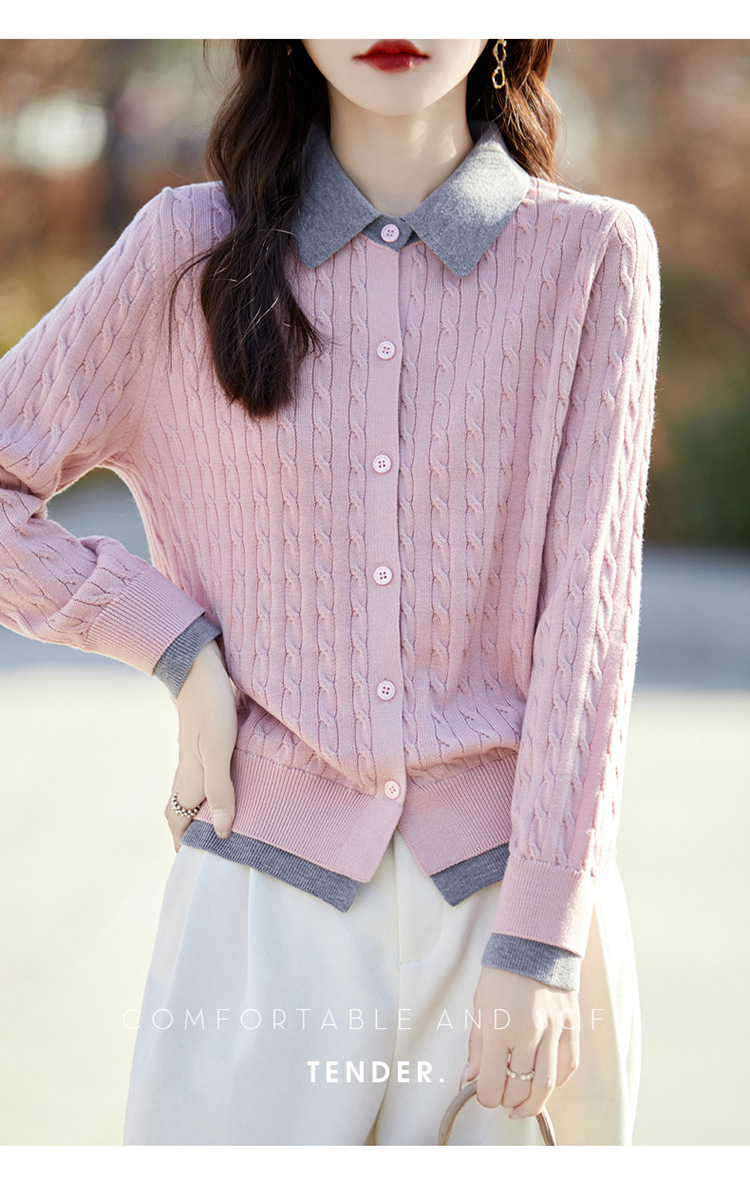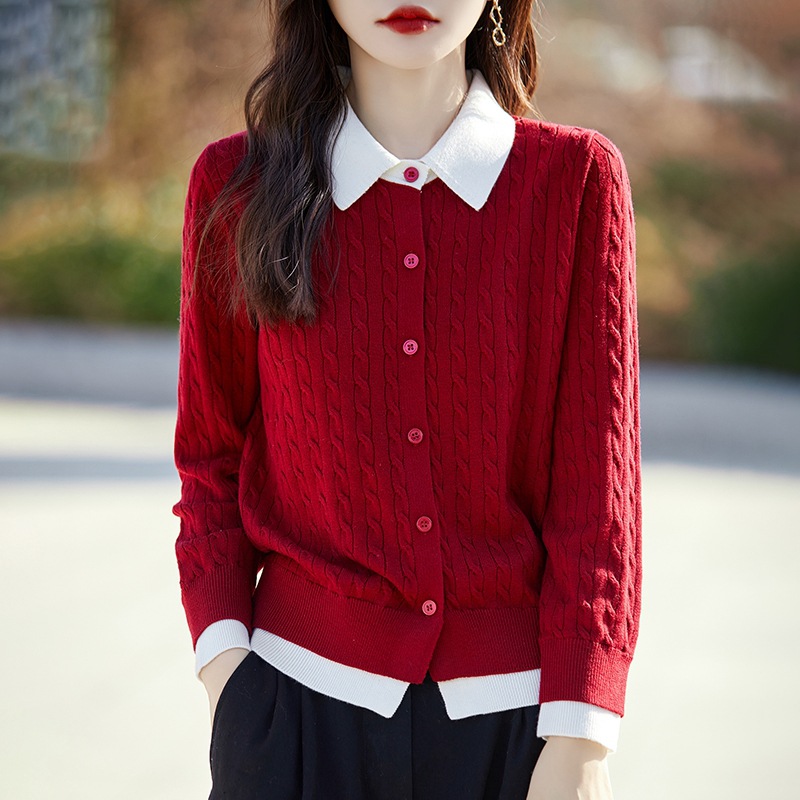 가을 겨울 신상 여성 니트 스웨터 POLO 칼라 배색 페이크 투피스 스웨터 외투 배색 상의 여성 자켓스토어 가기