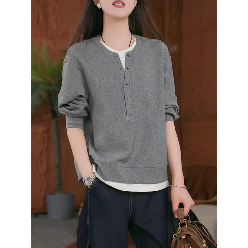 플러스 사이즈 어깨 V 넥 가짜 투피스 긴팔 스웨트 셔츠 여성의 2024 가을 및 겨울 약간의 뚱뚱한 MM 슬림 배 덮는베이스 탑
