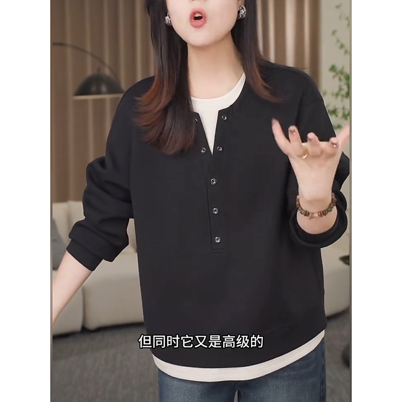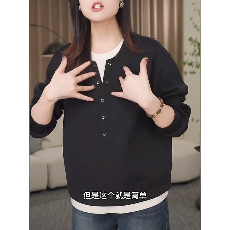플러스 사이즈 어깨 V 넥 가짜 투피스 긴팔 스웨트 셔츠 여성의 2024 가을 및 겨울 약간의 뚱뚱한 MM 슬림 배 덮는베이스 탑스토어 가기