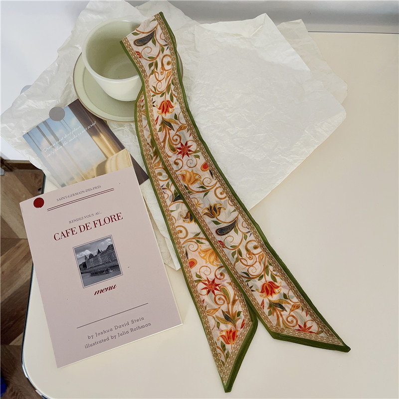 프랑스 스타일 레트로 플로랄 실크 스카프 여자 올매치 우아한 스카프 넥타이와 붕대 헤어 얇은 좁은 긴 리본 녹색 리본