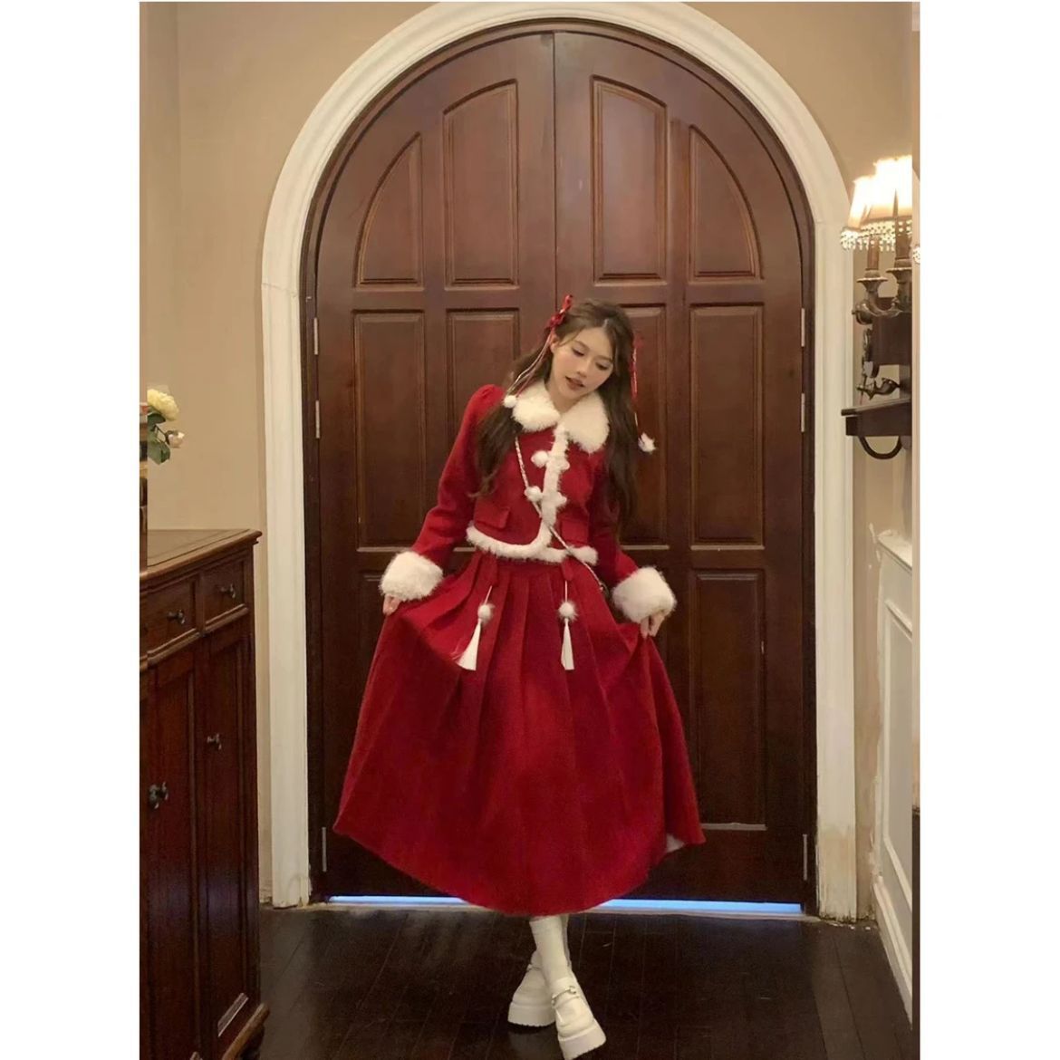 겨울 새해 크리스마스 전쟁 가운 두 조각 세트 새로운 중국 스타일 국가 스타일 세트 샤넬 스타일 코트 여성을위한 중간 길이 원피스 투피스 세트