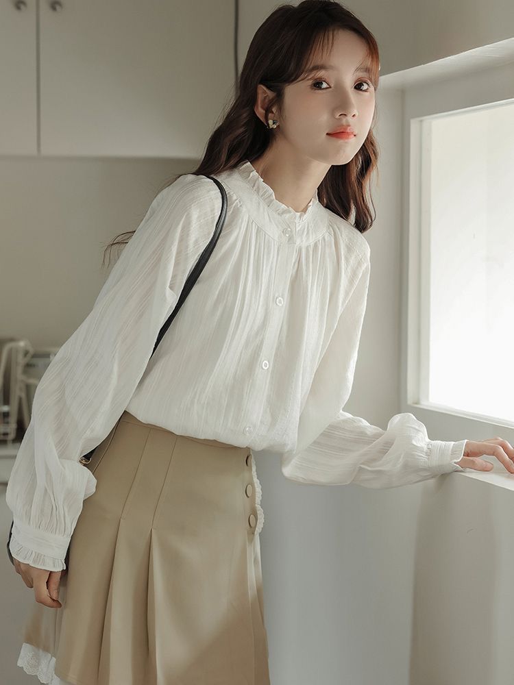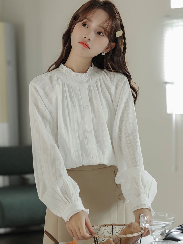 귀 트림 화이트 셔츠 여성 디자인 센스 니쉬 봄과 가을 새로운 긴 소매 스택 셔츠 루즈 스위트 베이스 탑