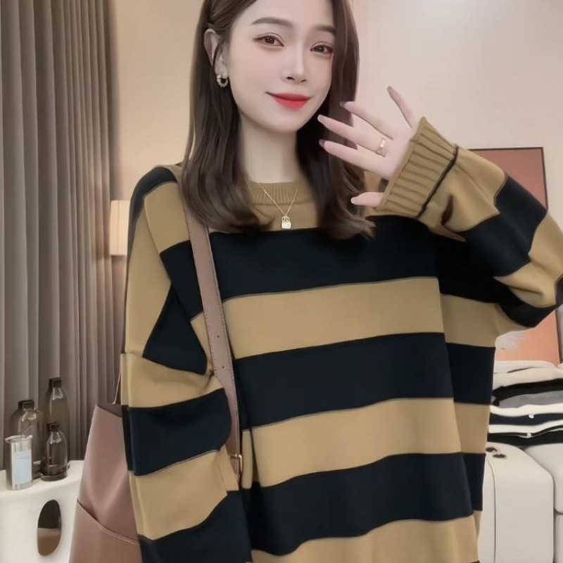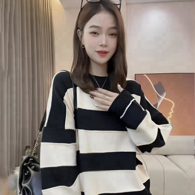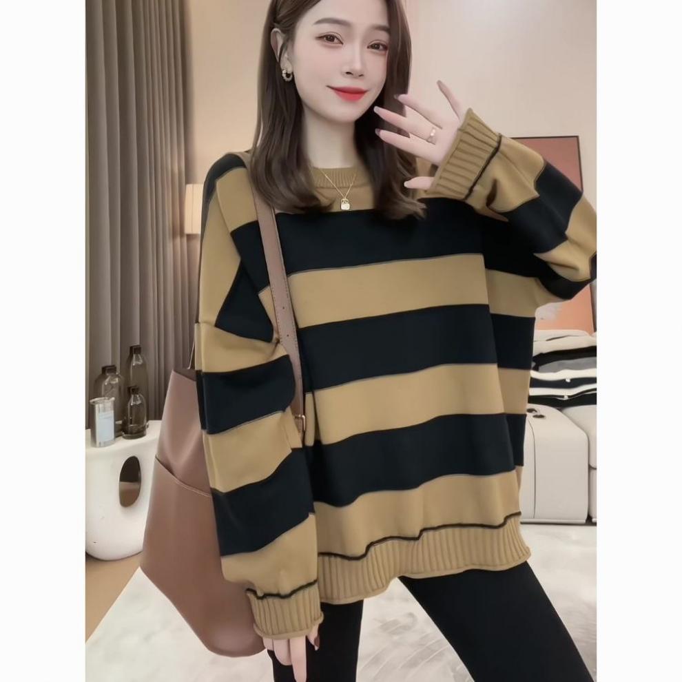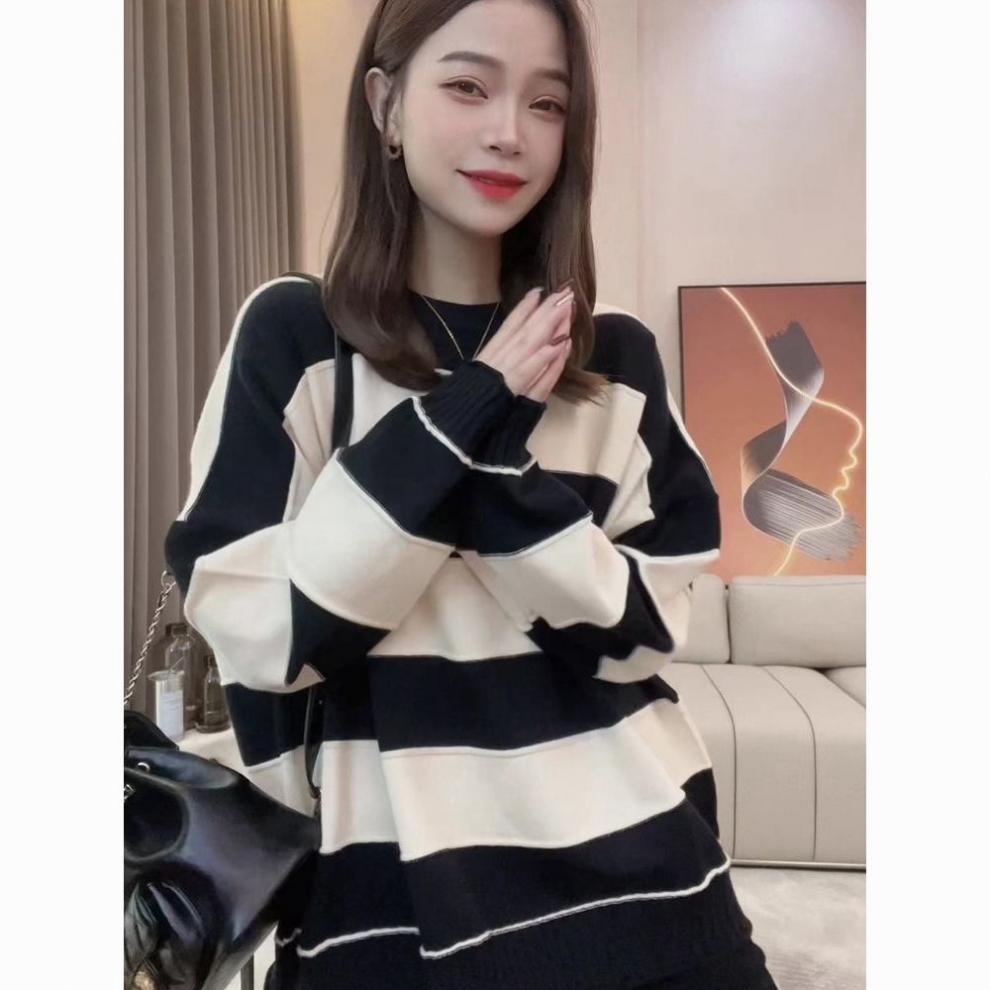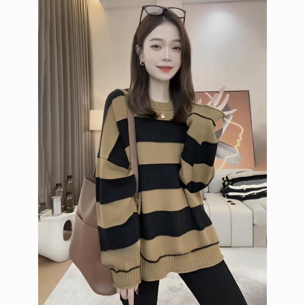 가을과 겨울 게으른 바람 스트라이프 스웨터 여성의 2023 새로운 인기 한국 버전 느슨한 긴 스웨터 긴 소매 탑스토어 가기