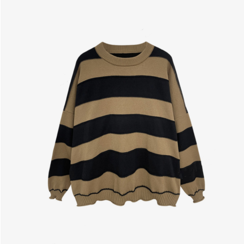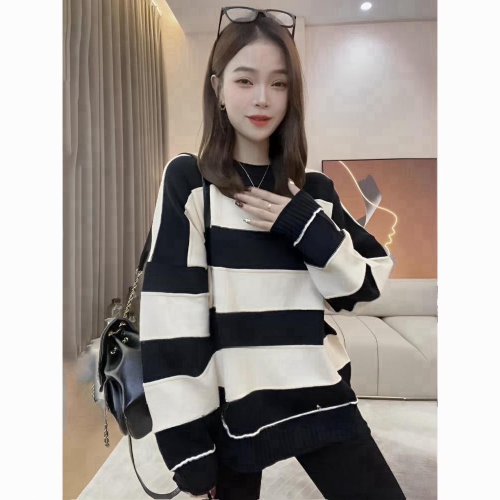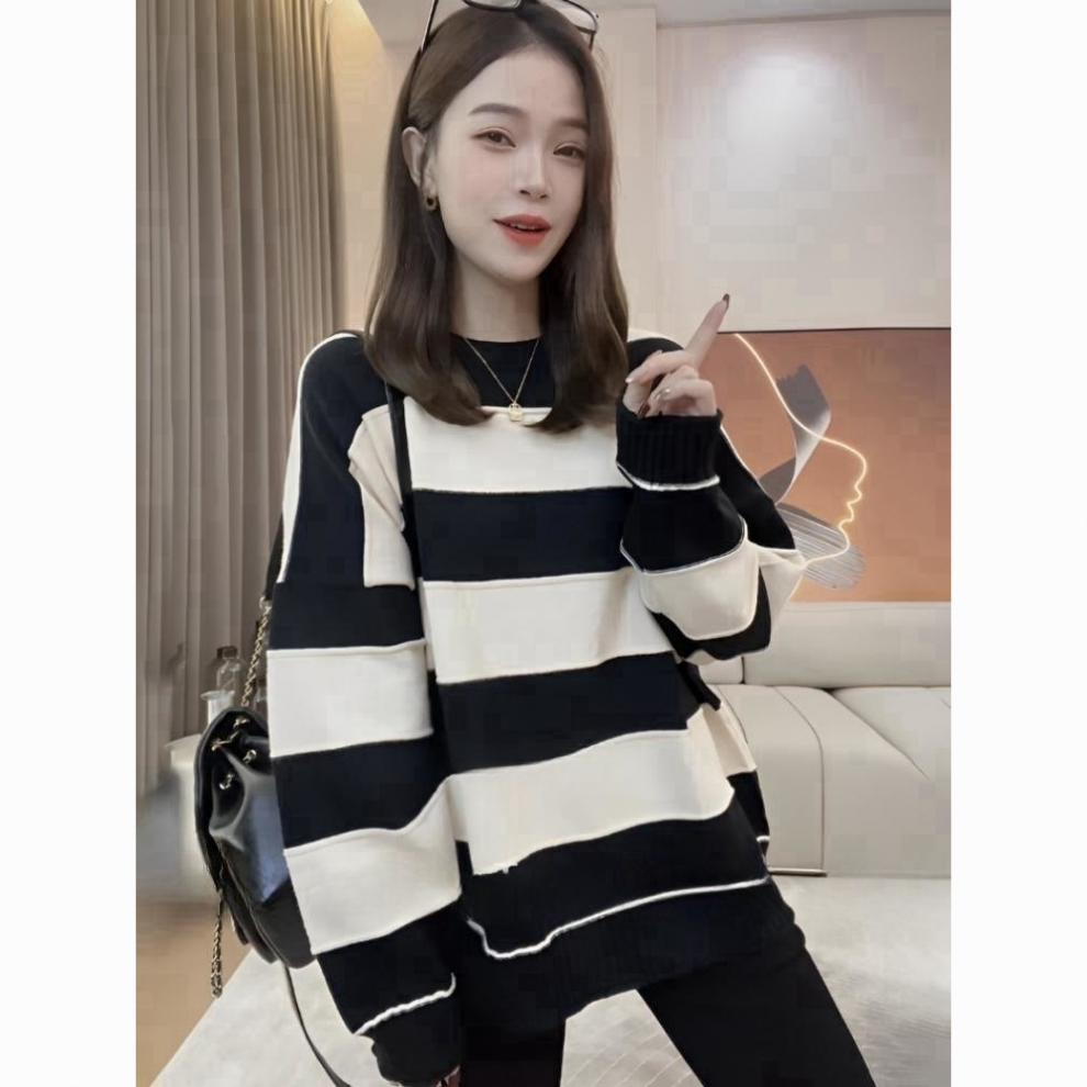 가을과 겨울 게으른 바람 스트라이프 스웨터 여성의 2023 새로운 인기 한국 버전 느슨한 긴 스웨터 긴 소매 탑