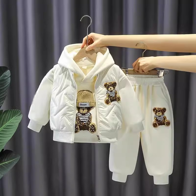 여자 기모 곰 세트 겨울 어린이 귀여운 두꺼운 원피스 까마귀 아기 후드 외국 스타일 조끼 3 피스 세트