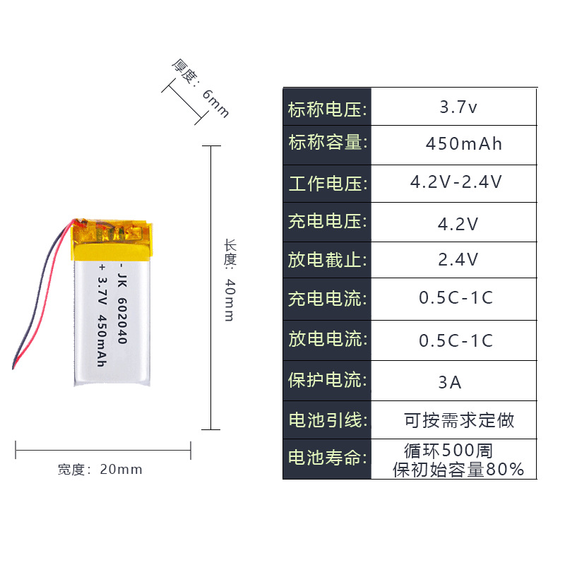 602040 리튬 배터리 450mAh 제조 업체 장난감 아름다움 악기 전자 책 야간 낚시 램프 삼원 폴리머 리튬 배터리