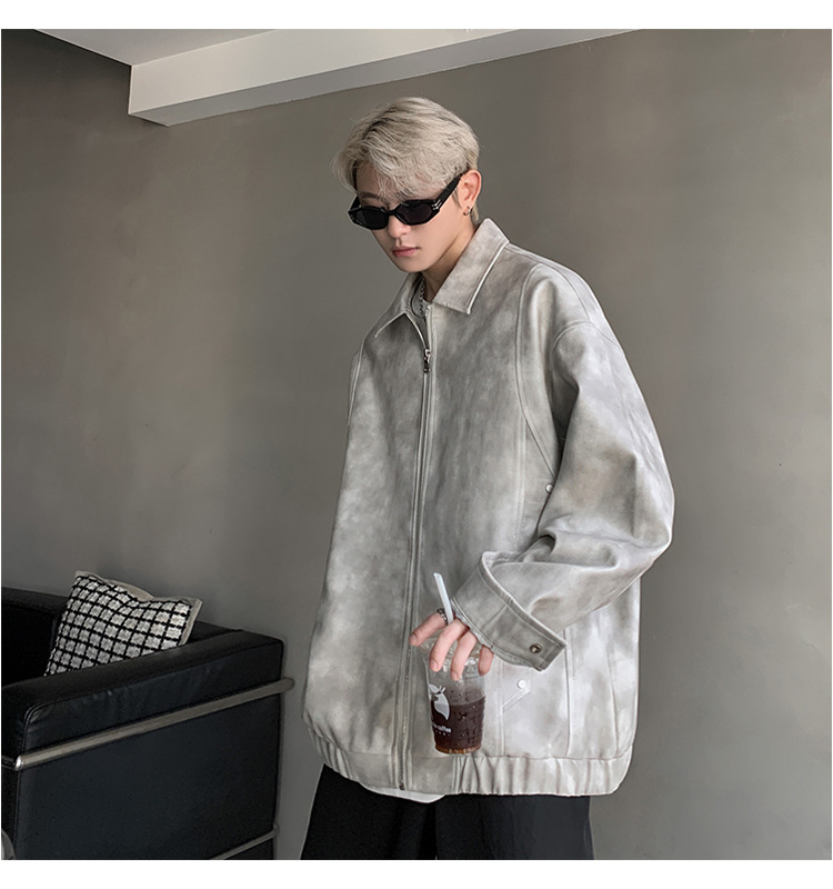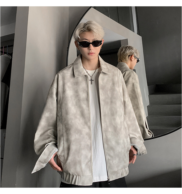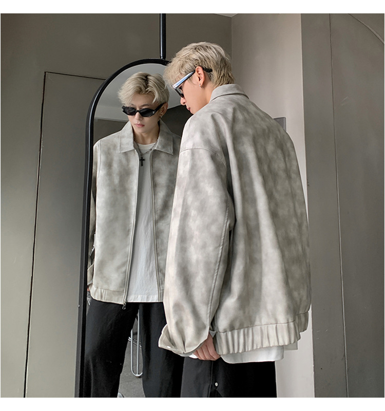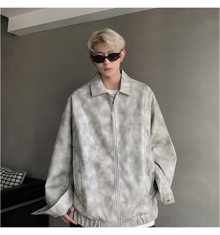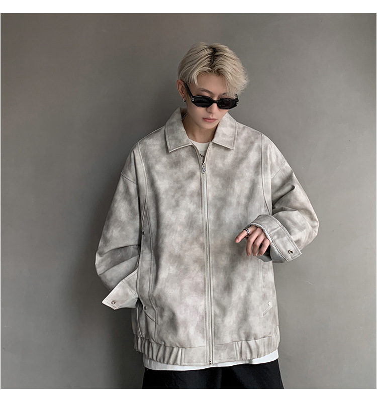 넥타이 염색 PU 가죽 재킷 남자의 봄과 가을 2024 새로운 빈티지 Deconstruction 유행 브랜드 청소년 캐주얼 옷깃 재킷스토어 가기