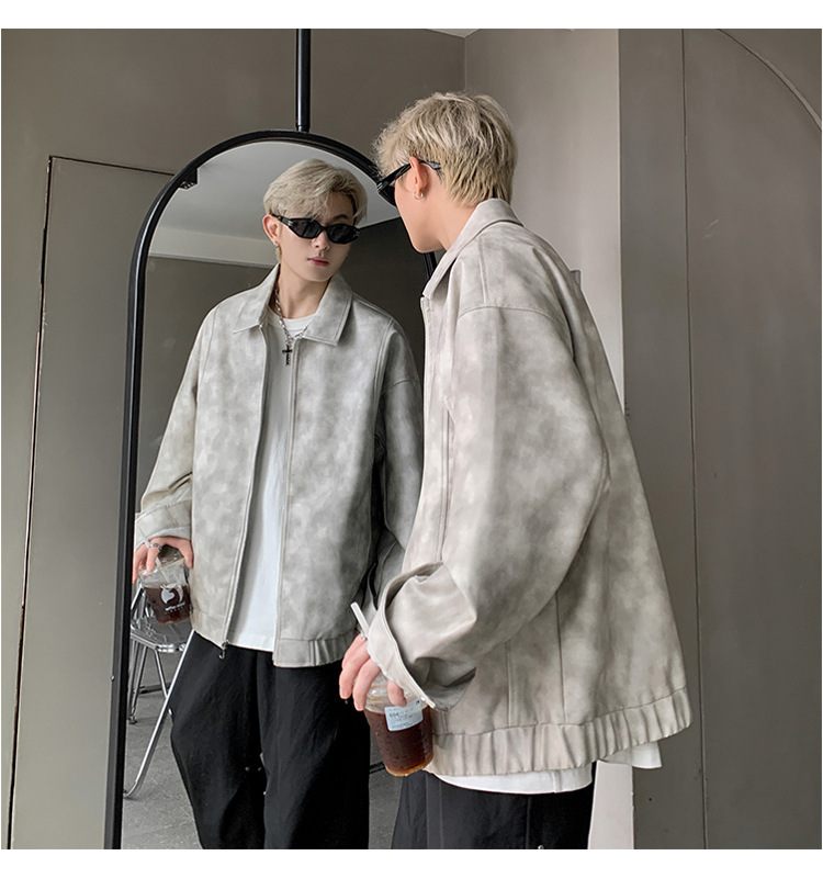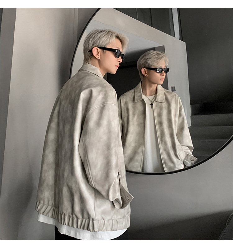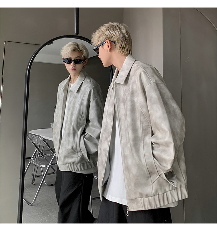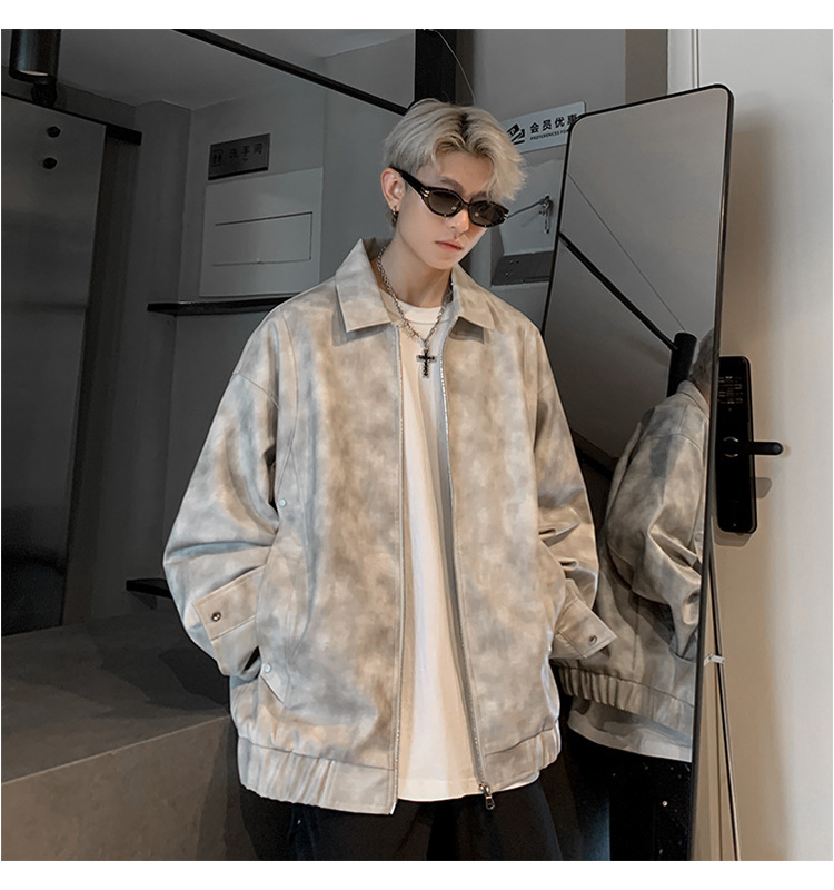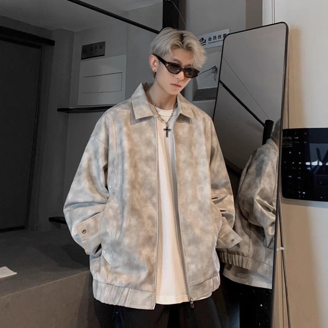 넥타이 염색 PU 가죽 재킷 남자의 봄과 가을 2024 새로운 빈티지 Deconstruction 유행 브랜드 청소년 캐주얼 옷깃 재킷스토어 가기