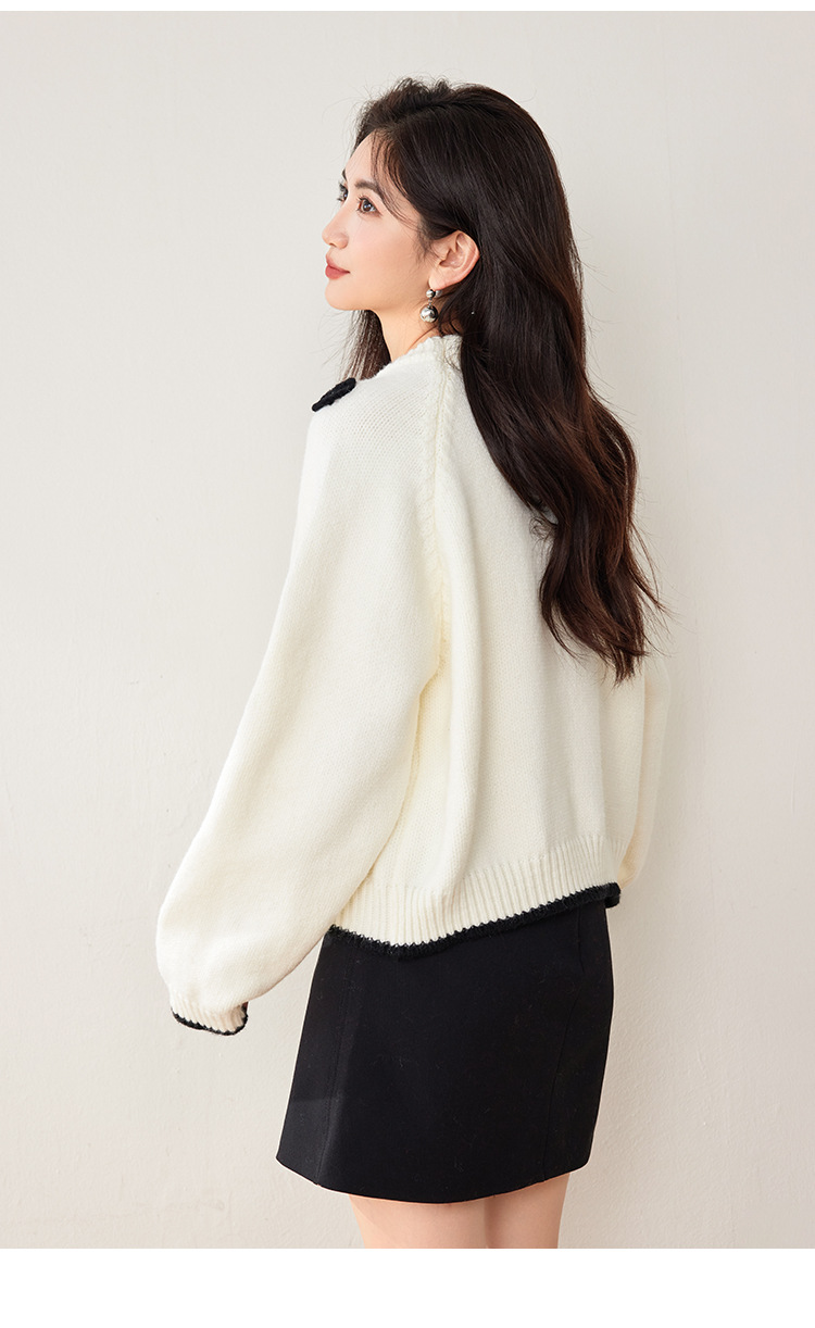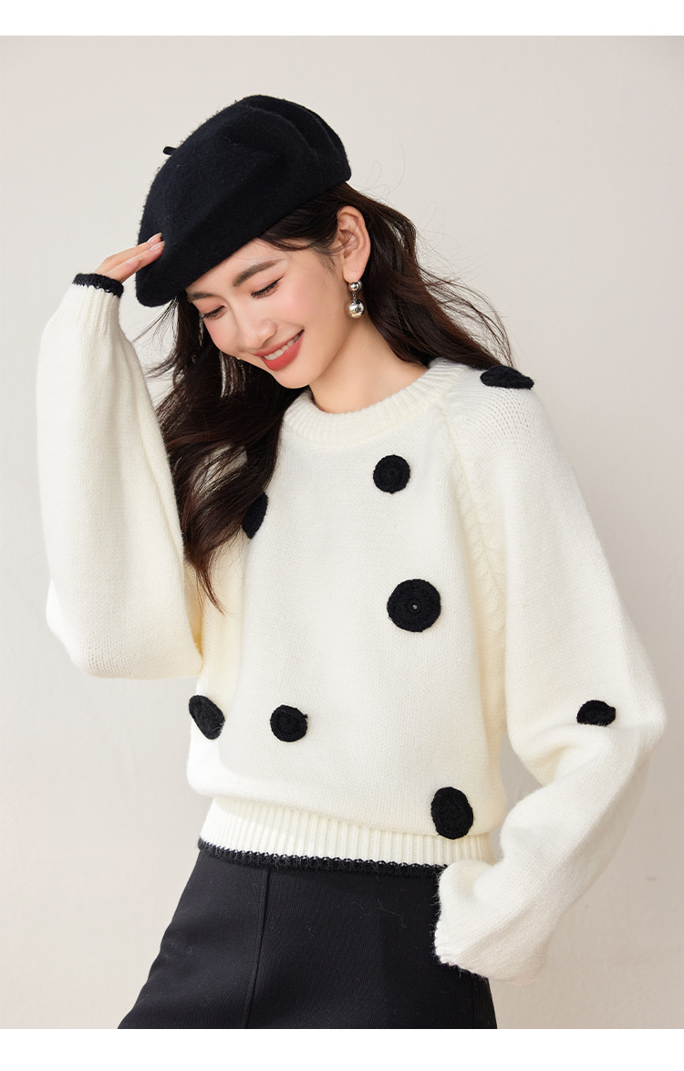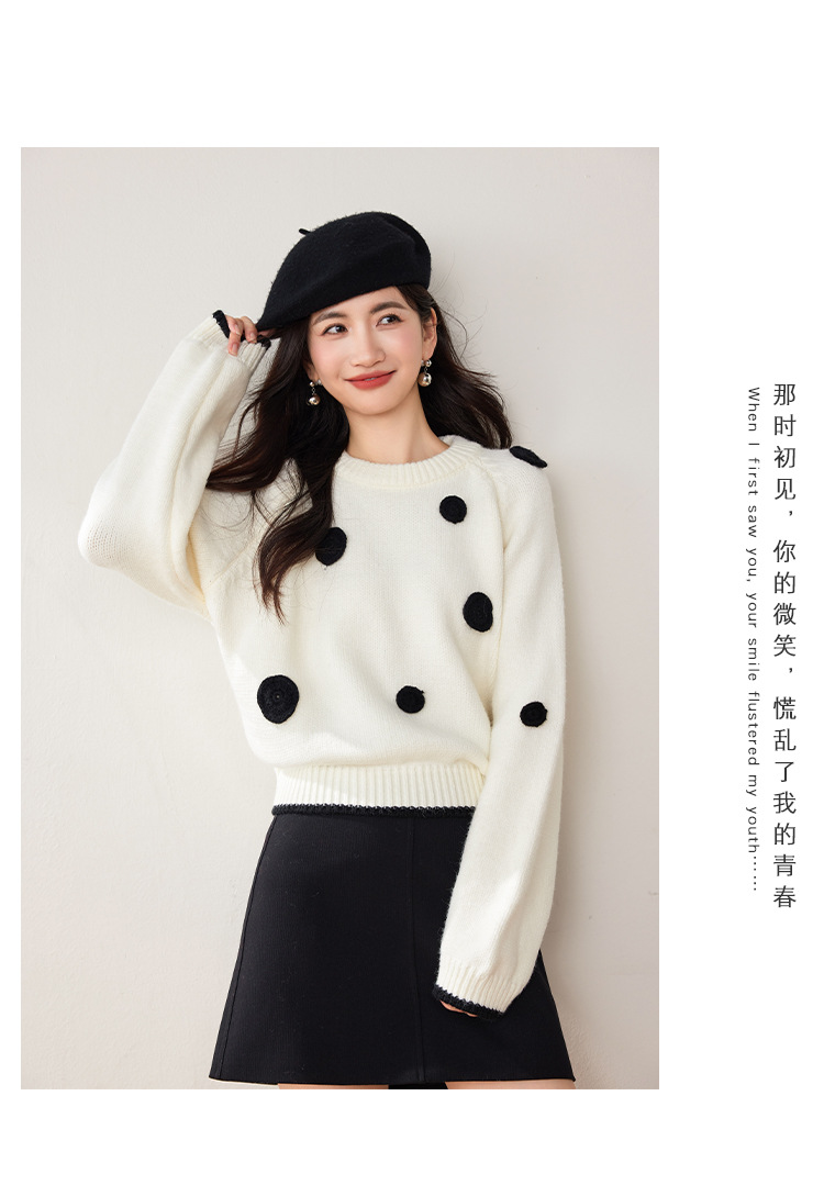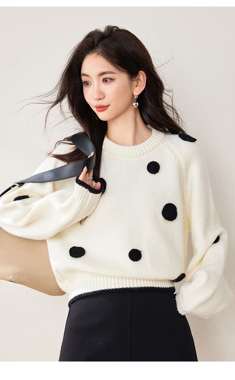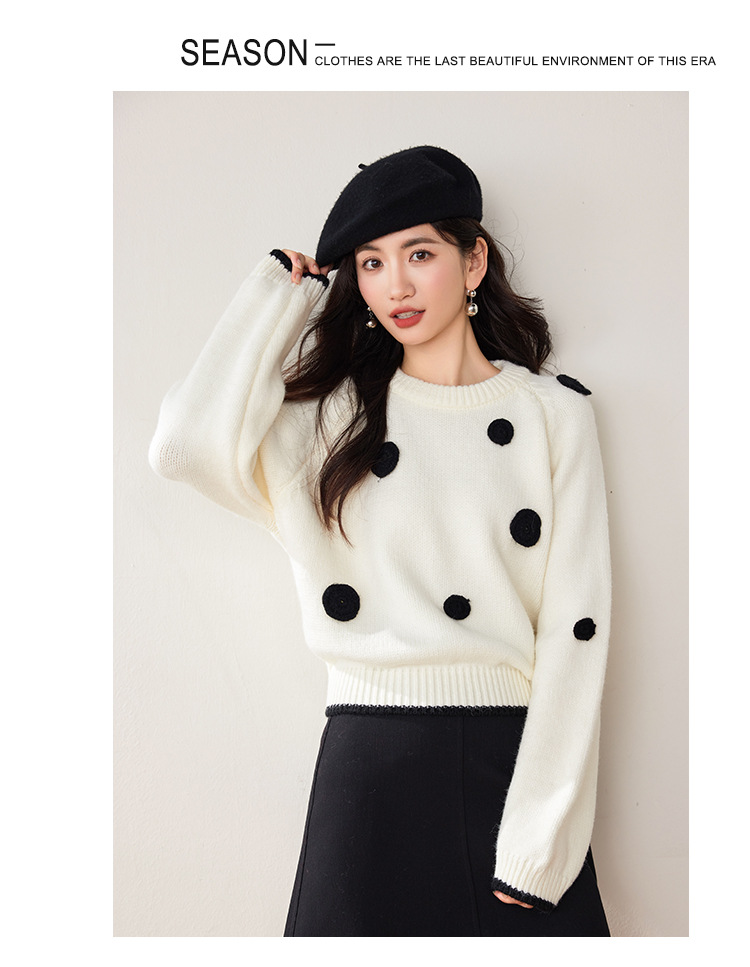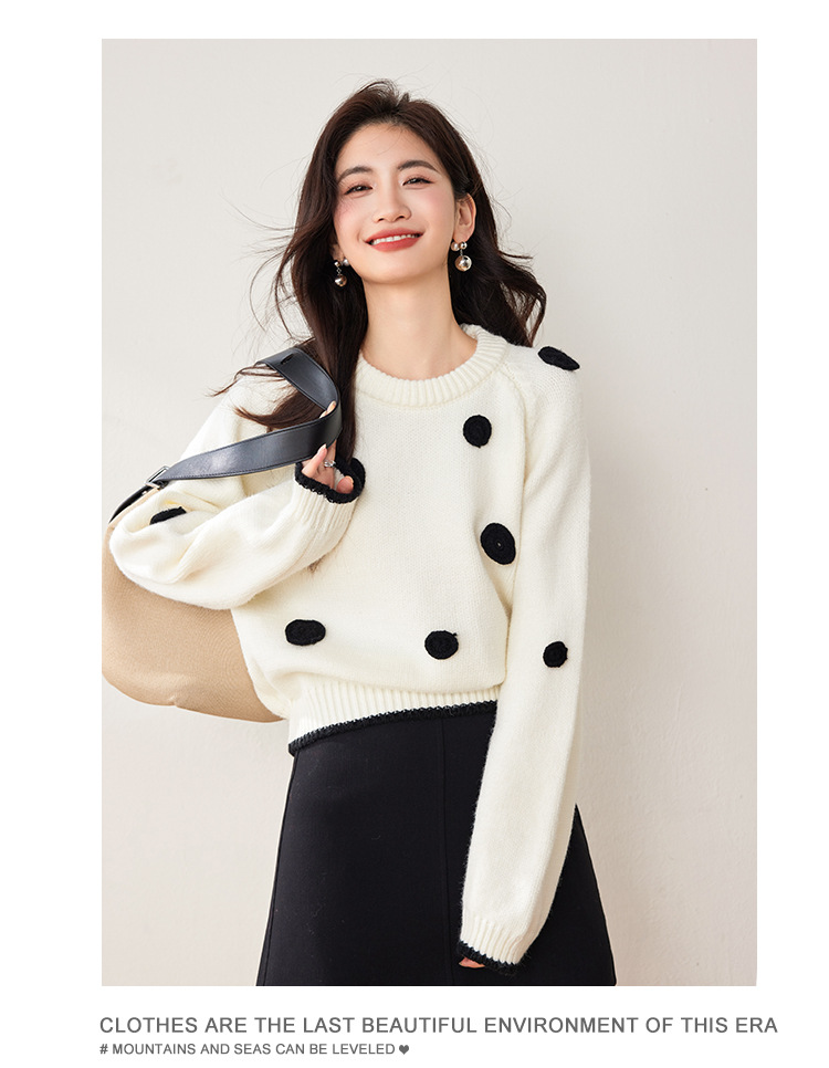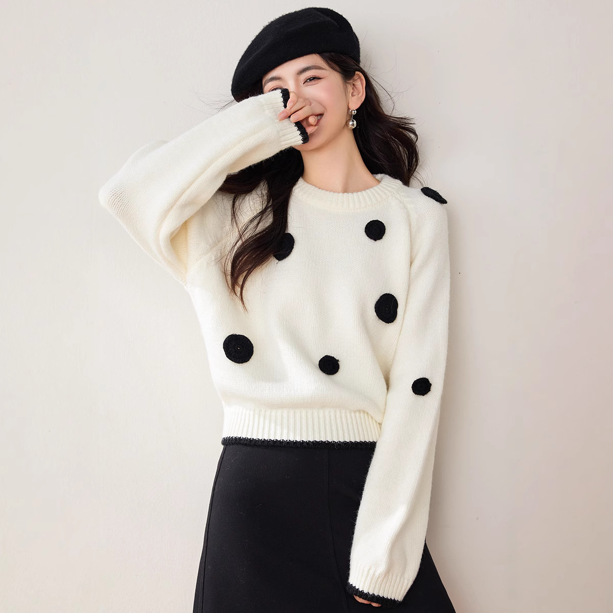 2024 가을과 겨울 새로운 달콤한 귀여운 웨이브 도트 부드러운 왁스 따뜻한 작은 풀오버 라운드 넥 니트 짧은 스웨터 여성용