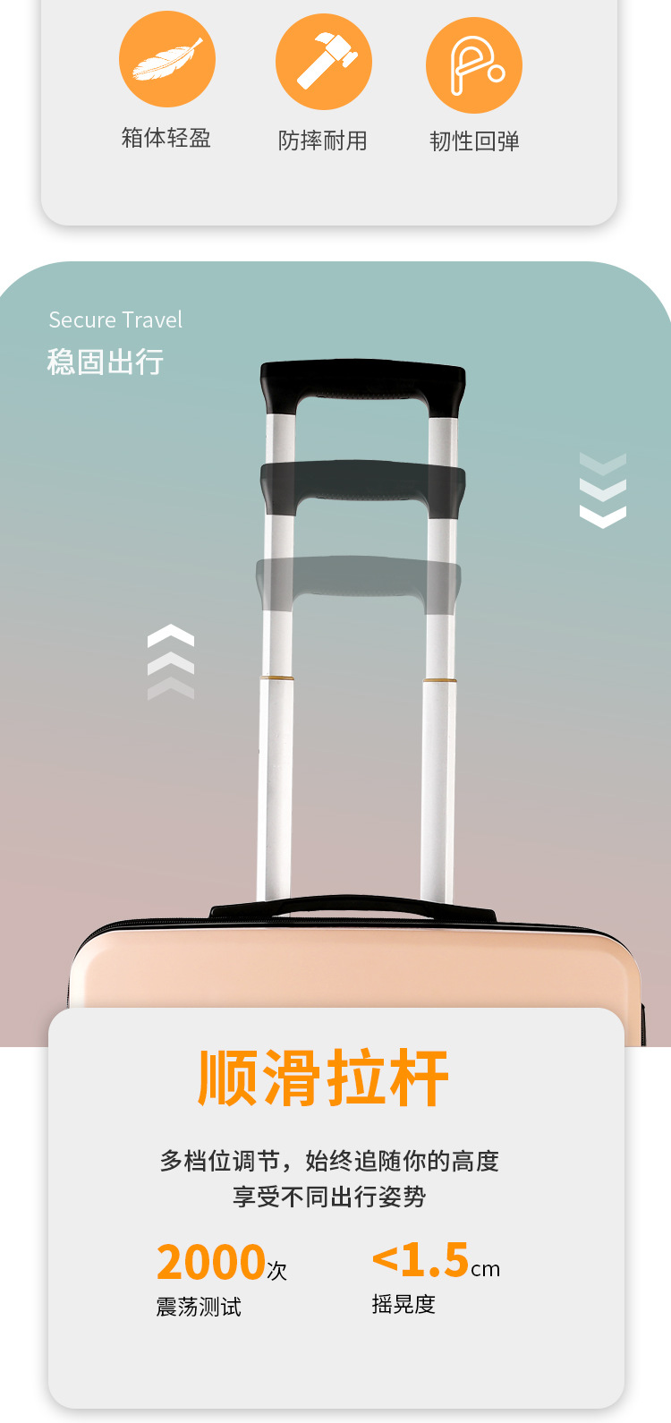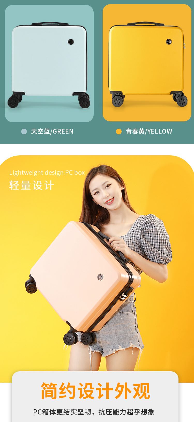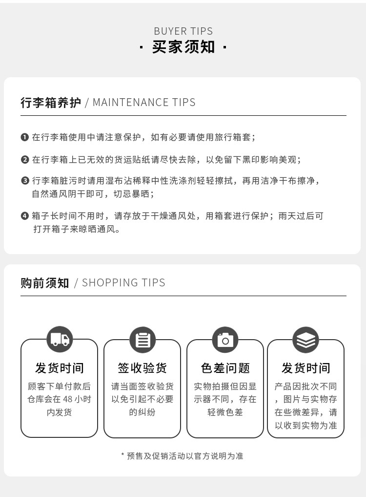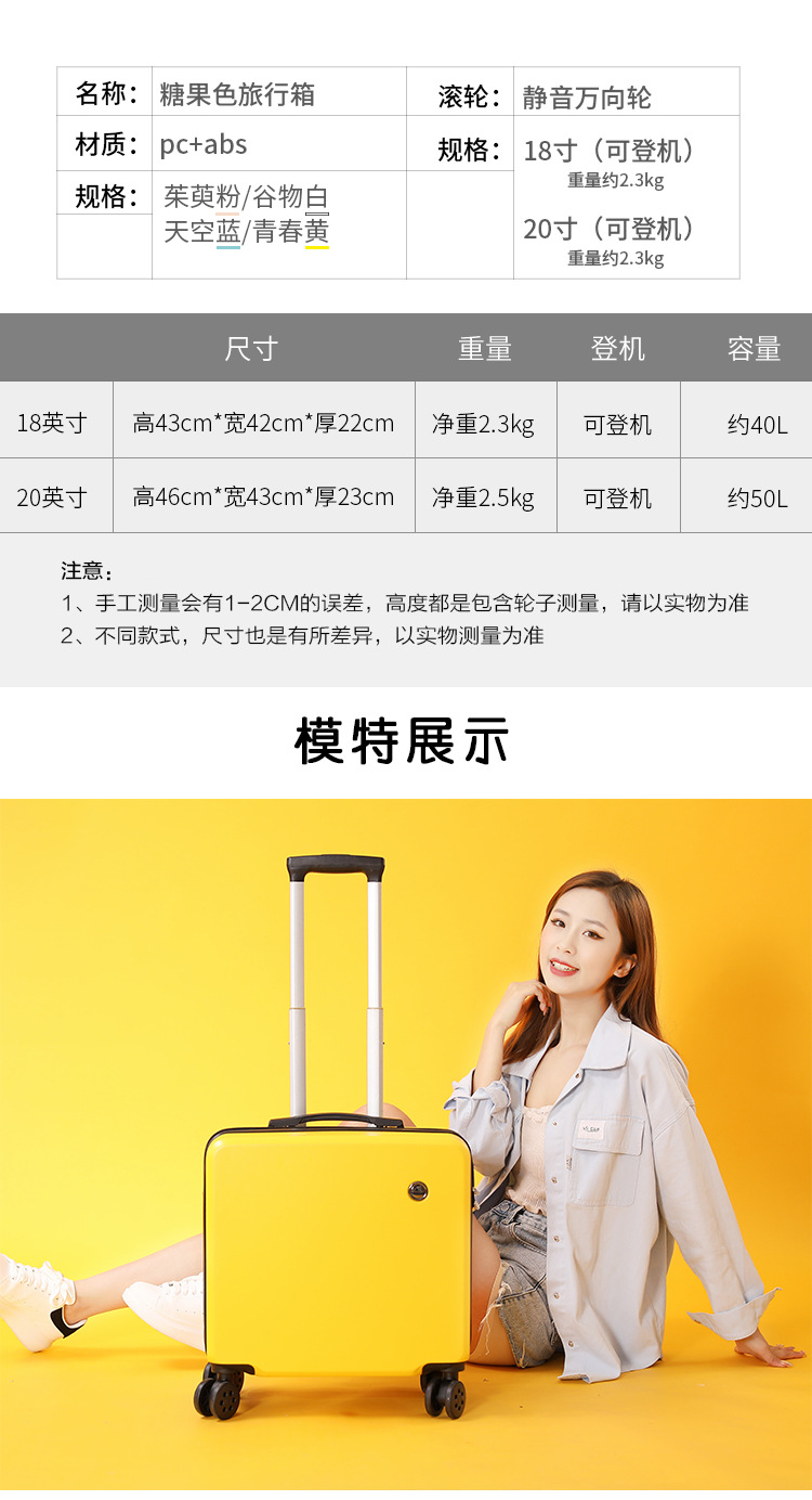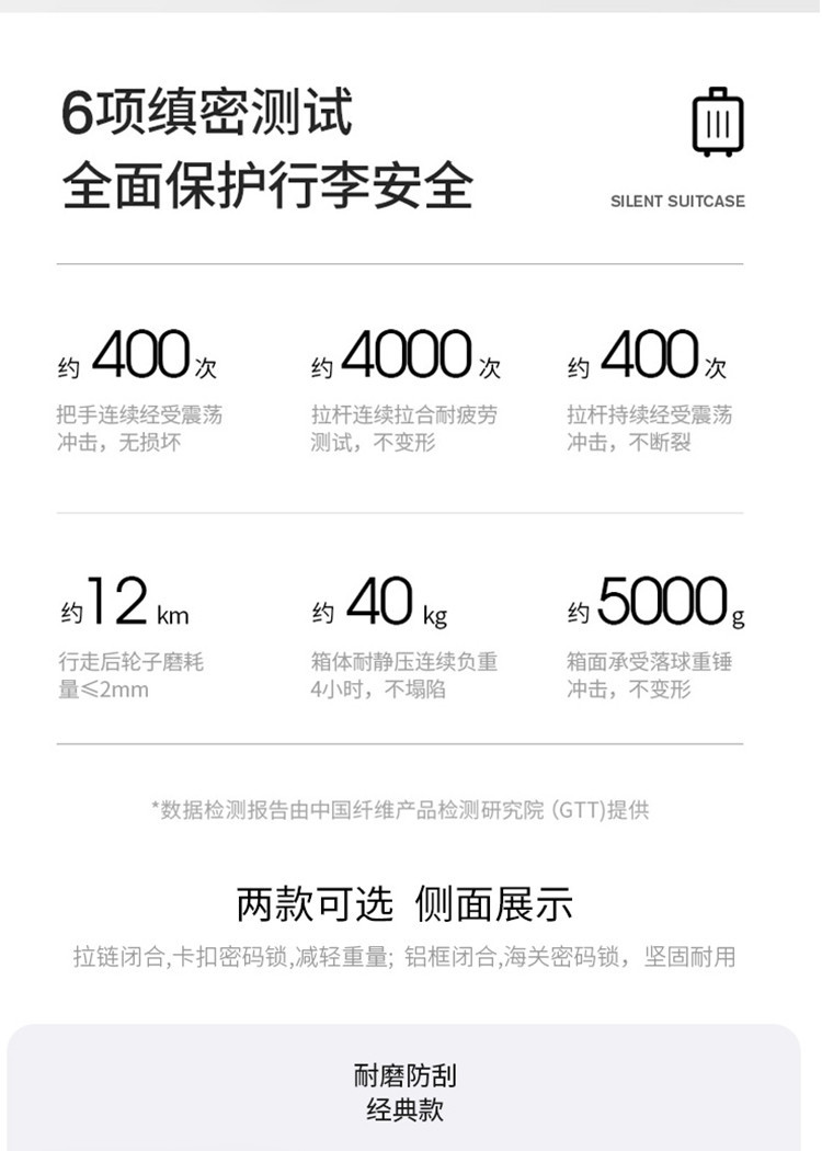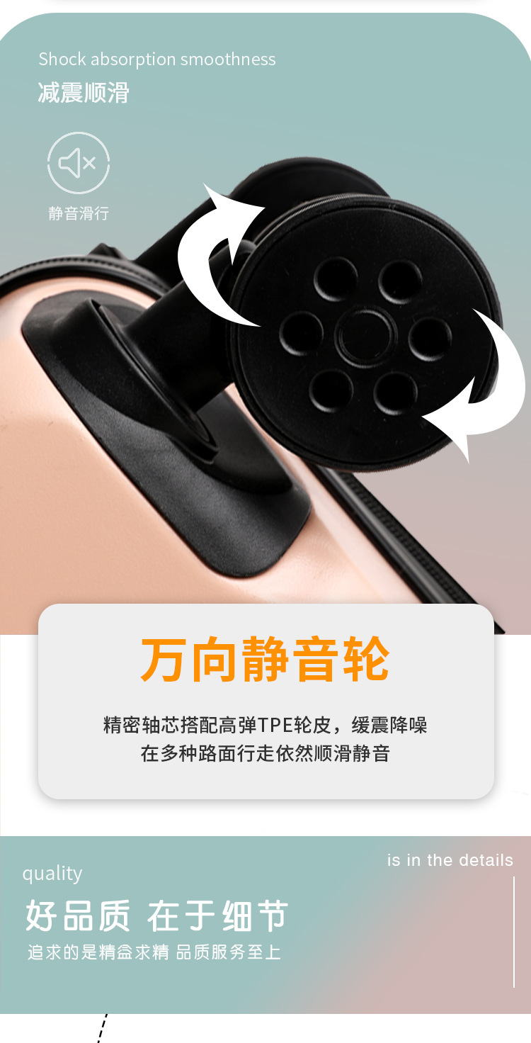 2、我们承诺质量问题:①不满意可以退换 ②买就送(送贴纸两种、箱套一个、一次性压缩毛巾一个、香袋一个。)③凡在我们店买的箱包有质量问题关注了我们即可享受保修1年 ④产品质量:箱体由纯PC航空材料制作,材质特征承载力强(箱体能承受150-180斤),韧性强(箱体凹陷迅速恢复不起白痕),箱子整体轻便,耐用!加上静音轮子更顺滑更舒心【温馨提示】本店宝贝在出仓库前都会经过三道质检才会发出,所以不会有质量问题出库。