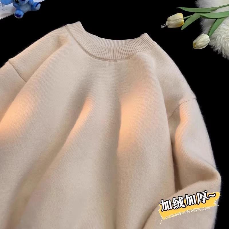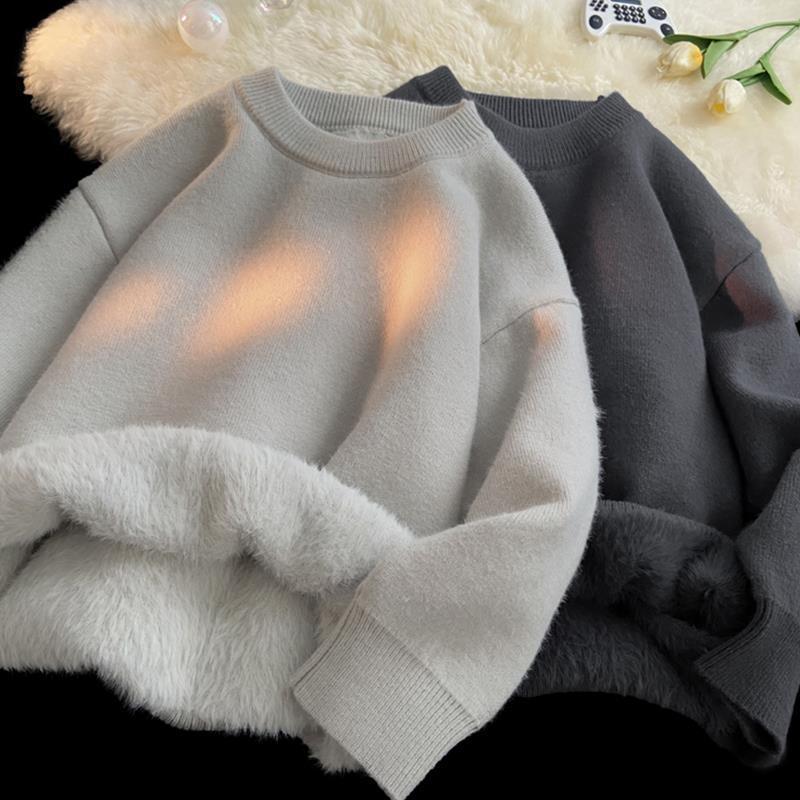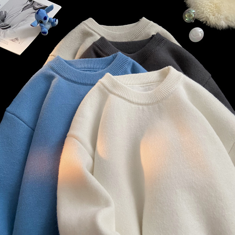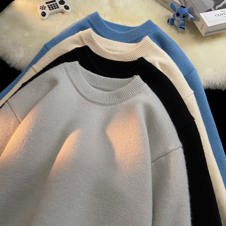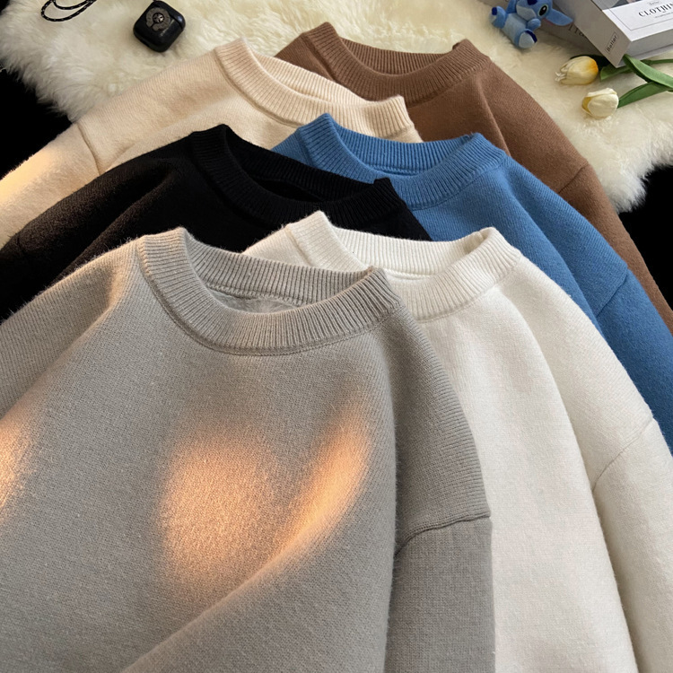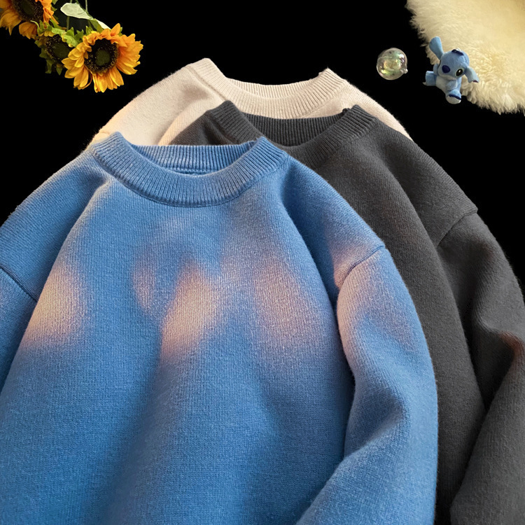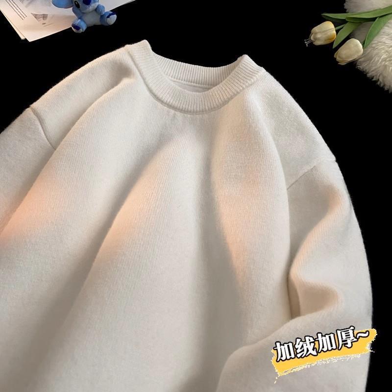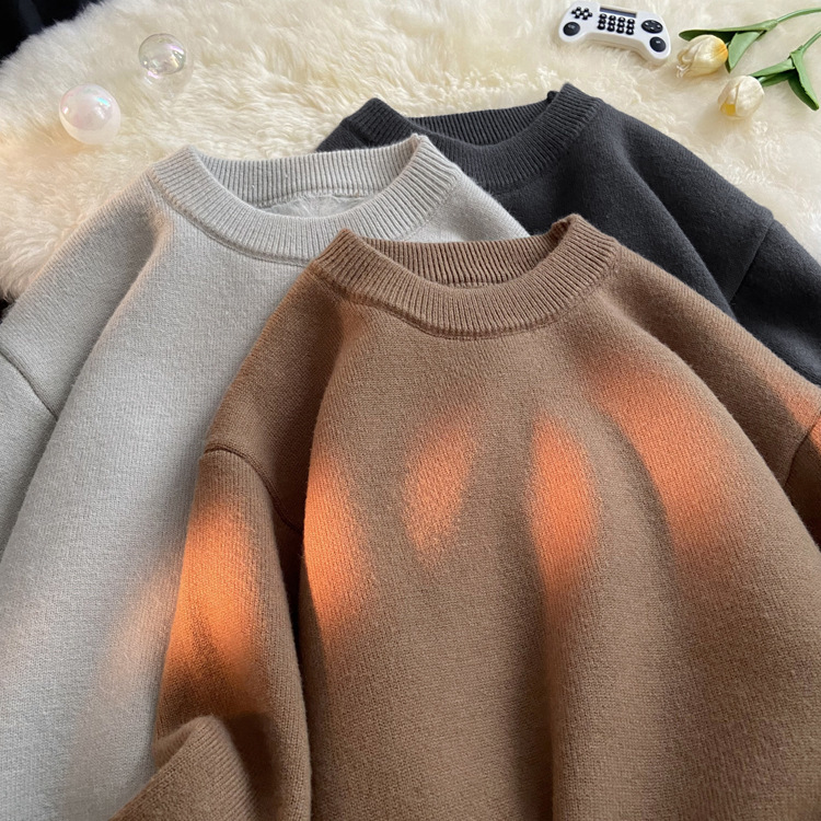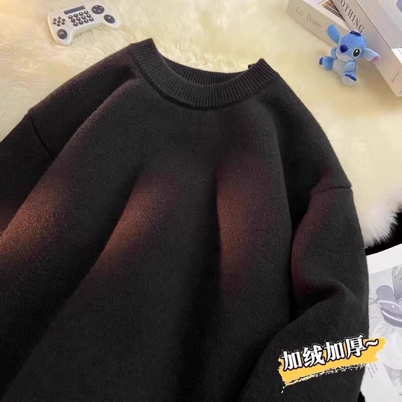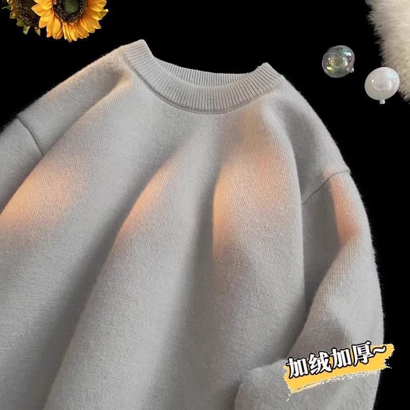 고급 회색 스웨터 남자의 봄 가을과 겨울 기모 두꺼운 미국 스타일 레트로 느슨한 게으른 스타일 둥근 목베이스 니트 스웨터스토어 가기