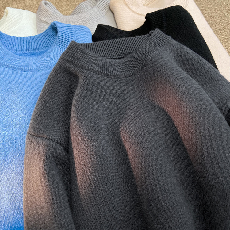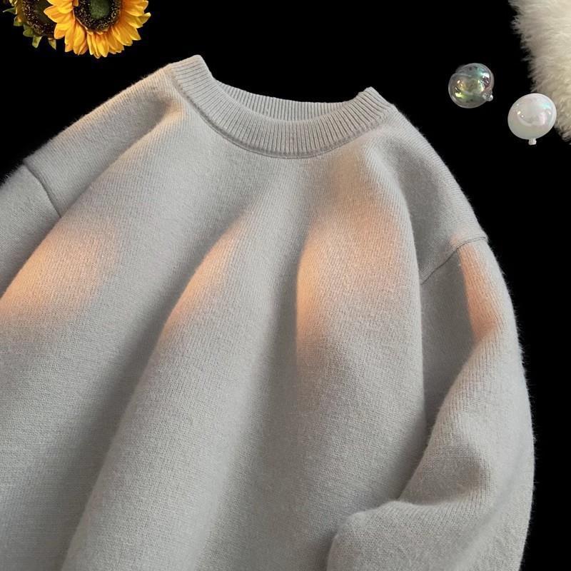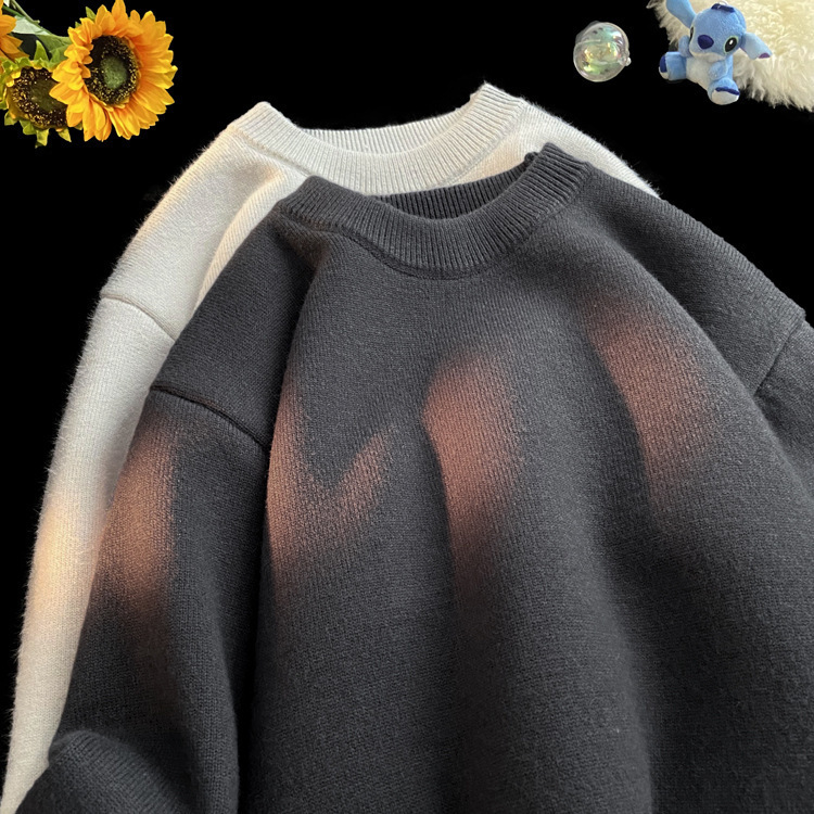 고급 회색 스웨터 남자의 봄 가을과 겨울 기모 두꺼운 미국 스타일 레트로 느슨한 게으른 스타일 둥근 목베이스 니트 스웨터