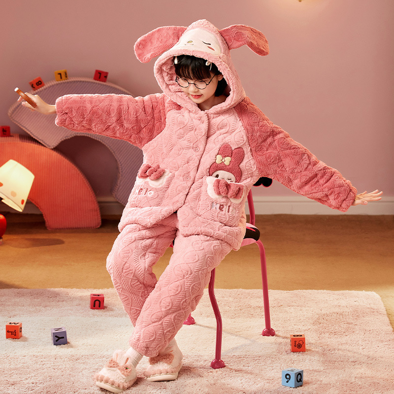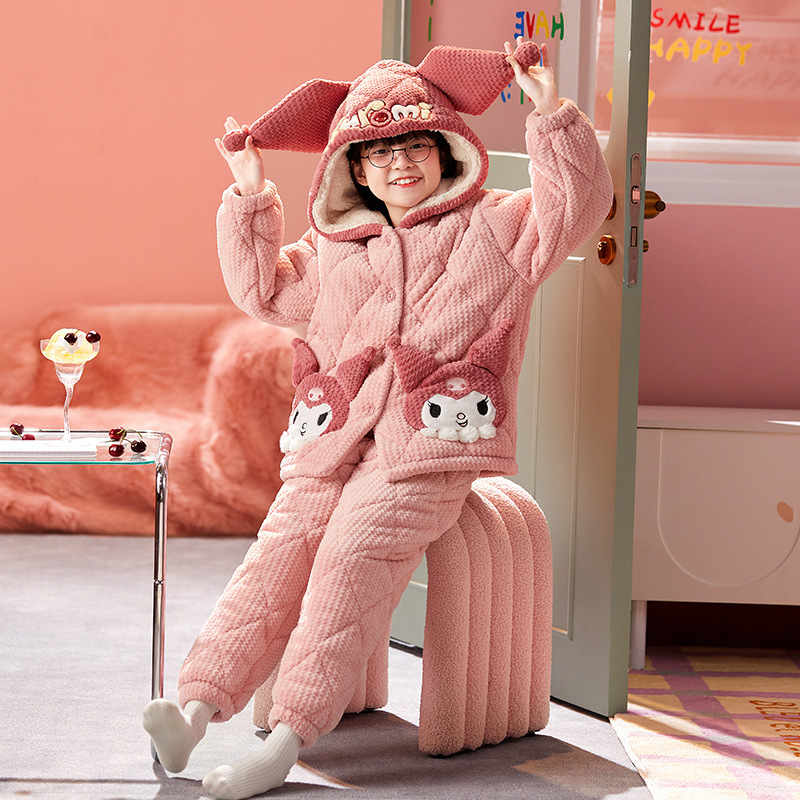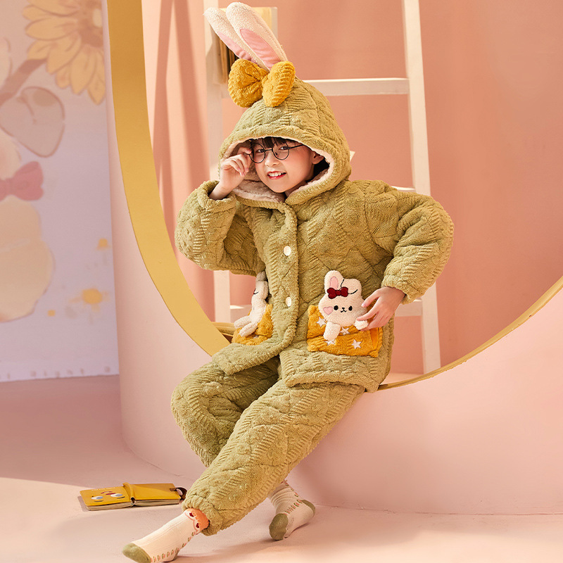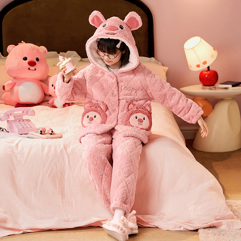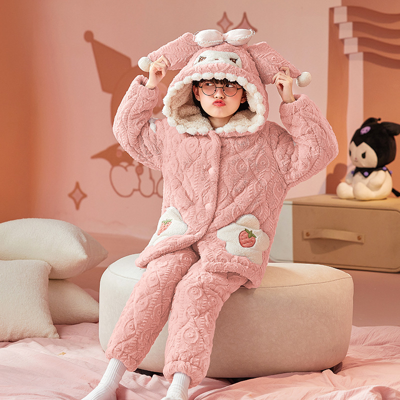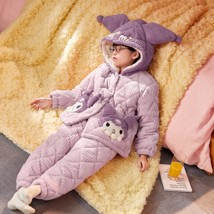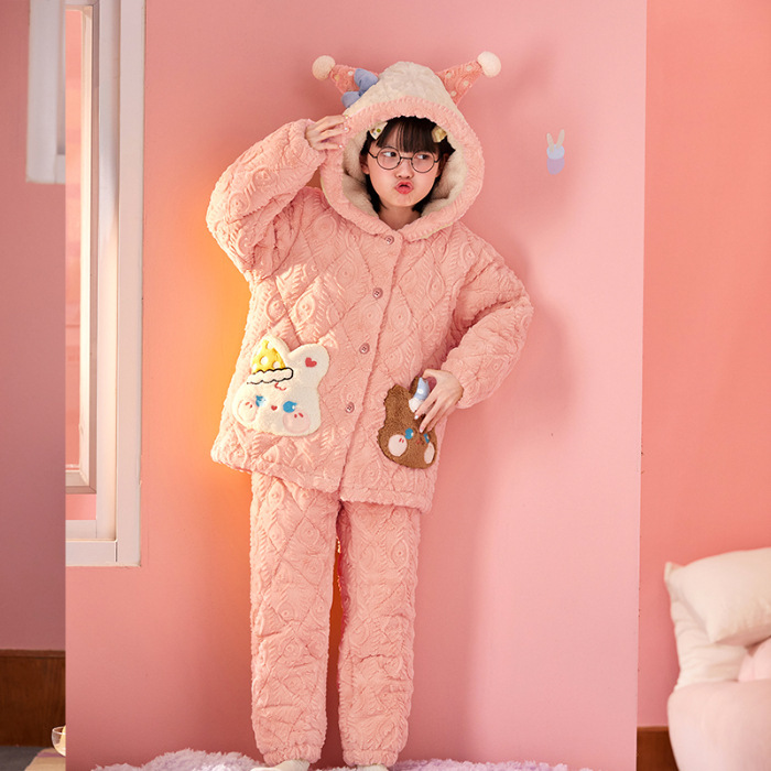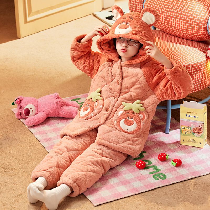 어린이 면 잠옷 소녀 겨울 3 층 두꺼운 중대형 어린이 만화 달콤한 소녀 후드 홈 옷 부모-아이