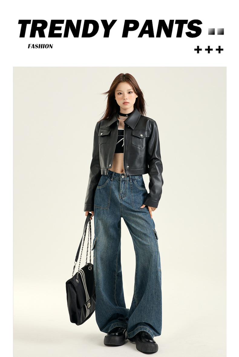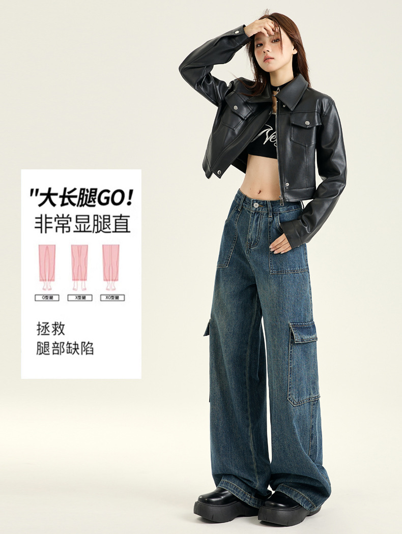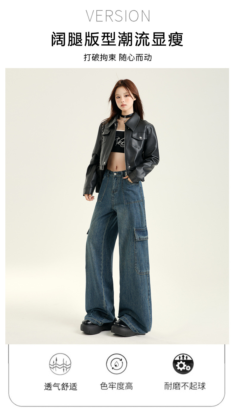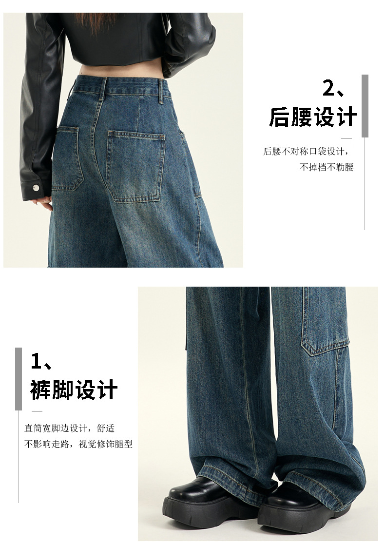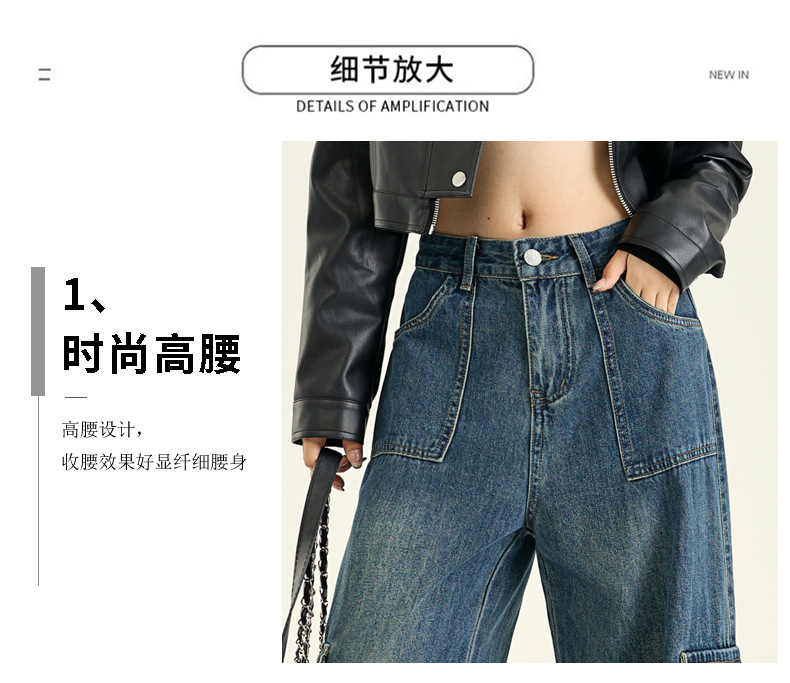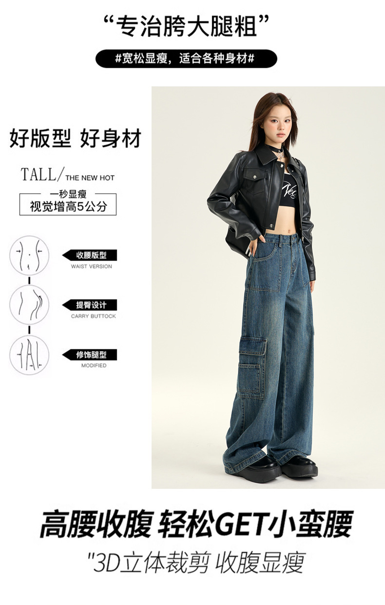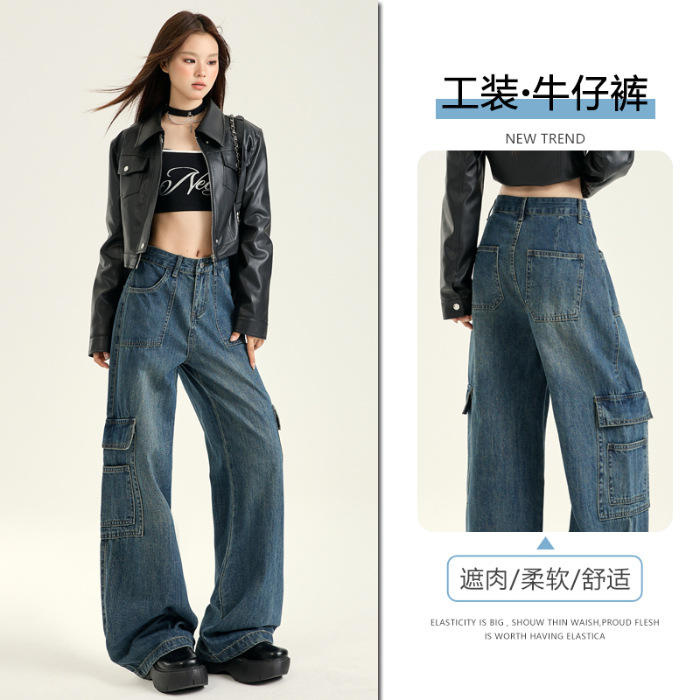 미국 레트로 스파이스 소녀 툴링 데님 여성의 2025 봄 새로운 높은 허리 슬리밍 디자인 센스 와이드 다리 바지