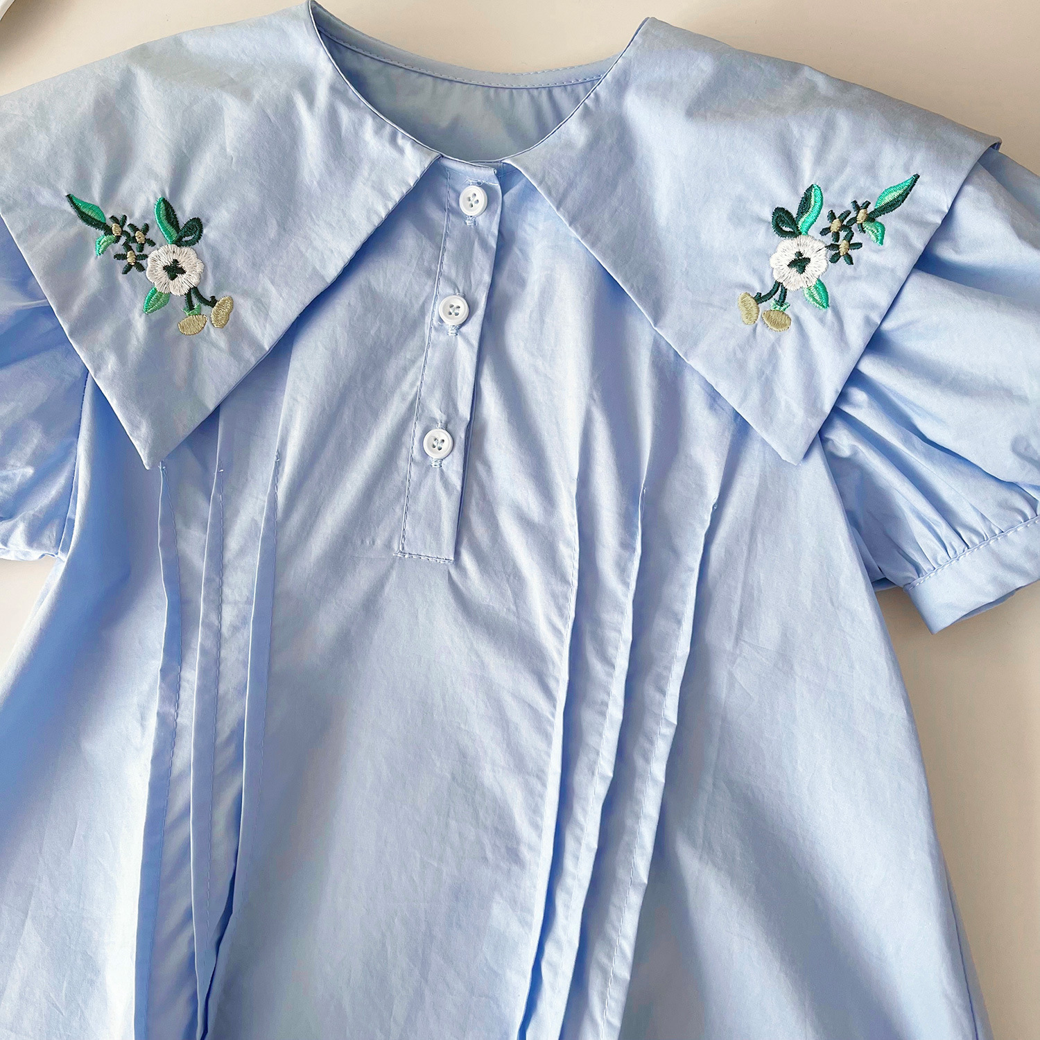 2024 여름 새로운 한국 스타일 소녀의 자수 옷깃 원피스 소녀의 짧은 소매 귀여운 어린이 원피스 트렌디스토어 가기