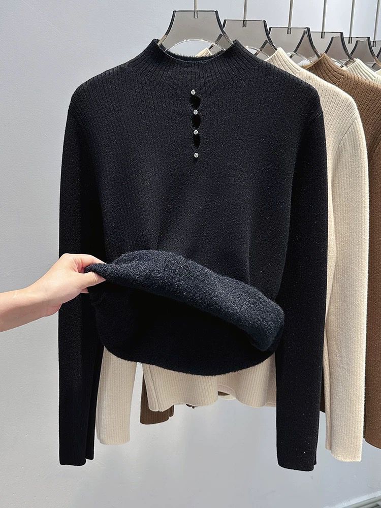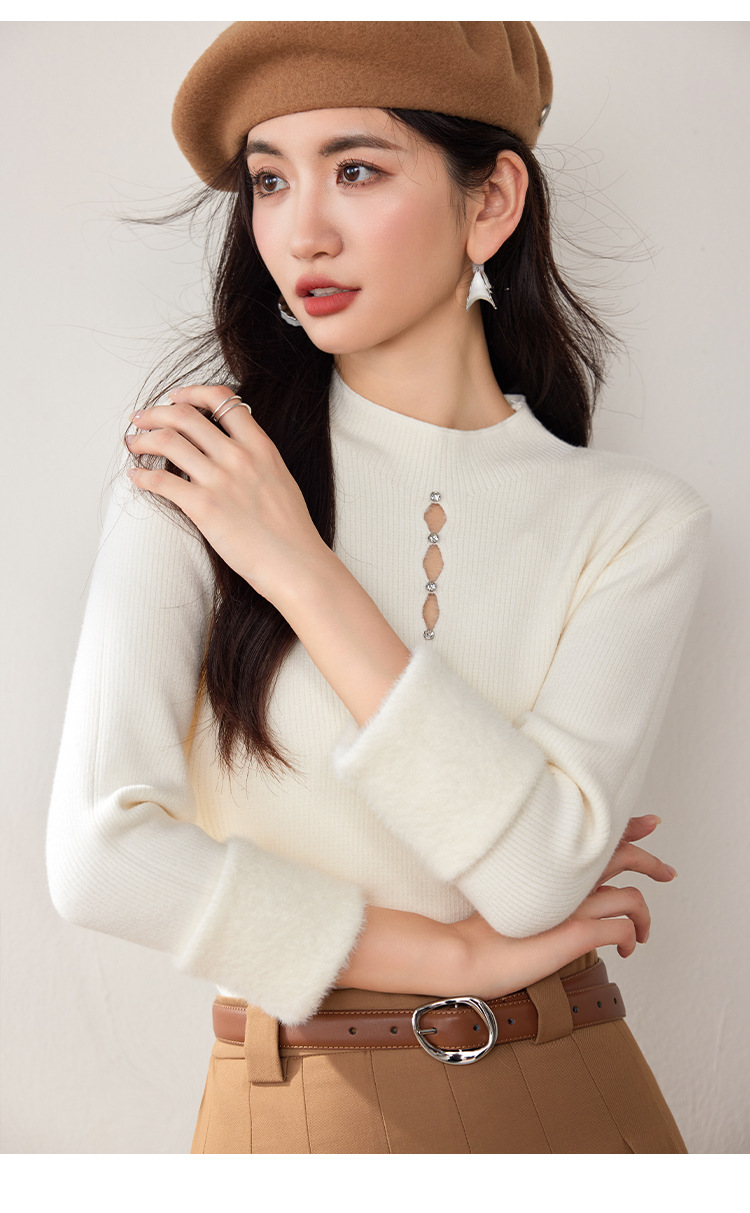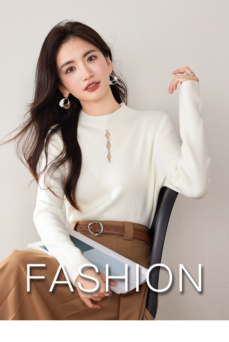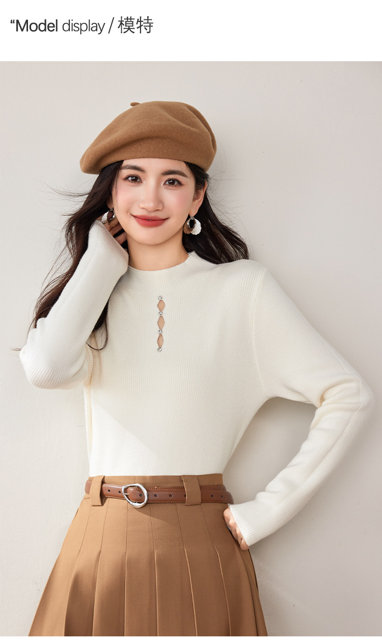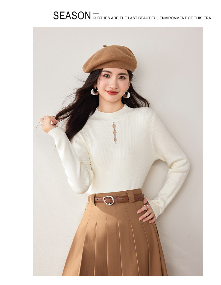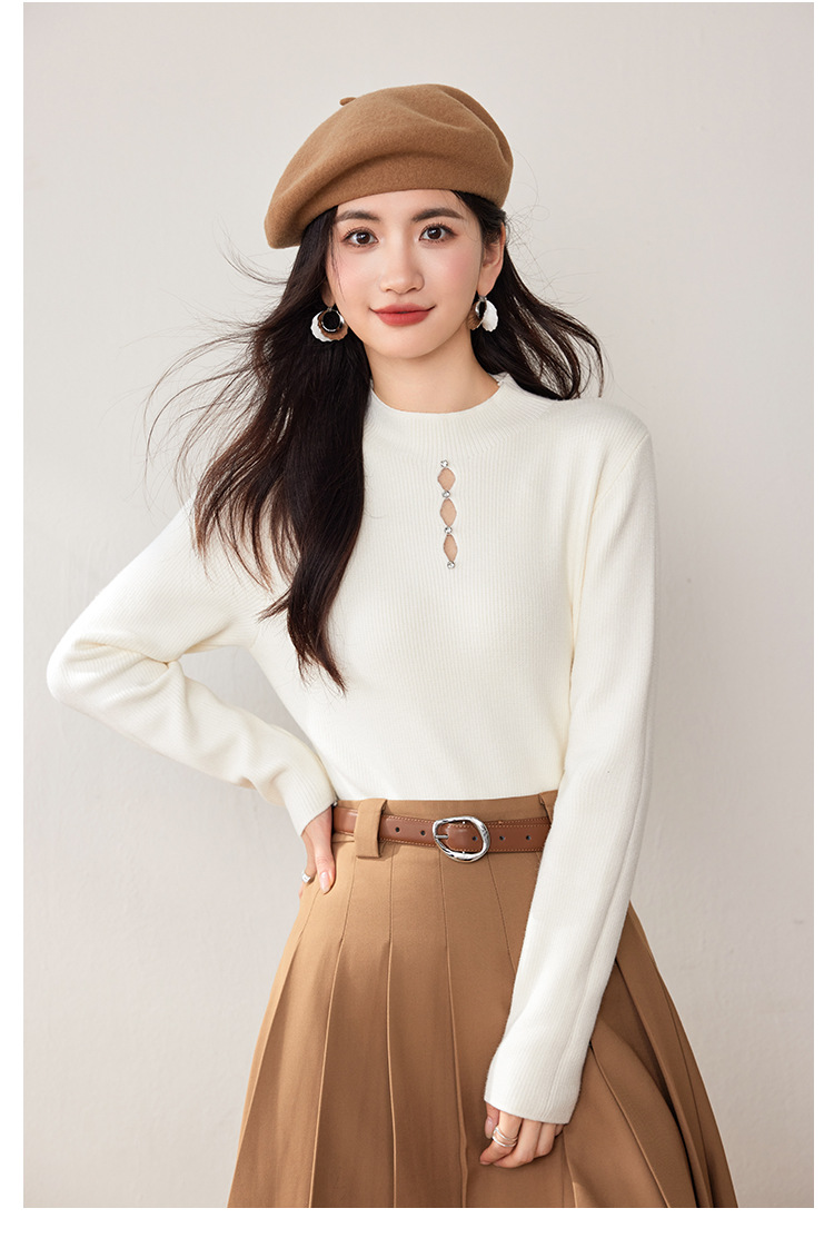 2024 년 가을과 겨울 새로운 프랑스 스타일 우아한 슬리밍 진주 버클 여성용 양모 니트 베이스 셔츠와 세미 하이 칼라 풀오버스토어 가기