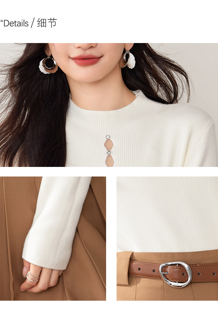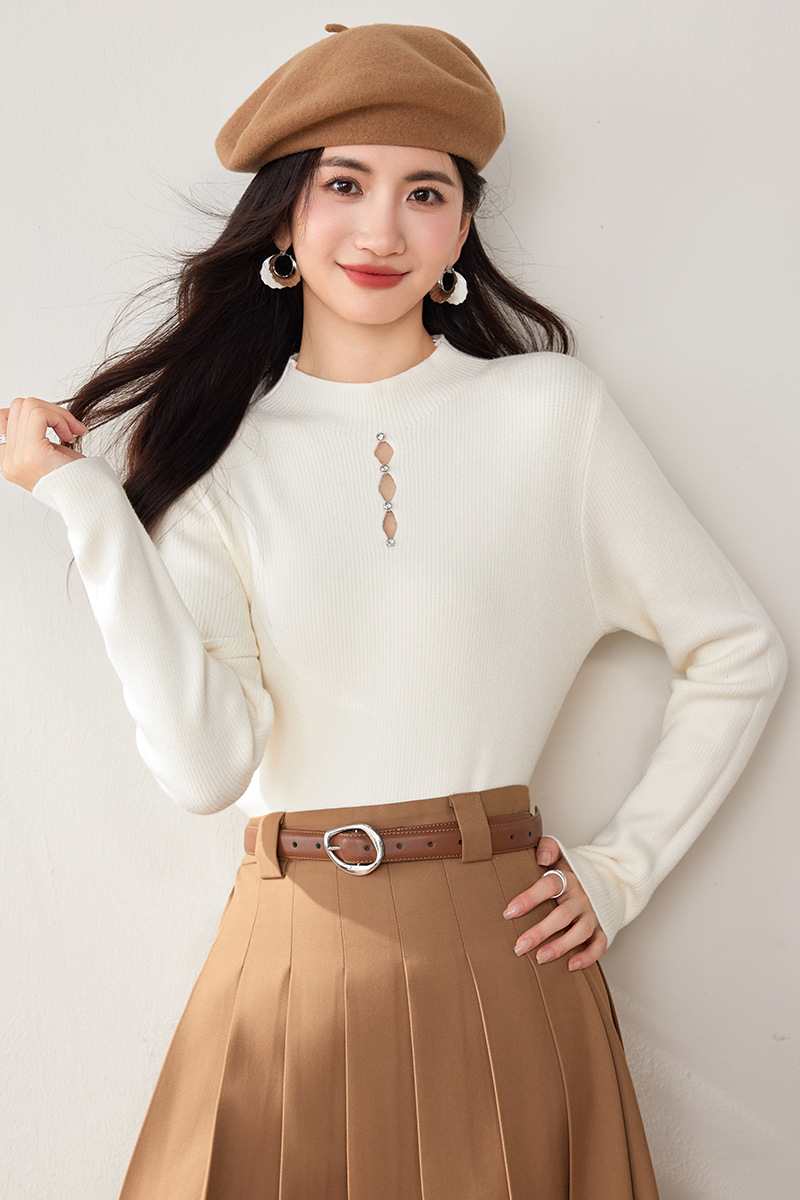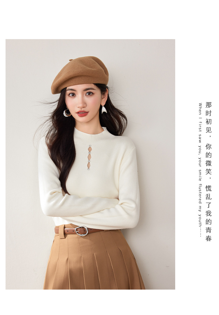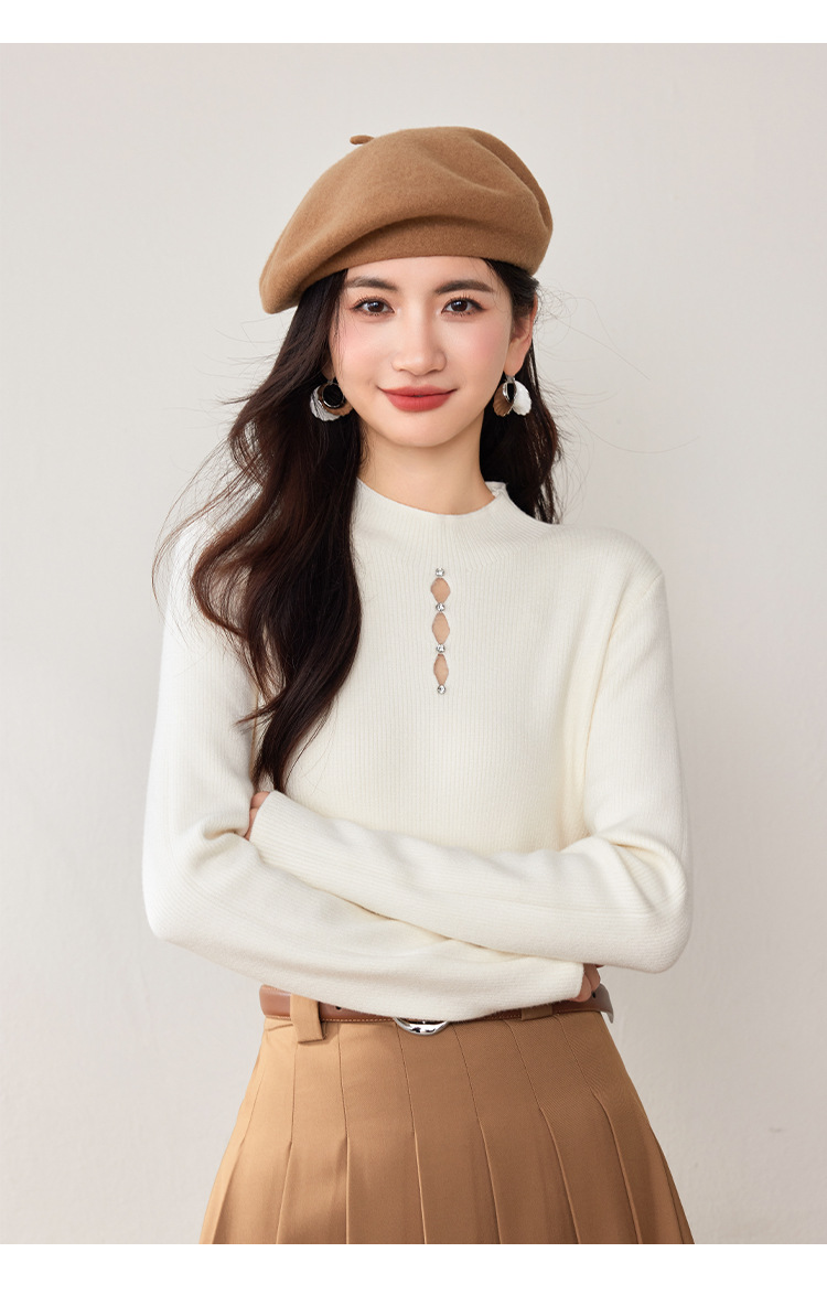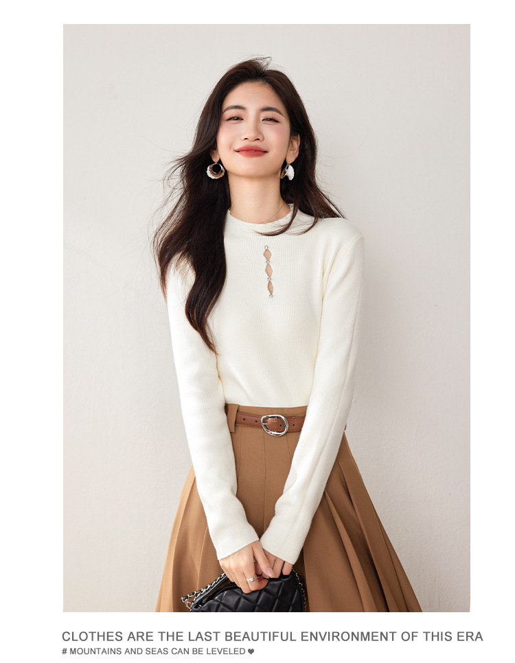 2024 년 가을과 겨울 새로운 프랑스 스타일 우아한 슬리밍 진주 버클 여성용 양모 니트 베이스 셔츠와 세미 하이 칼라 풀오버
