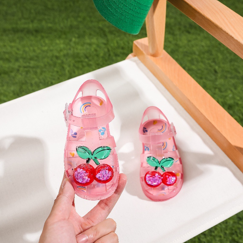 2025 새로운 여름 어린이 젤리 샌들 소녀 아기 너드 비치 신발 미끄럼 방지 Baotou 소프트 하단 크리스탈 신발