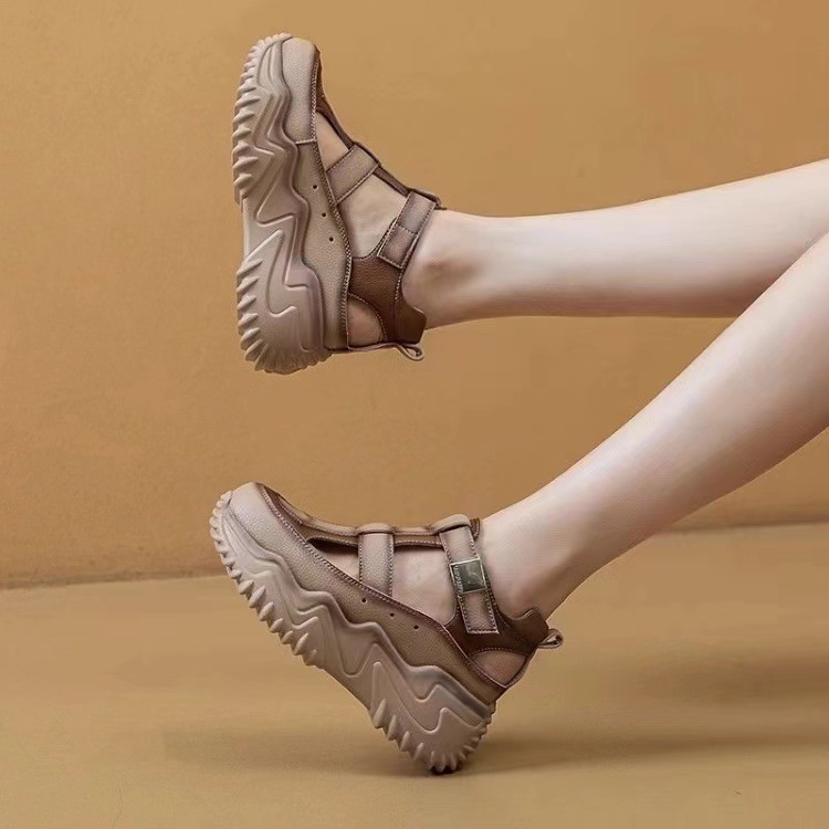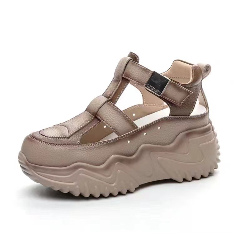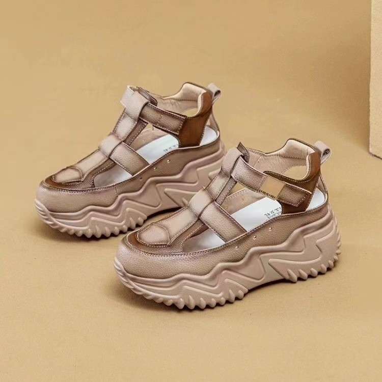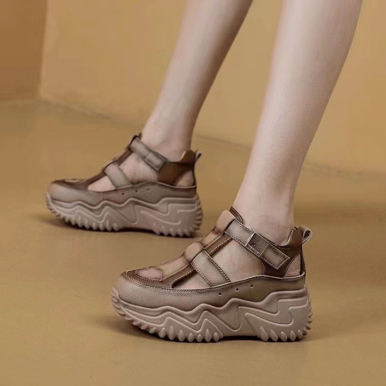 대외 무역 진짜 부드러운 가죽 샌들 여자 여름 두꺼운 밑창 플랫폼 올매치 증가 통기성 중공 캐주얼 신발 여성 패션 새로운 스타일