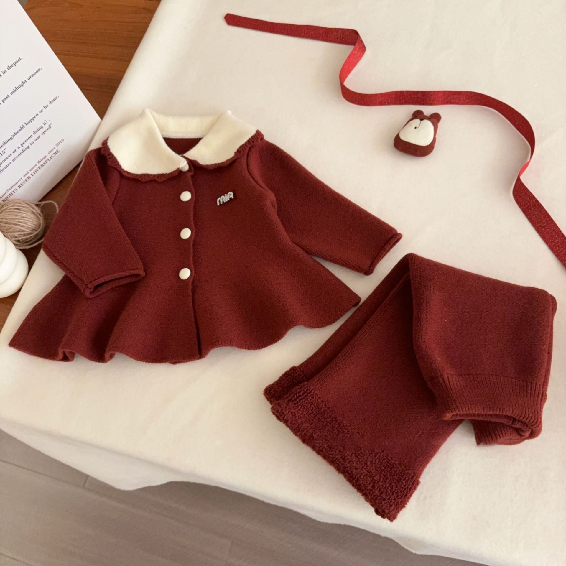 여자 스웨터 2024 겨울 새로운 단색 옷깃 귀여운 바지 2 피스 니트 년 머리카락