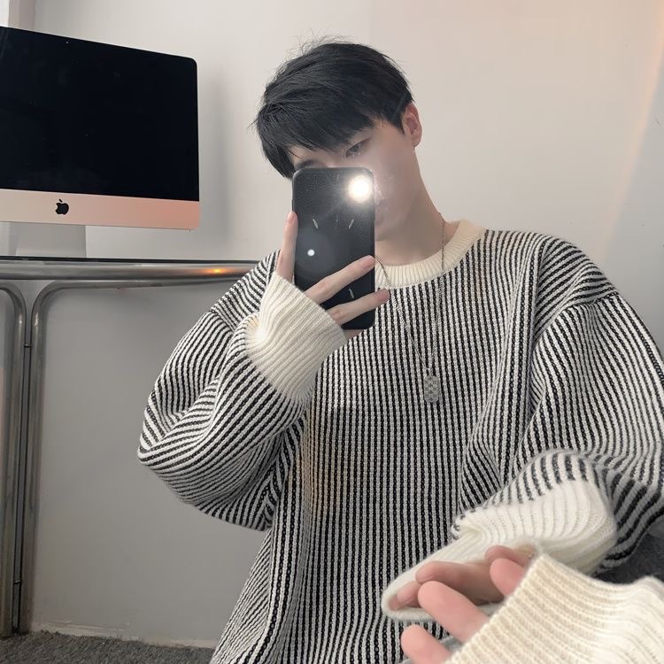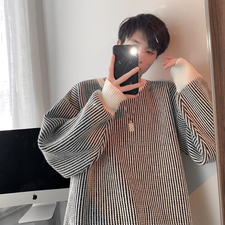 가을과 겨울 한국 스웨터 남자 두꺼운 트렌디 라운드 넥 스웨터 게으른 일본 줄무늬 커플 스웨터 재킷스토어 가기