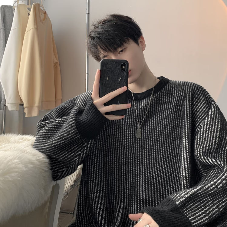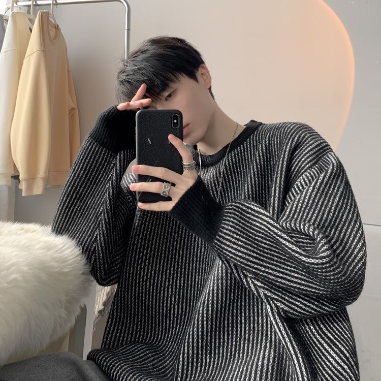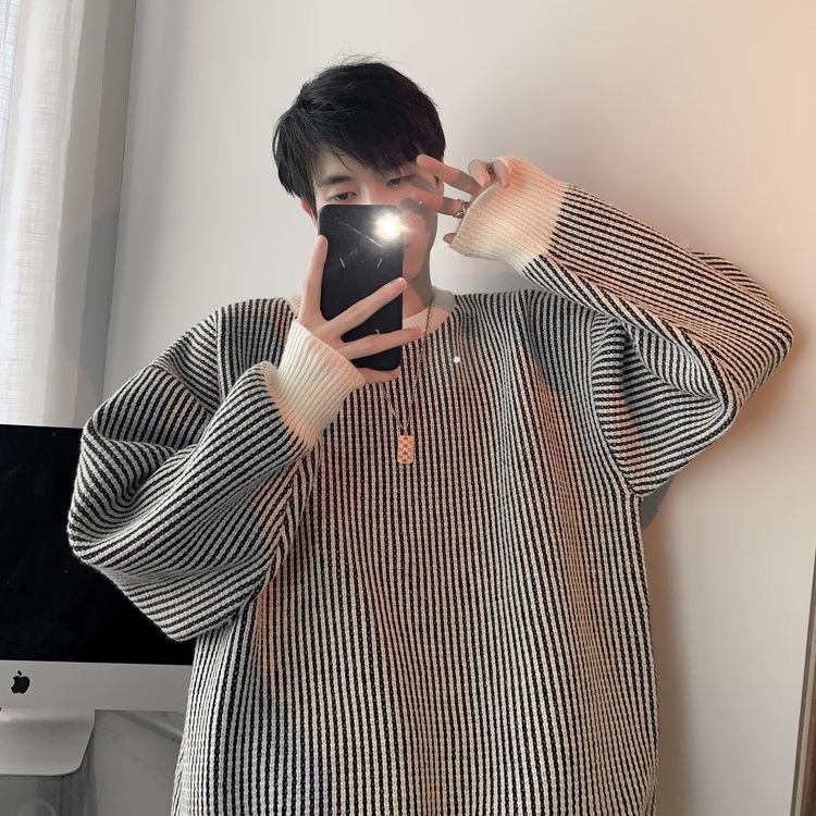 가을과 겨울 한국 스웨터 남자 두꺼운 트렌디 라운드 넥 스웨터 게으른 일본 줄무늬 커플 스웨터 재킷