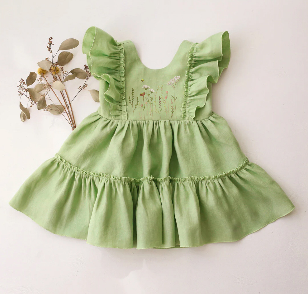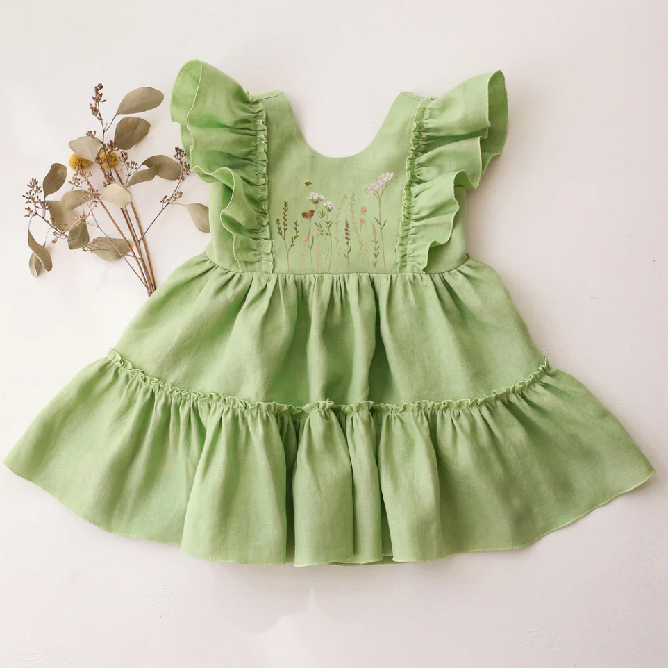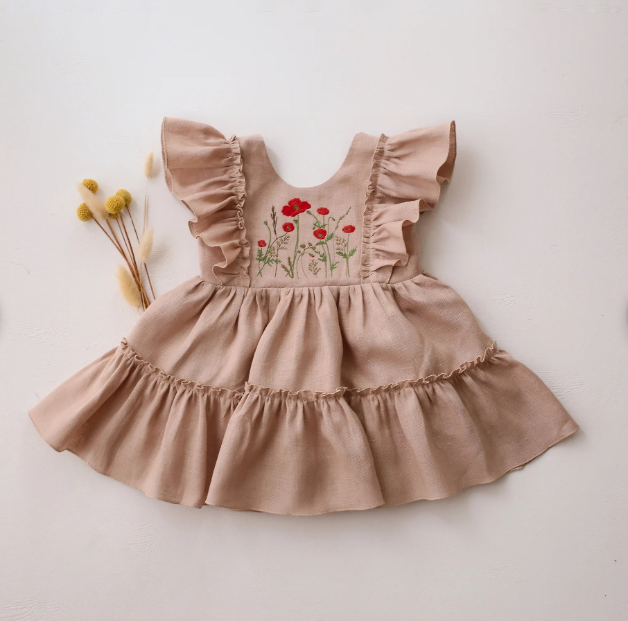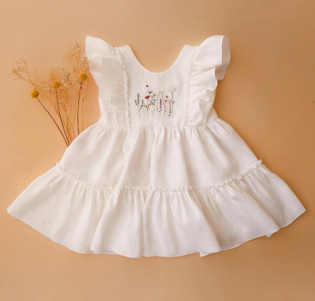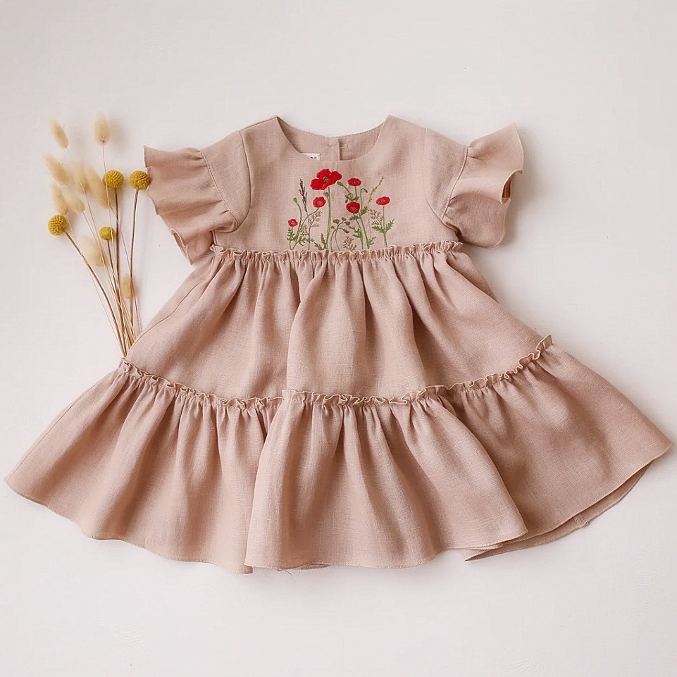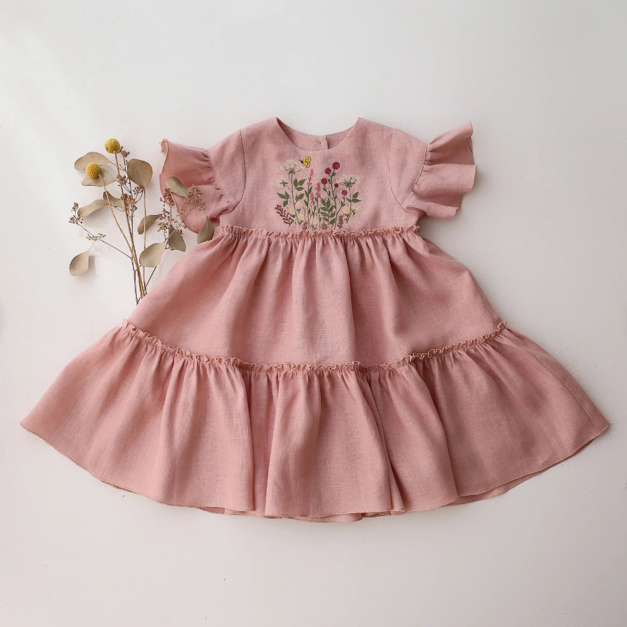 여름 2025 소녀 비행 소매 자수 작은 꽃 목가적 인 신선한 스타일 면화와 리넨 케이크 원피스 Hayi Ins