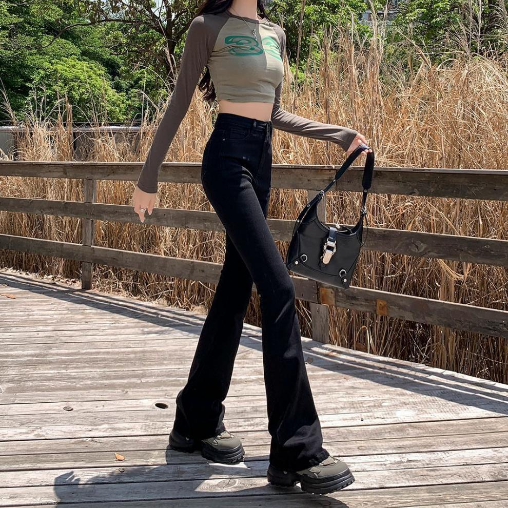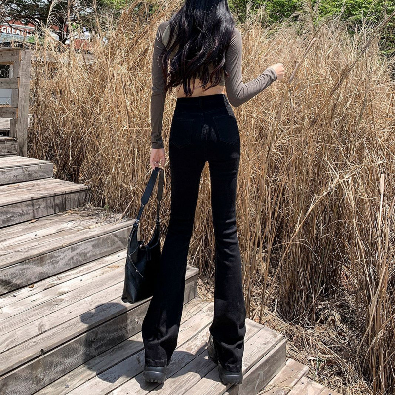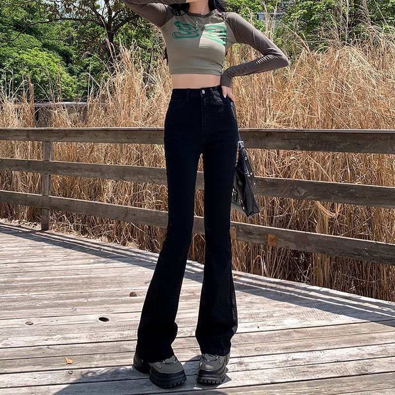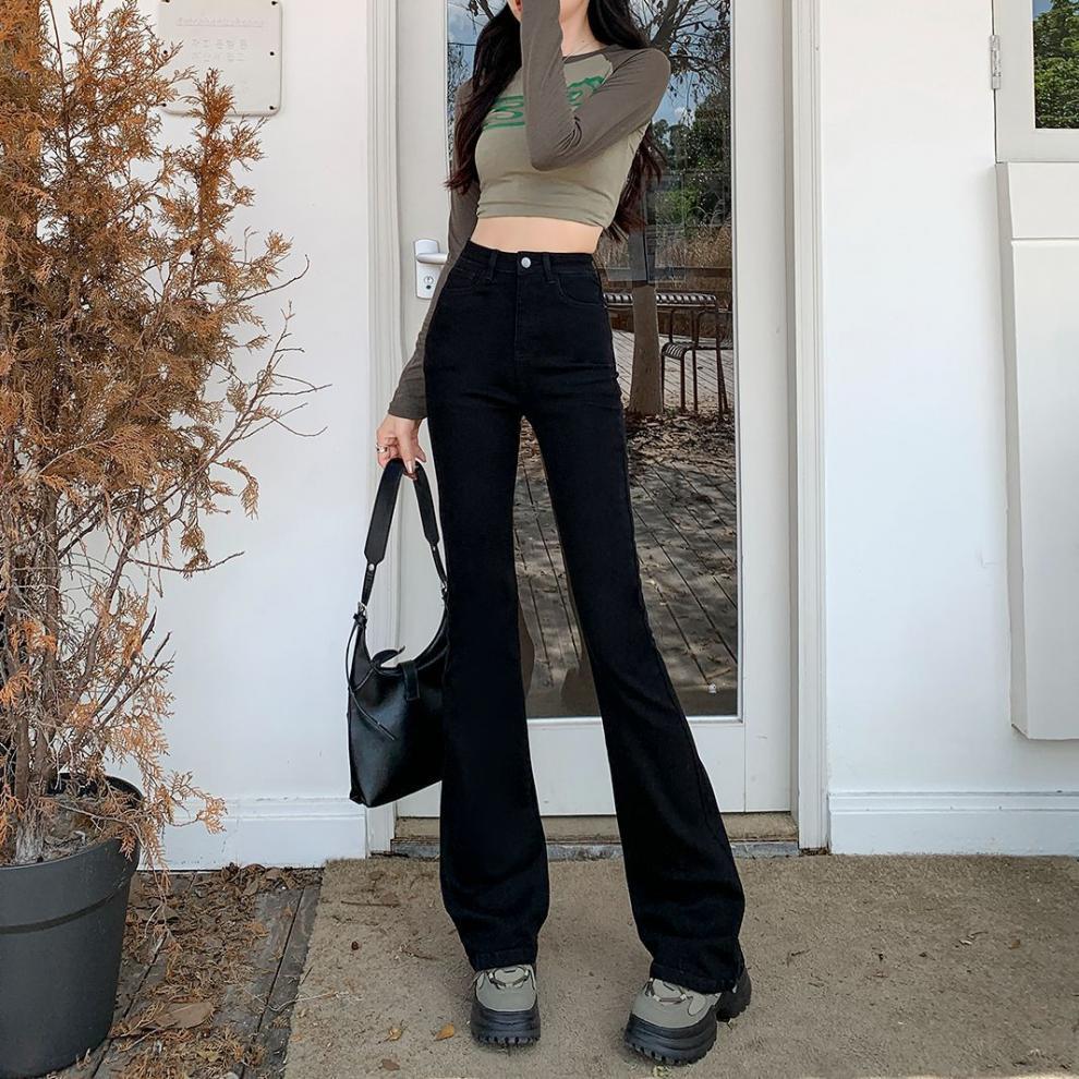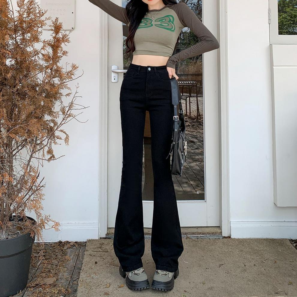 2024 기모 블랙 데님 바지 여성 하이 허리 슬림 룩 키가 큰 슬림-올핏 매치 스트레치 트렌디 한 말굽 바지스토어 가기