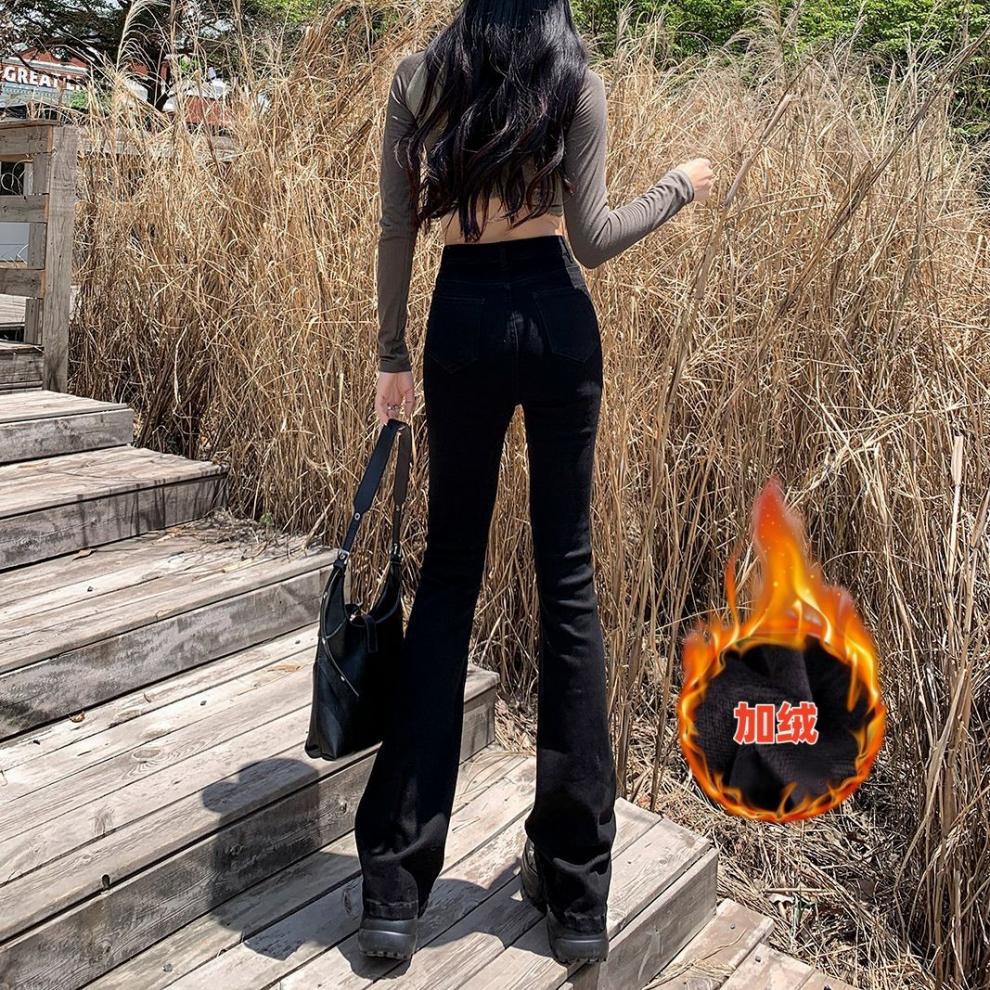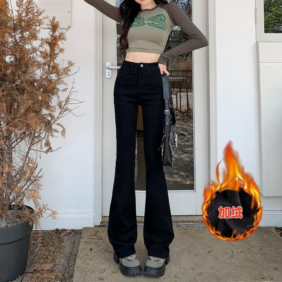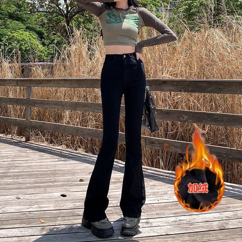 2024 기모 블랙 데님 바지 여성 하이 허리 슬림 룩 키가 큰 슬림-올핏 매치 스트레치 트렌디 한 말굽 바지