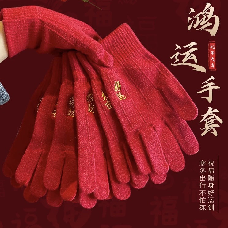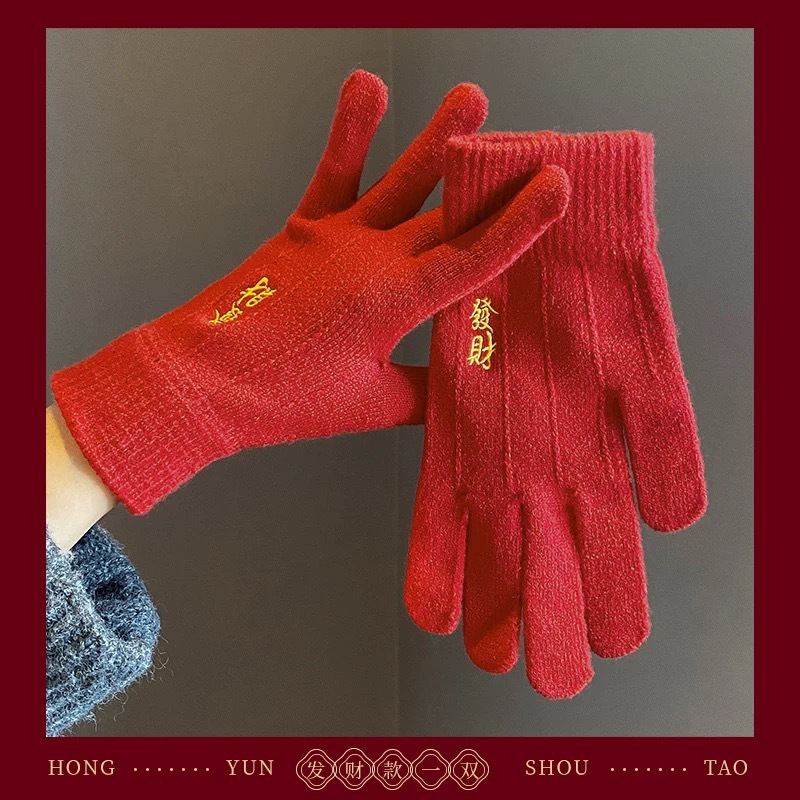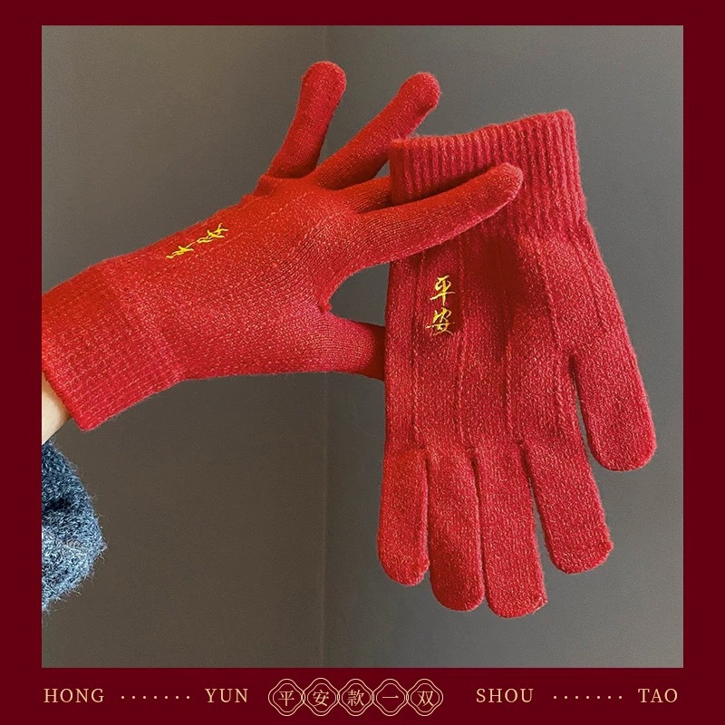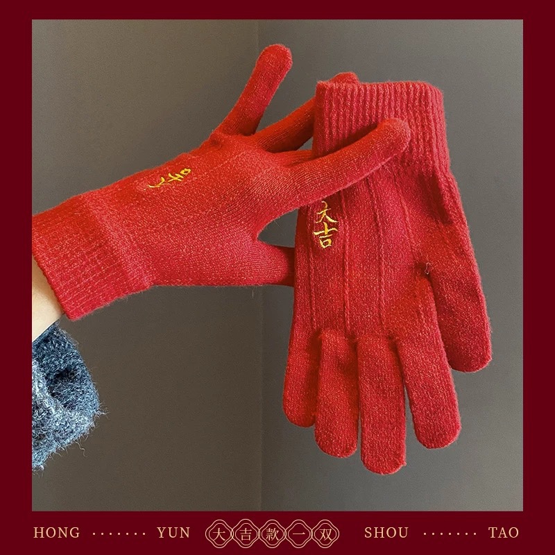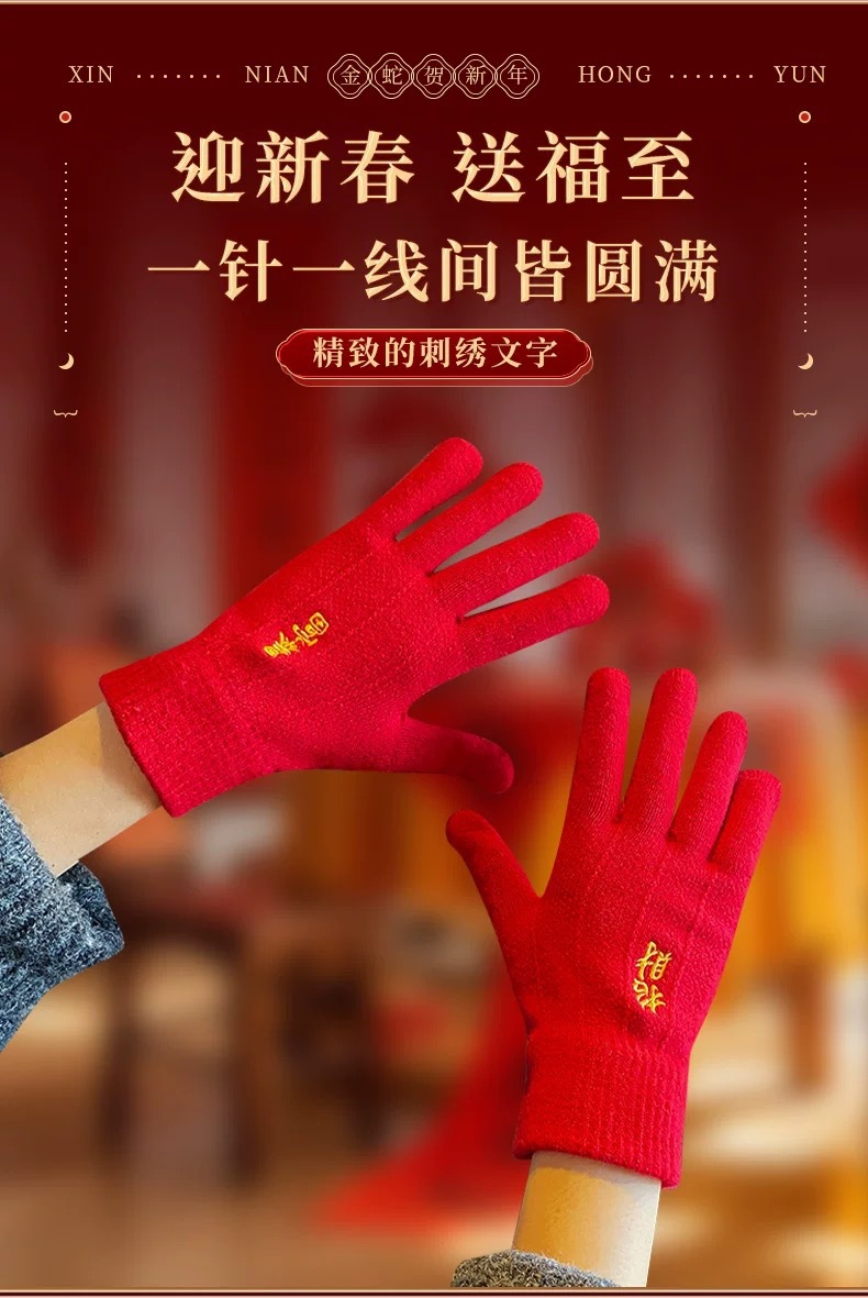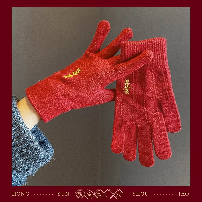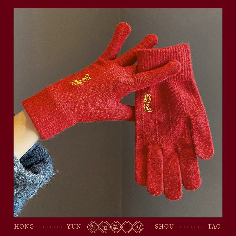 새해 크리스마스 레드 자수 니트 울 장갑 여성의 겨울 손가락 따뜻한 두꺼운 리치 터치 스크린 장갑
